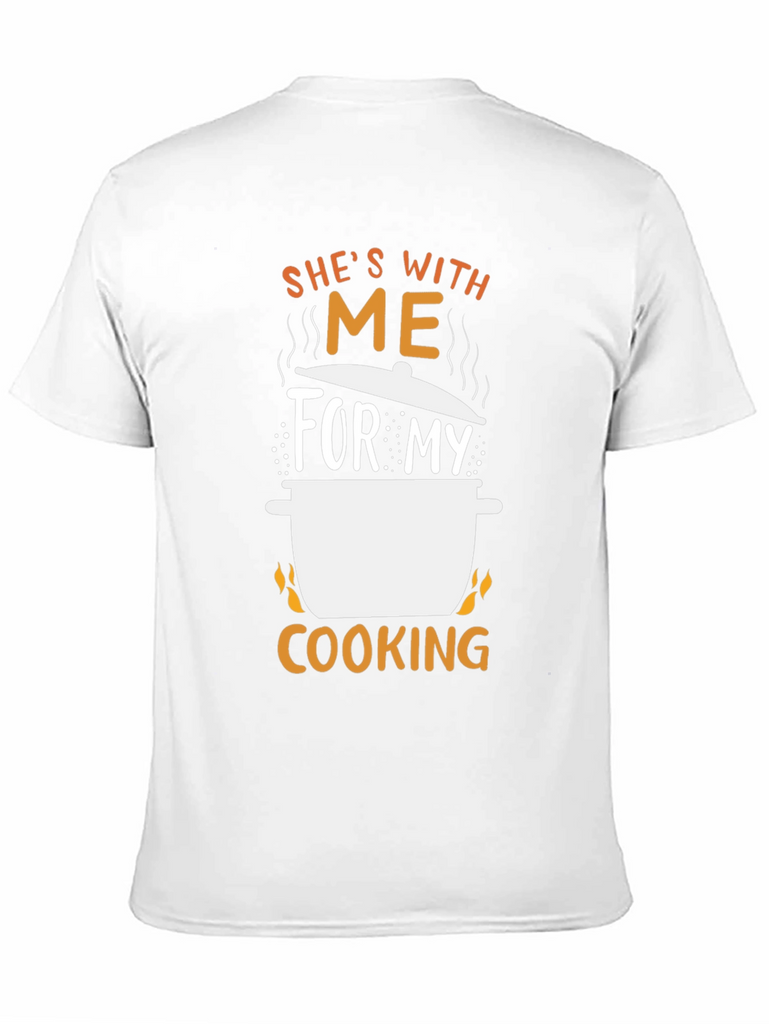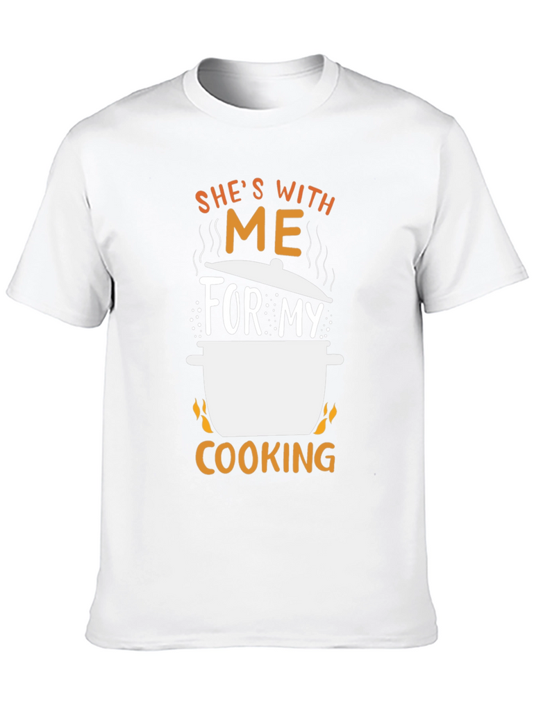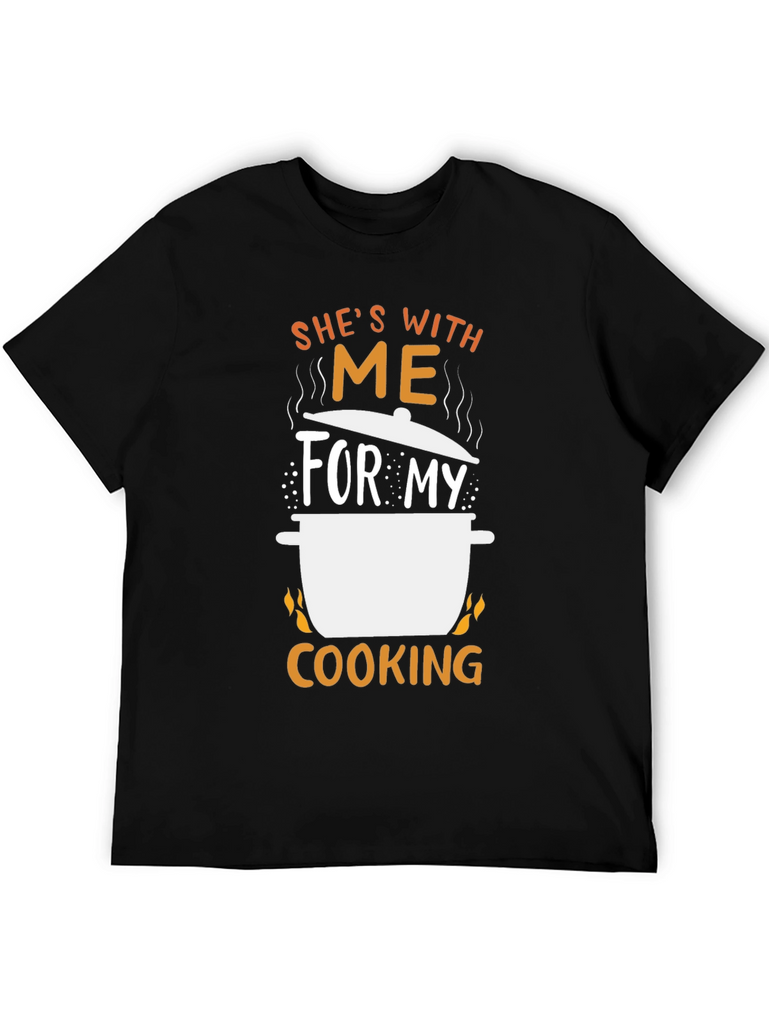 Show off your culinary passion with this fun and quirky t-shirt! The design features a graphic of a steaming cooking pot, with the playful text "She's With Me For My Cooking". The t-shirt itself is black and appears to be made of a soft, comfortable fabric. The bold white and orange colors of the graphic are eye-catching and sure to spark conversation. Perfect for casual wear, cooking enthusiasts, or as a humorous gift for the chef in your life. Get ready to turn up the heat in the kitchen and in style!