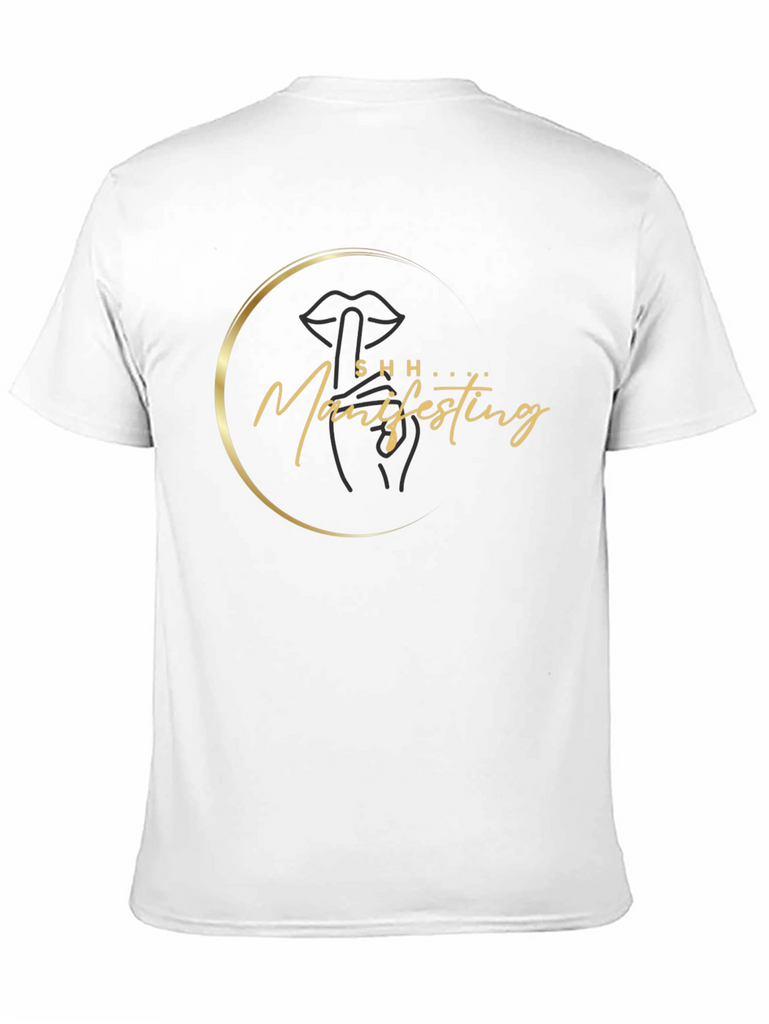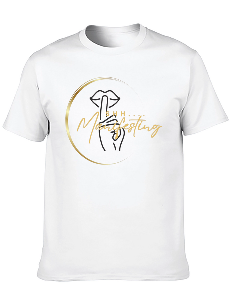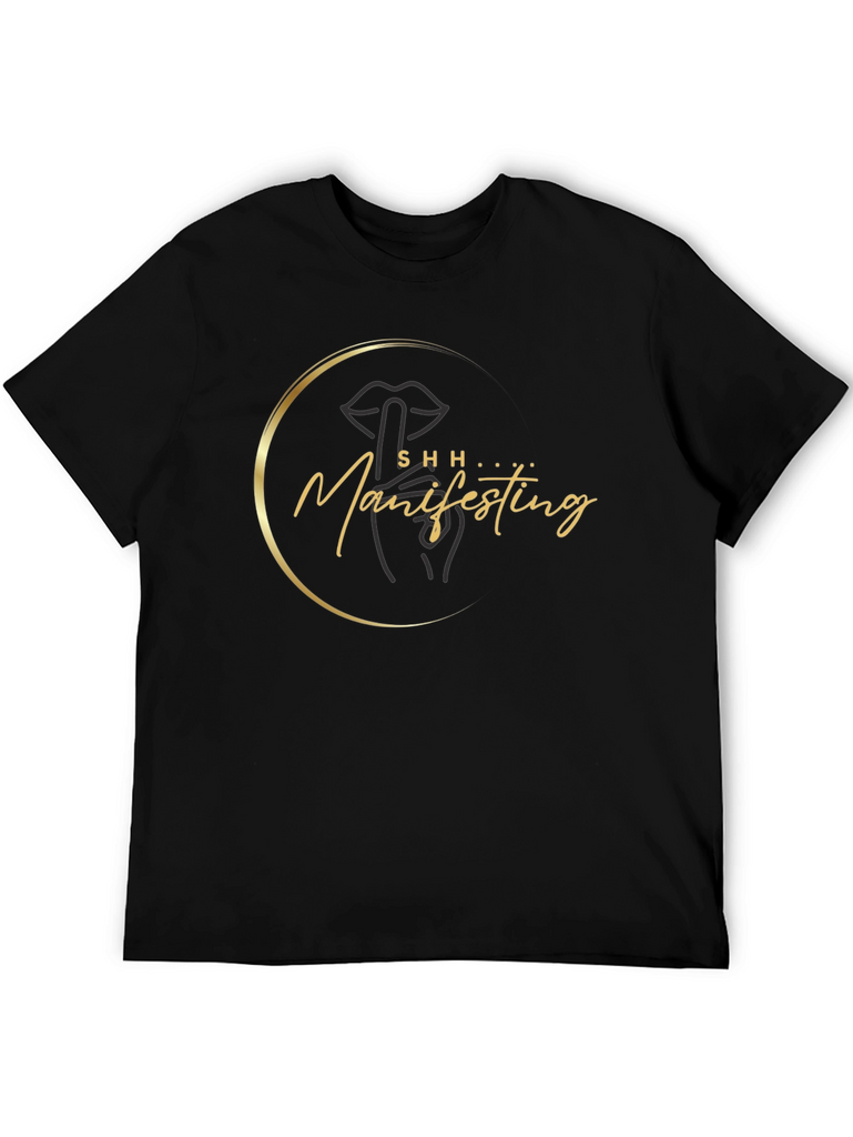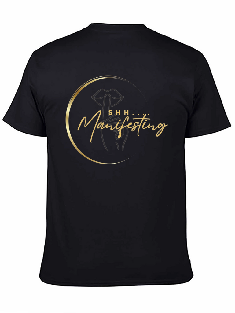 Make a statement with this stylish black t-shirt featuring a unique "Shh Manifesting" design. The graphic includes an abstract lip and hand in a golden circle. Made from comfortable and durable material, this tee is perfect for everyday wear. The short-sleeved design makes it ideal for warmer weather or layering under jackets. Whether you're manifesting your dreams or simply looking to add a touch of personality to your wardrobe, this t-shirt is a must-have. It's a great conversation starter and a fashionable way to express your individuality. This tee is a unique addition to any wardrobe.
