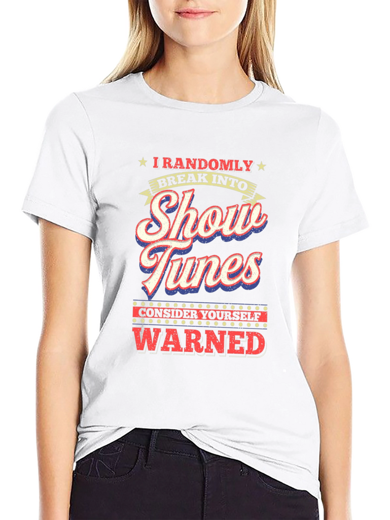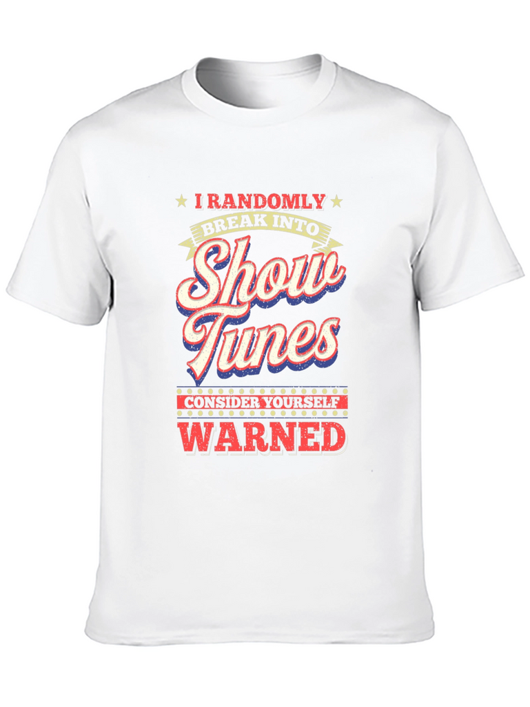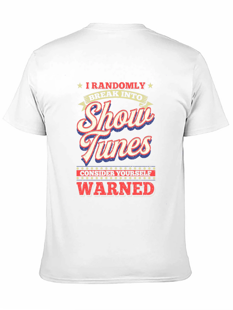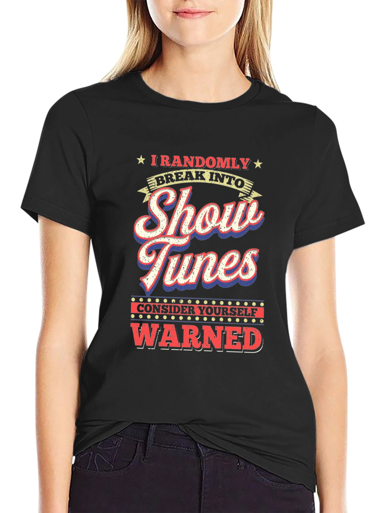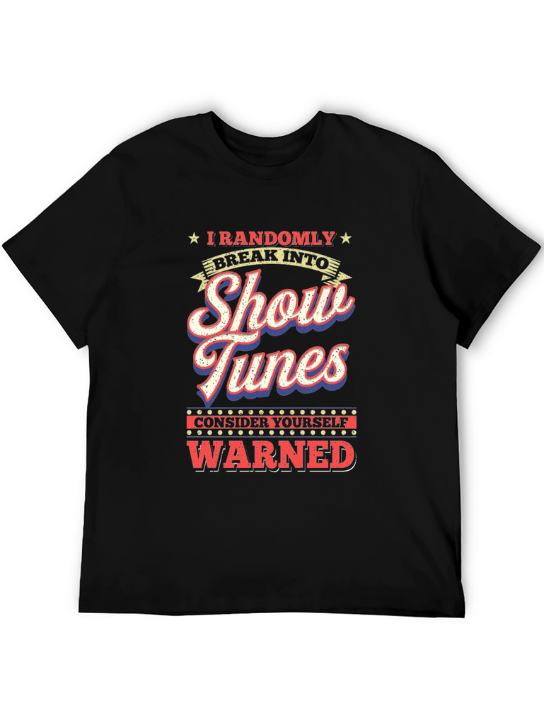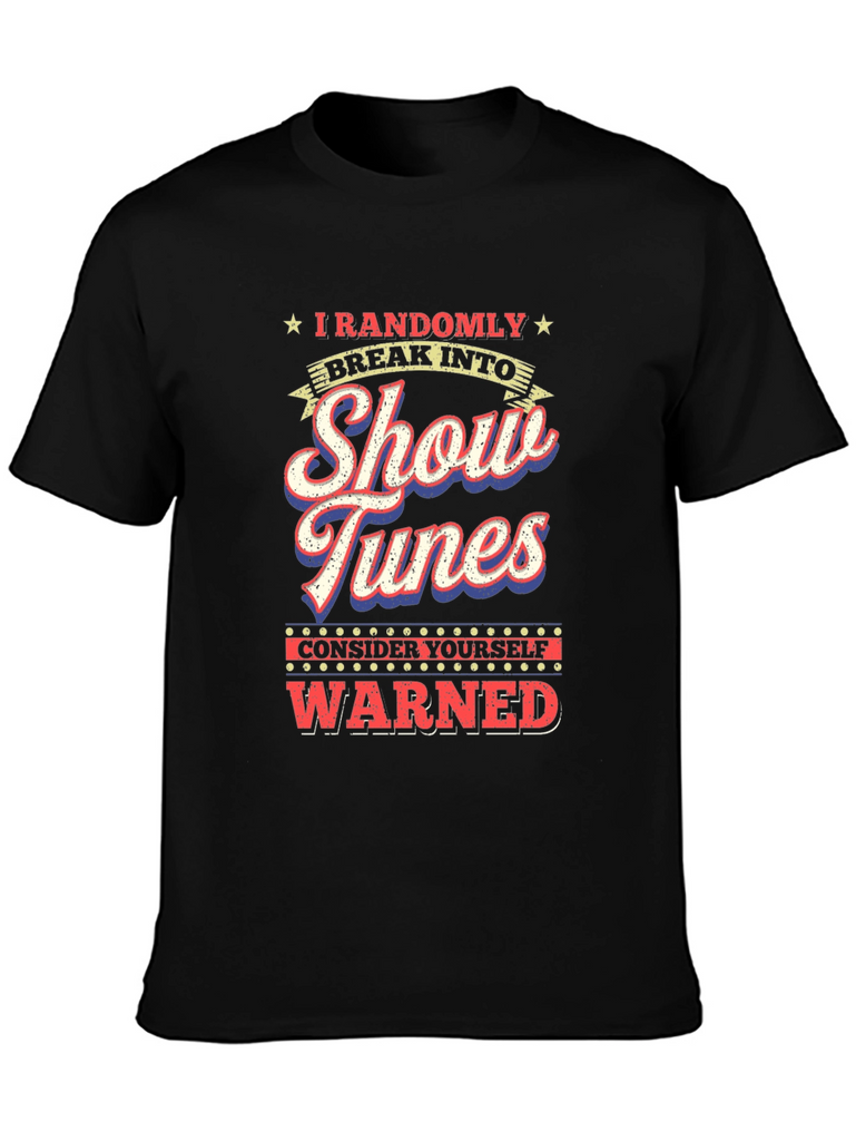 Show off your love for show tunes with this eye-catching black graphic tee. The shirt features a bold design with the phrase "I RANDOMLY Break Into Show Tunes CONSIDER YOURSELF WARNED" in a playful, vintage-inspired font. The lettering is a combination of red, cream, and blue, making it pop against the black background. This tee is perfect for musical theater enthusiasts, performers, or anyone with a fun sense of humor. Wear it to rehearsals, casual outings, or just lounging around the house to let everyone know you might burst into song at any moment. This tee is sure to spark conversation and spread some musical joy wherever you go!