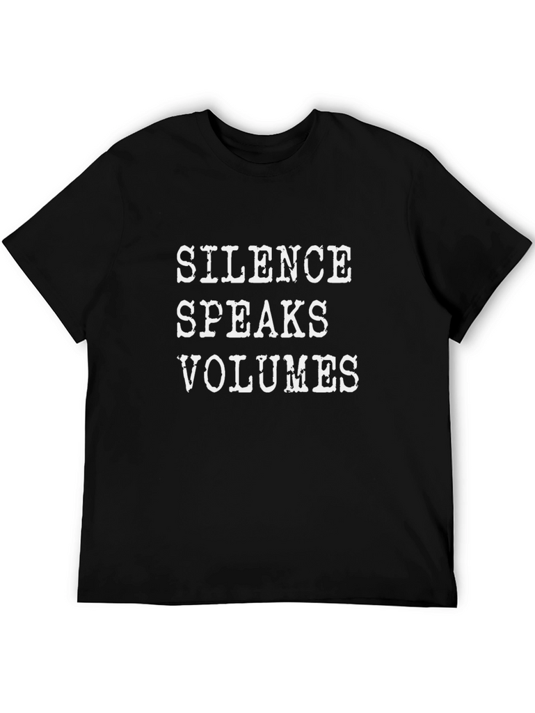 Make a statement without saying a word with this striking black graphic tee. The shirt features the phrase "Silence Speaks Volumes" in a bold, white, distressed font across the chest. Crafted from what appears to be a soft, comfortable cotton blend, this tee offers both style and ease. The classic crew neck and short sleeves make it a versatile addition to any wardrobe. This eye-catching shirt is perfect for casual outings, expressing your individuality, or making a subtle yet powerful statement. The contrasting white text against the black fabric ensures high visibility. This comfortable tee is a must-have for those who appreciate meaningful style.