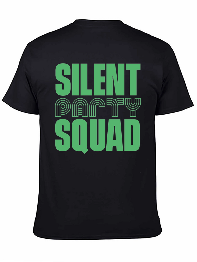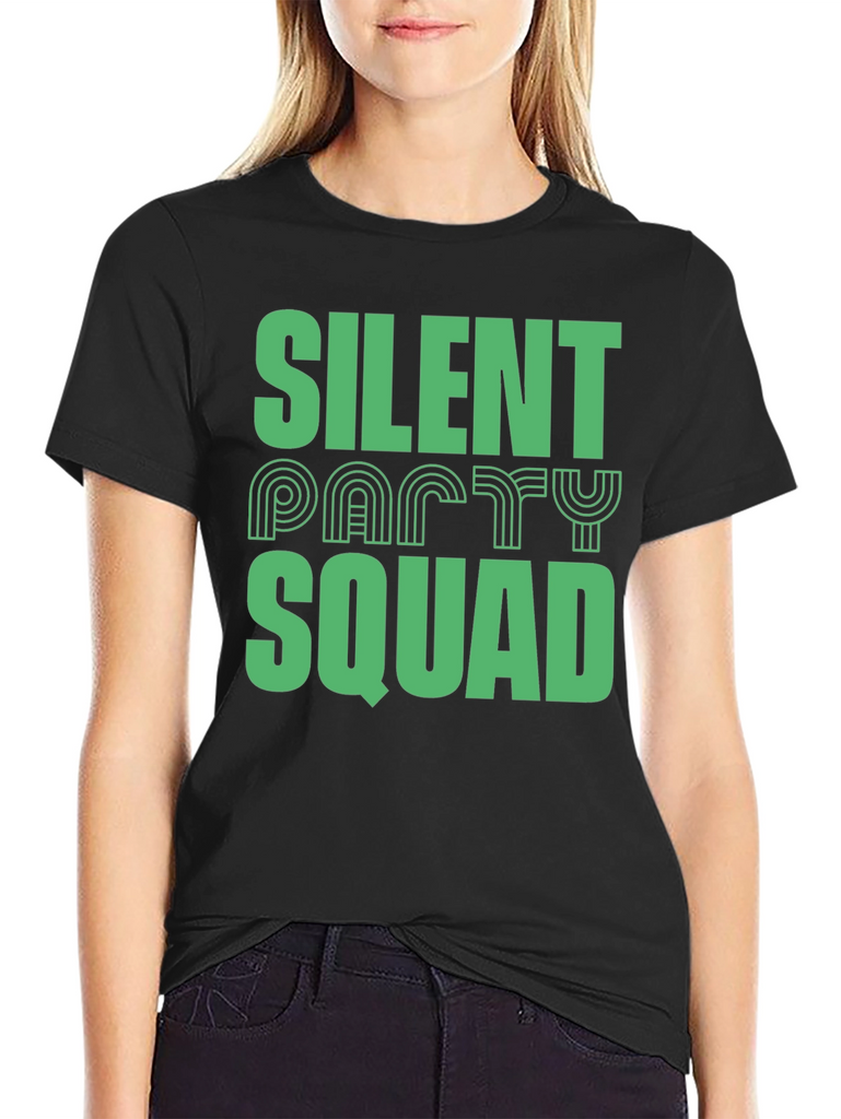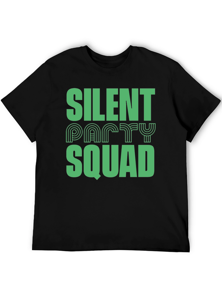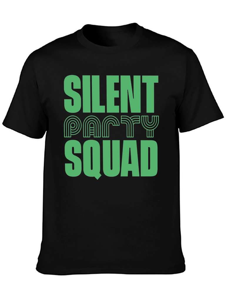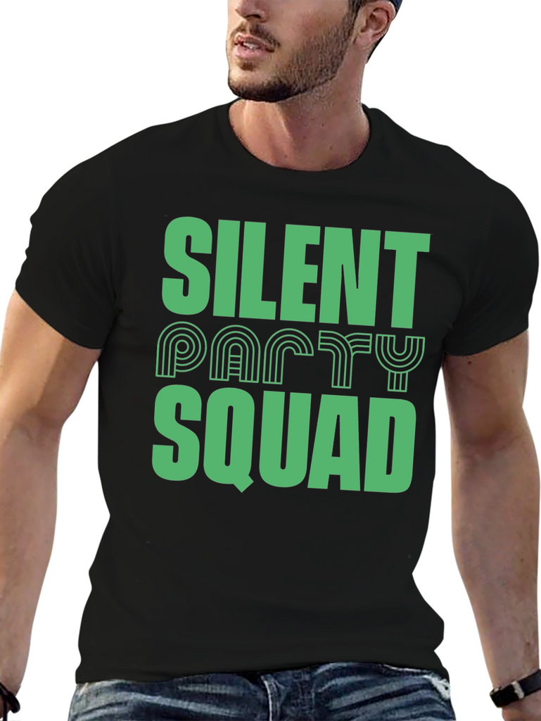 Show off your unique style with this eye-catching black T-shirt. The bold, green "Silent Party Squad" graphic makes a statement. The word "PARTY" has a retro-inspired design. Made from a soft, comfortable fabric, this tee is perfect for casual wear or a night out with friends. Express your personality and stand out from the crowd with this must-have addition to your wardrobe.