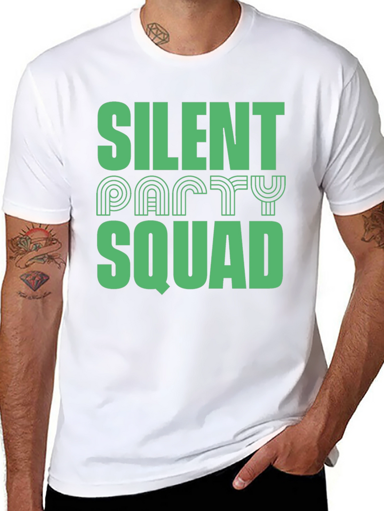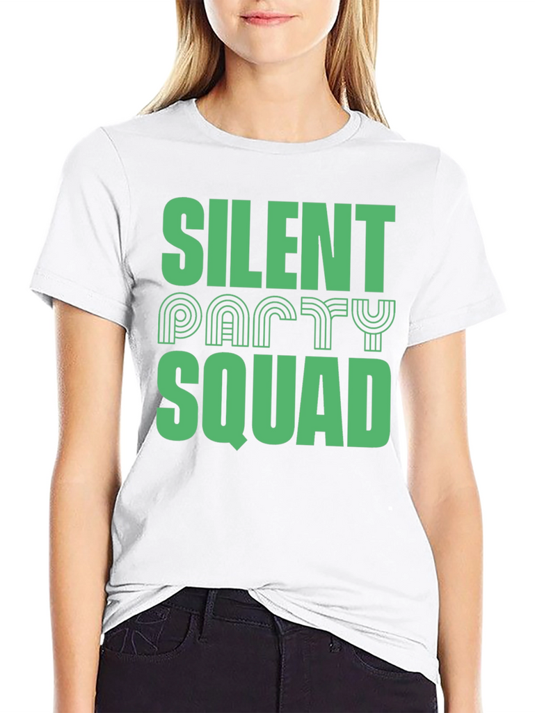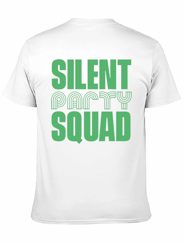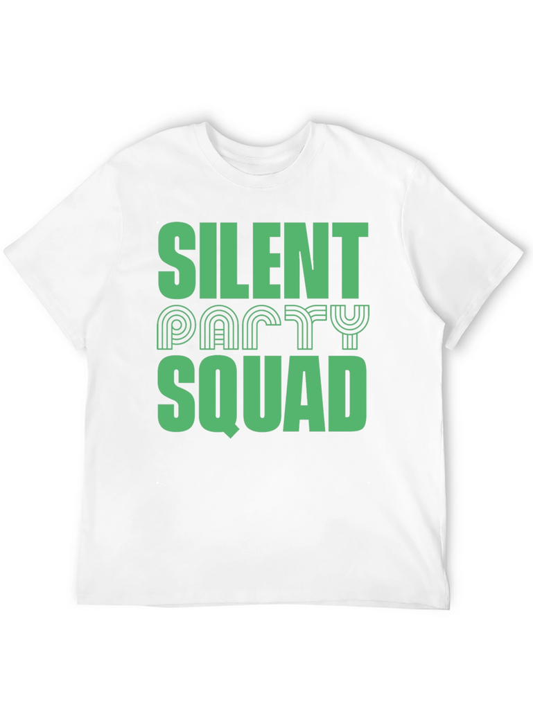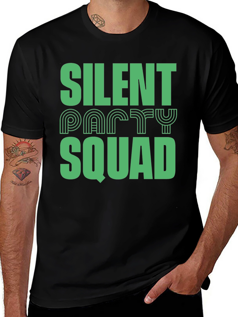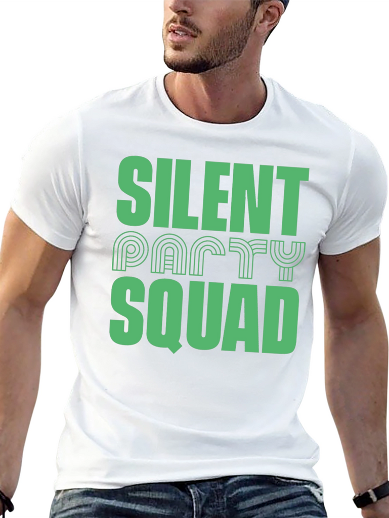 Show off your unique style with this eye-catching black T-shirt. The bold, green "Silent Party Squad" graphic makes a statement. The word "PARTY" has a retro-inspired design. Made from a soft, comfortable fabric, this tee is perfect for casual wear or a night out with friends. Express your personality and stand out from the crowd with this must-have addition to your wardrobe.