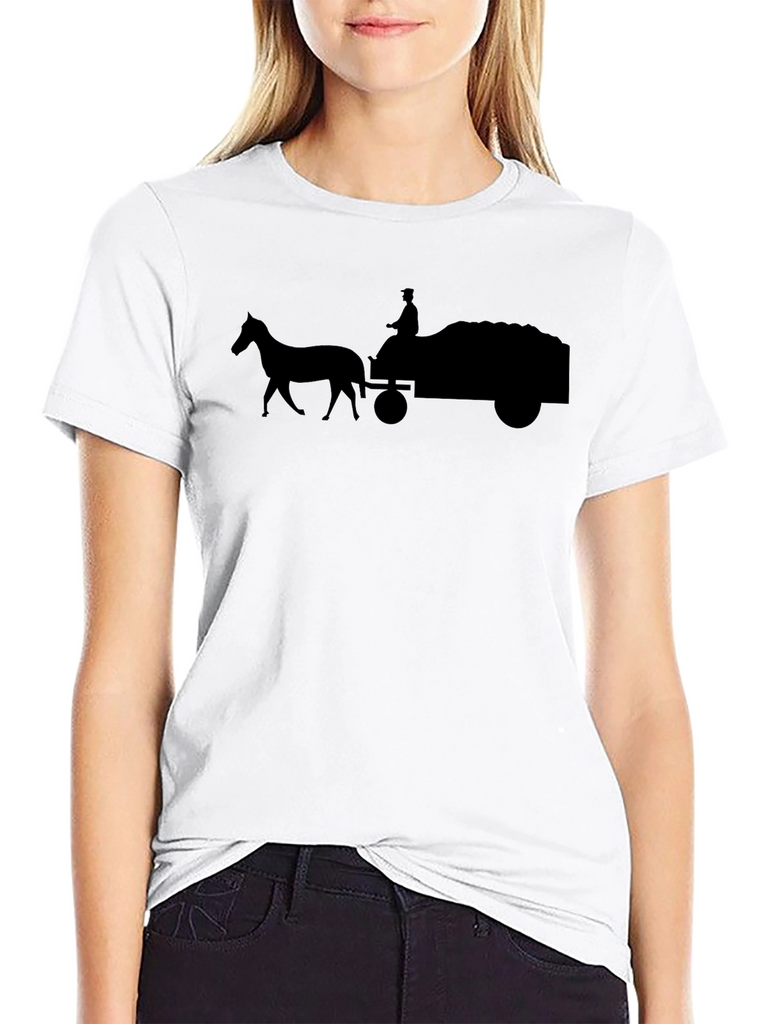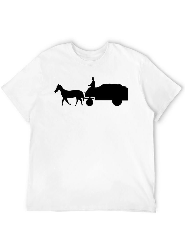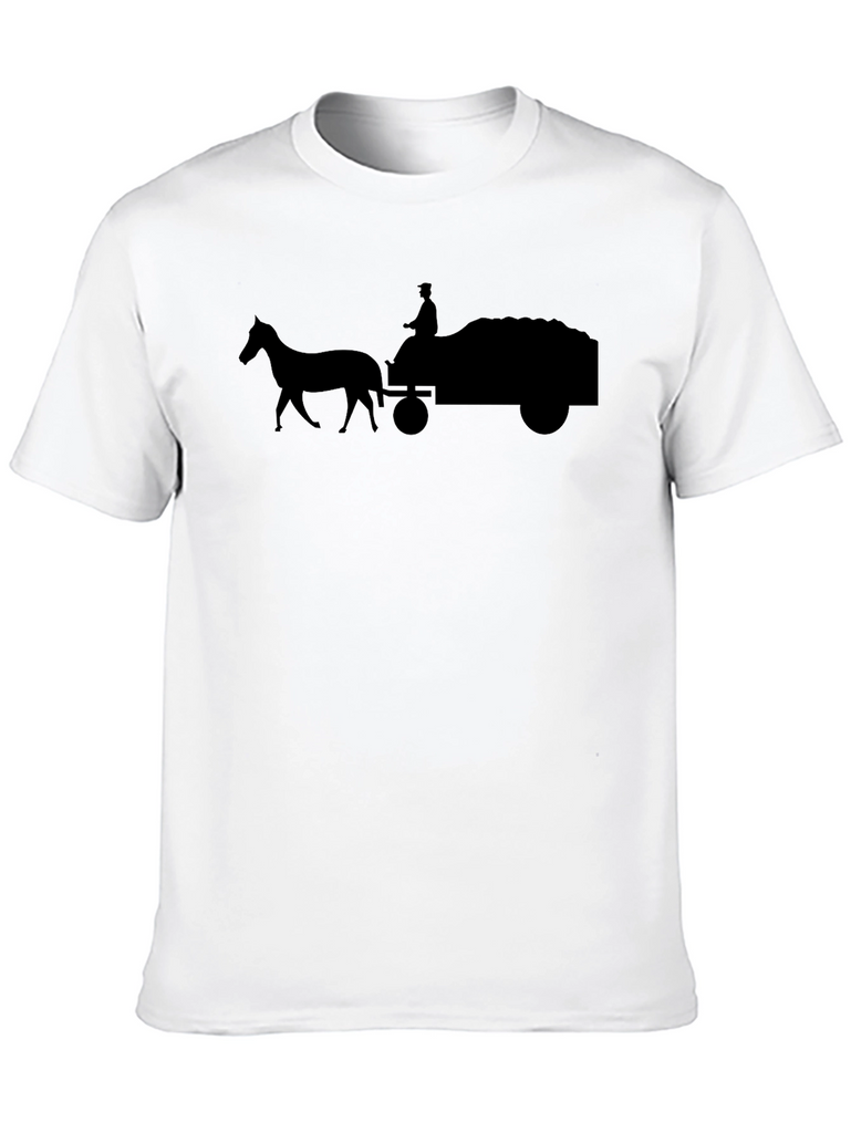 This classic black T-shirt features a striking silhouette design of a horse pulling a cart with a figure riding in it. The solid black design is printed on a comfortable, casual fit tee. Made from soft, breathable fabric, this shirt is perfect for everyday wear. Its minimalist aesthetic makes it versatile for styling with jeans, shorts, or layered under a jacket. Show off your unique style with this eye-catching and comfortable tee. A great conversation starter, the shirt's graphic offers a touch of rustic charm and simple elegance to any outfit. Enjoy all-day comfort and style in this unique wardrobe staple.