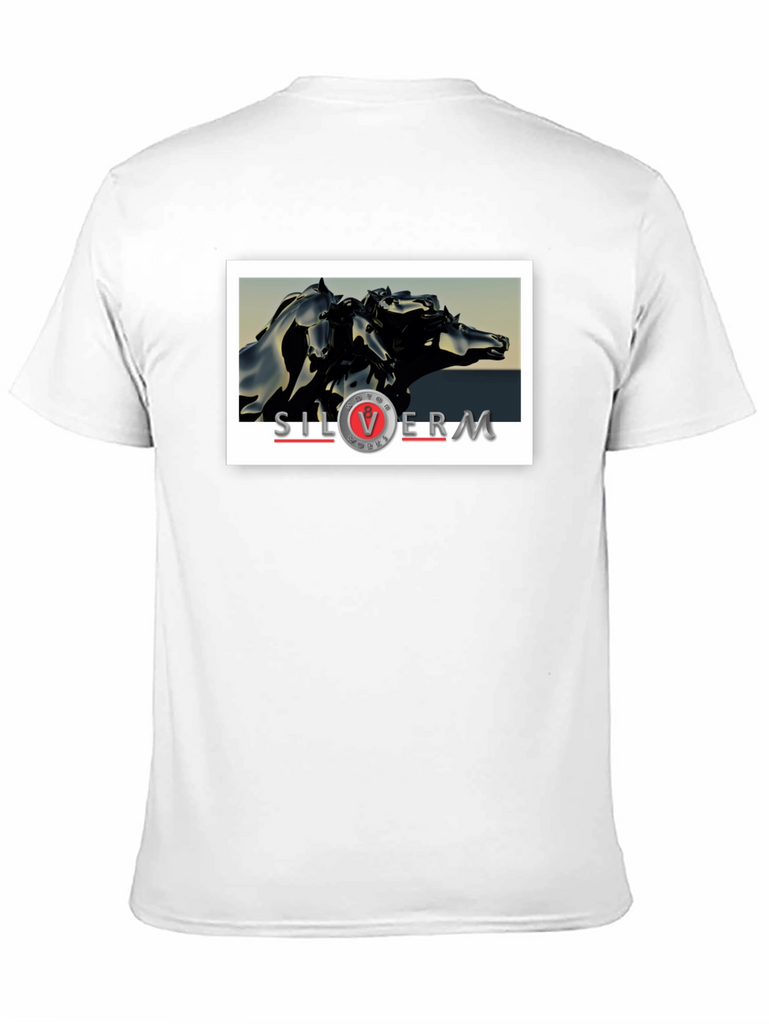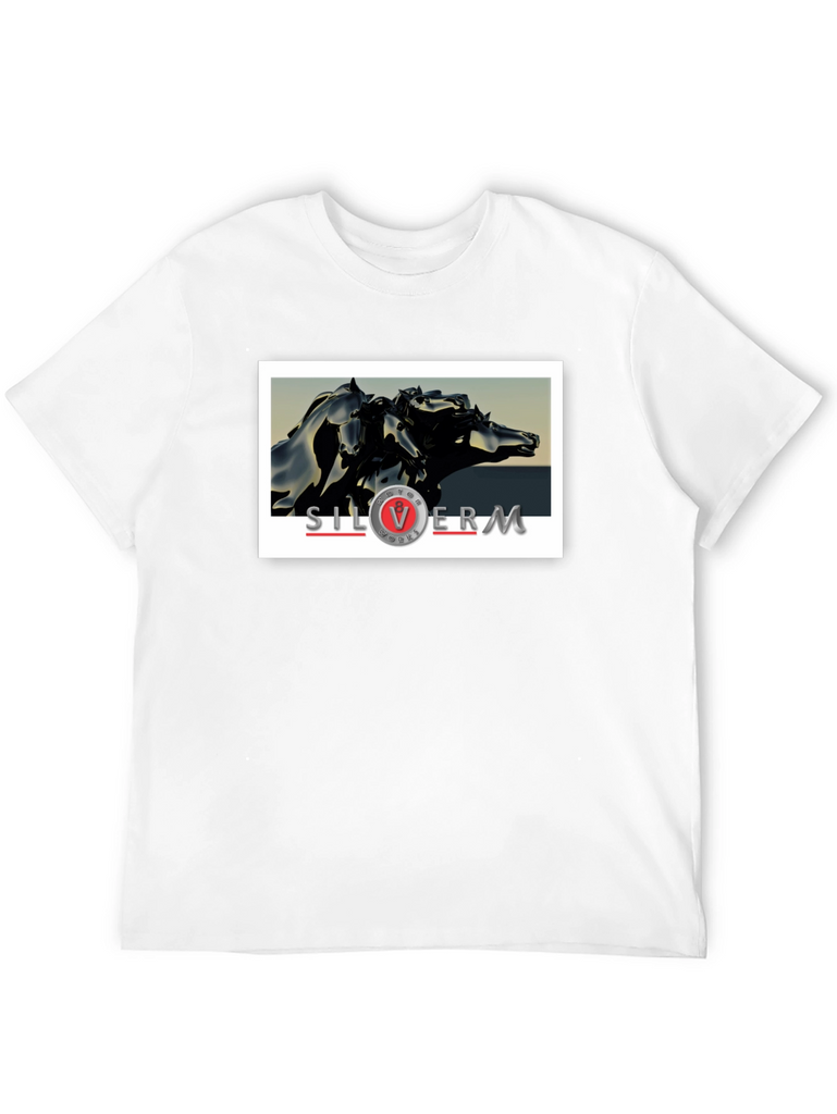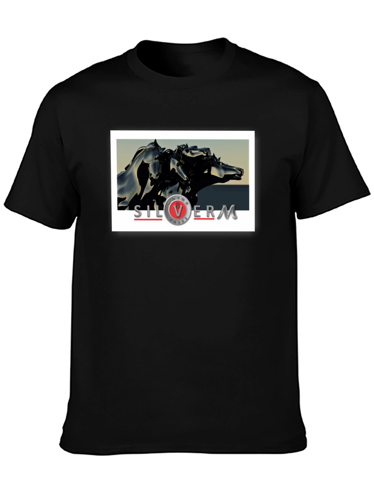 This black t-shirt features a striking graphic of abstract horses, rendered in metallic silver. The design is eye-catching and modern, making it a great choice for anyone who appreciates art and unique style. Made from soft, comfortable fabric, this tee is perfect for casual wear. Wear it to a concert, art gallery, or just hanging out with friends. Its bold graphic makes a statement while ensuring all-day comfort. Add this distinctive piece to your wardrobe and stand out from the crowd.