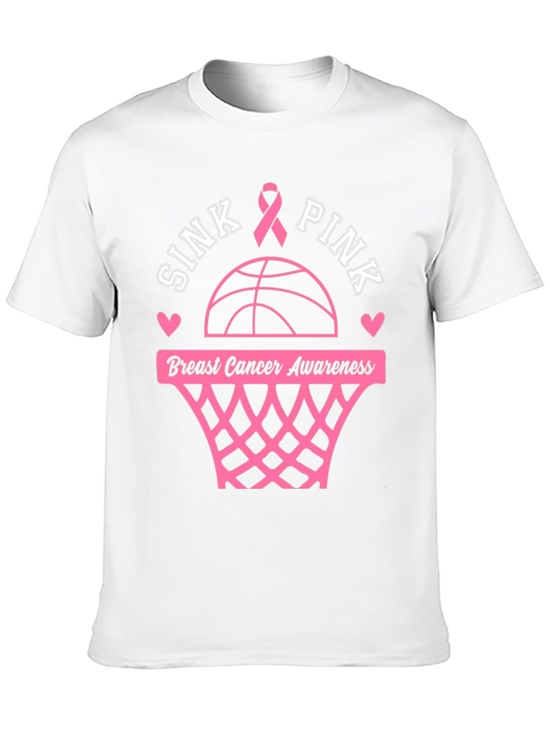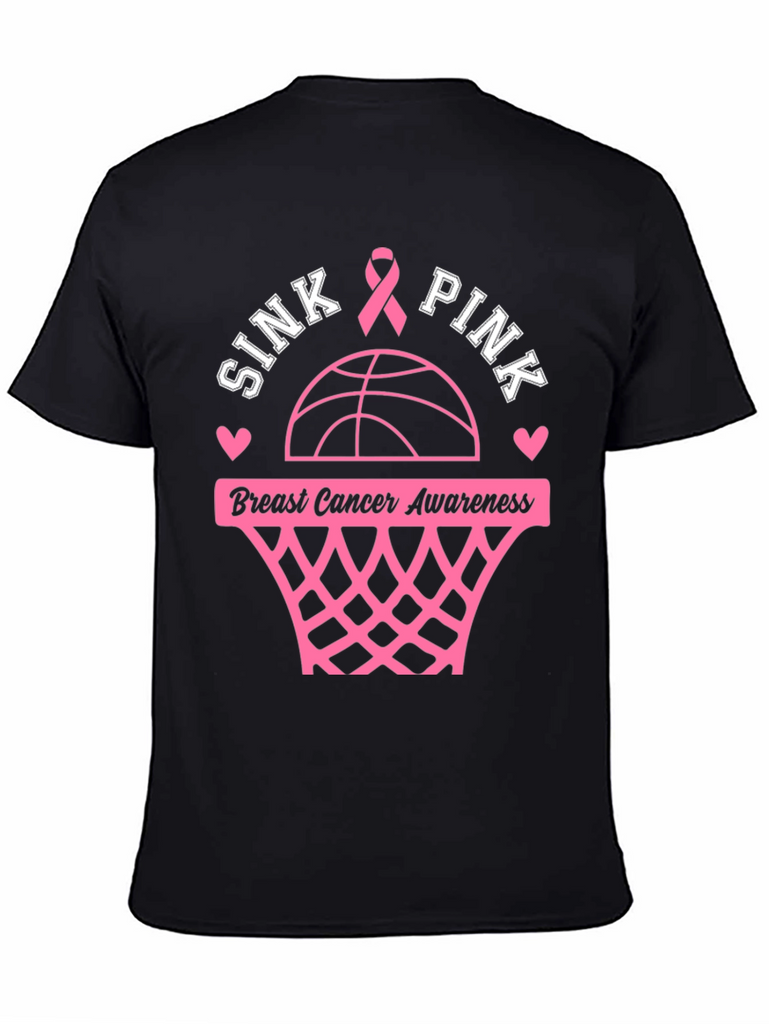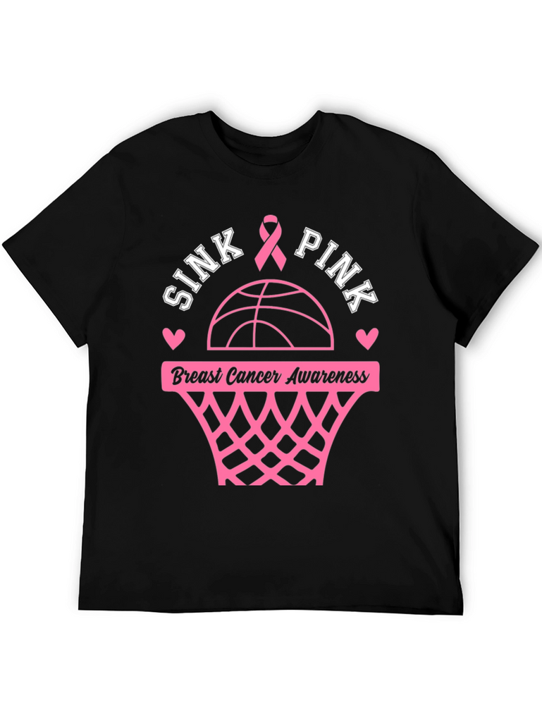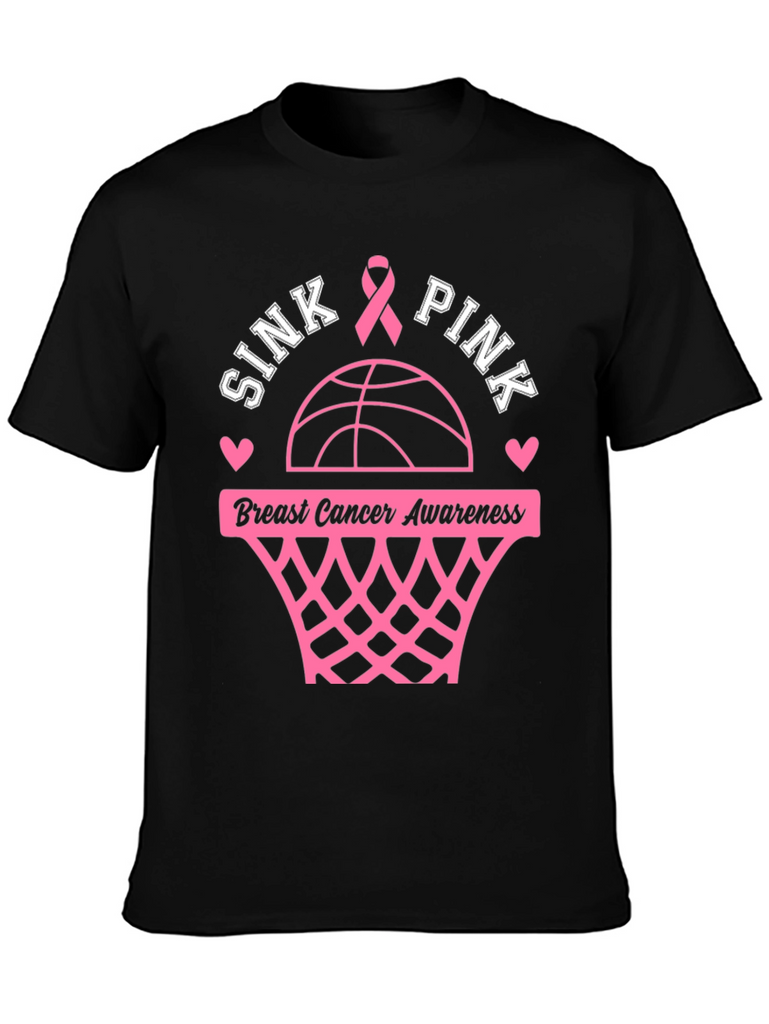 Show your support with this stylish black T-shirt, featuring a unique basketball-themed design. The "Sink Pink" text, accompanied by a breast cancer awareness ribbon and heart accents, creates a visually appealing and meaningful message. A pink basketball net graphic adds a sporty touch. Ideal for raising awareness and showing solidarity, this T-shirt is perfect for everyday wear, sports events, or fundraising activities. The comfortable fabric and classic fit ensure a great look and feel while making a difference. Get yours today and help spread awareness!