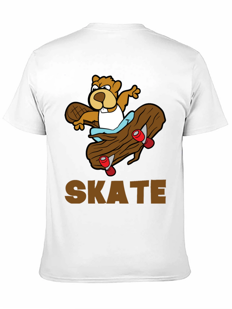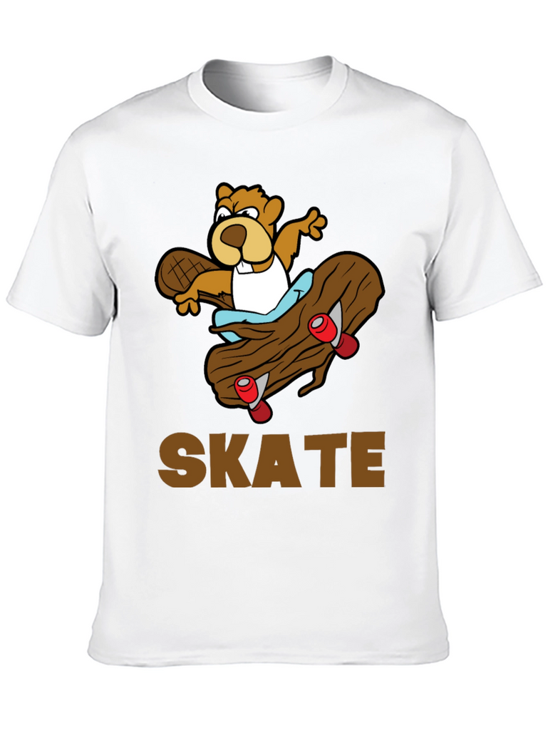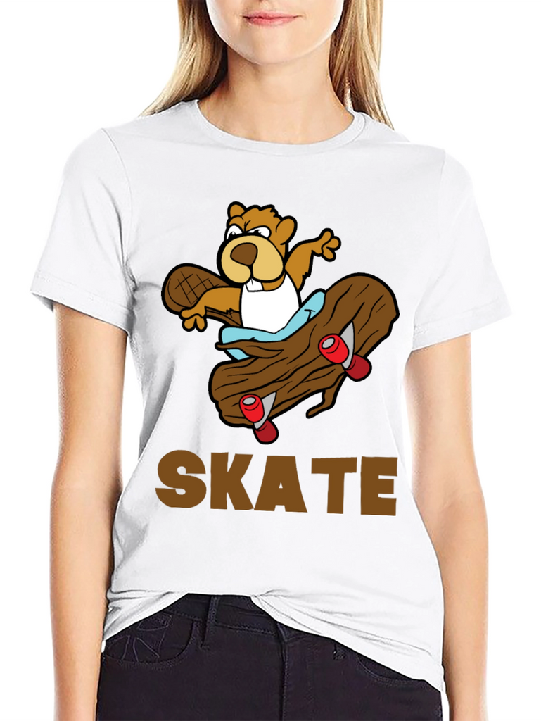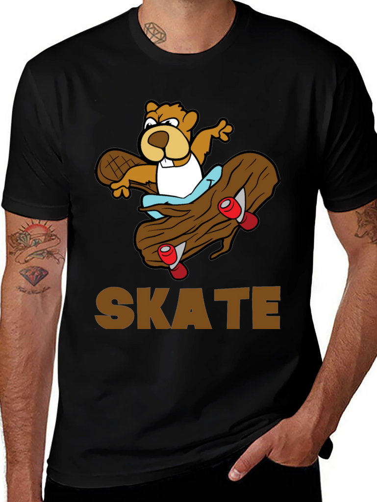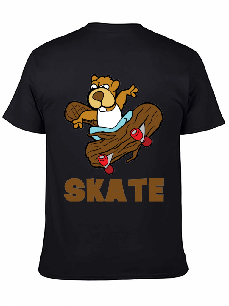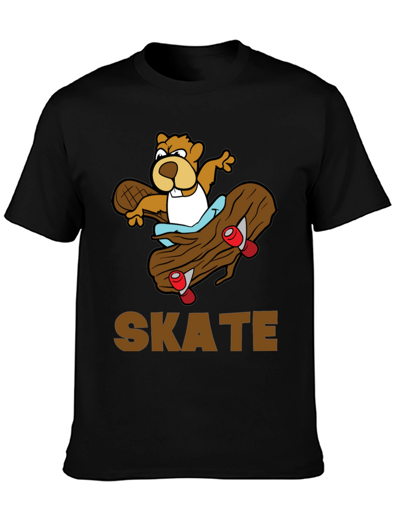 This unique black t-shirt features a cartoon beaver riding a log like a skateboard. The whimsical design includes the word "SKATE" in bold brown letters, making it a fun and eye-catching piece. Made from a soft-looking fabric, this tee offers comfort and style. The cartoon beaver graphic has great detail and a cheerful energy. Ideal for casual wear, skateboarding enthusiasts, or anyone who enjoys fun and quirky designs. Perfect for everyday wear and a great gift for fans of animated style!