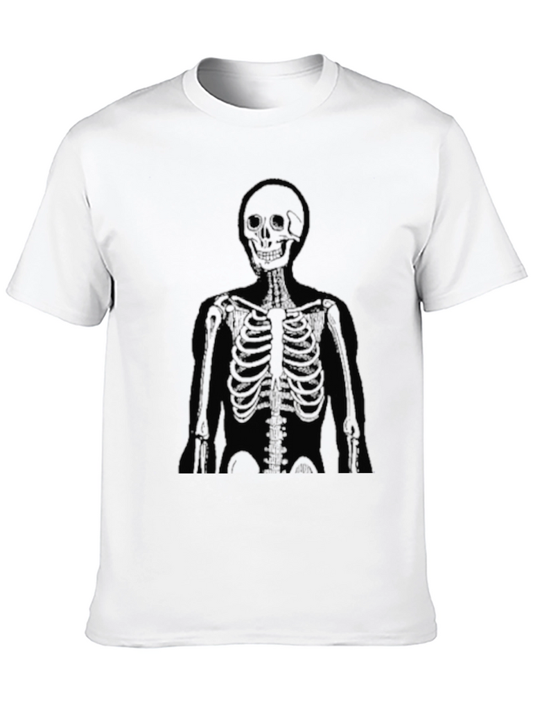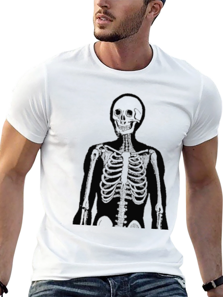 Show off your edgy side with this black crew neck t-shirt. The unique skeleton graphic makes a statement while maintaining a minimalist style. Constructed from a soft cotton blend, this tee offers both comfort and durability for everyday wear. Its classic fit makes it versatile for layering or wearing on its own. Perfect for casual outings, concerts, or expressing your individual style, this skeleton print t-shirt is sure to turn heads and become a staple in your wardrobe.