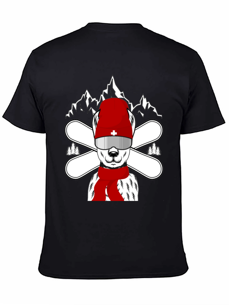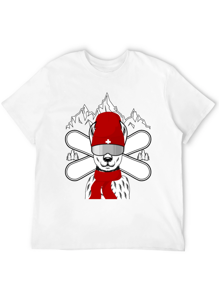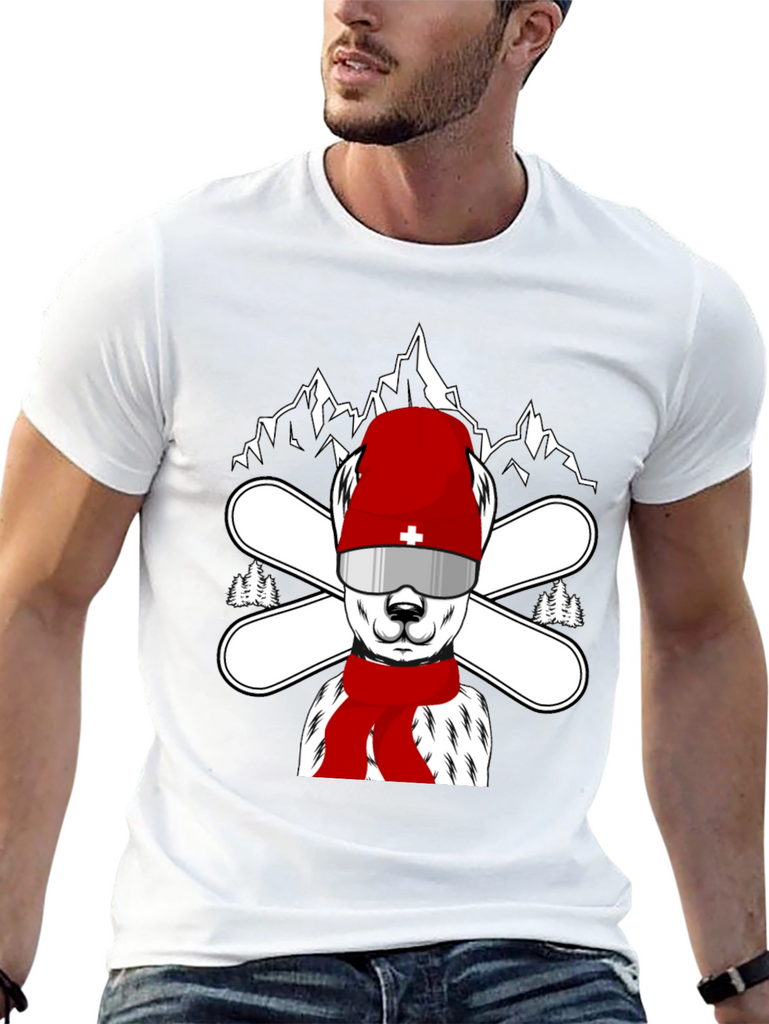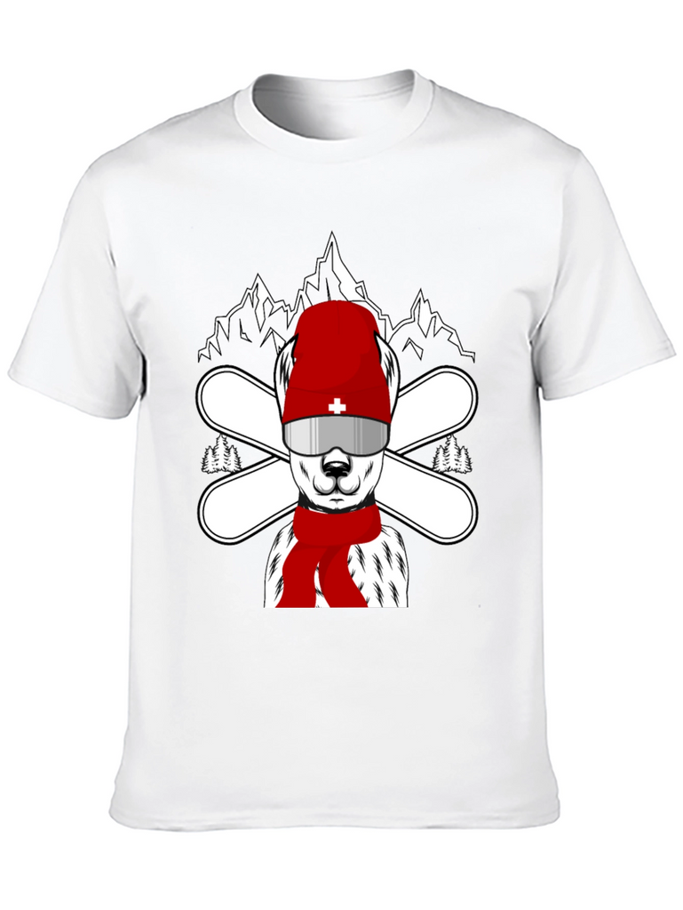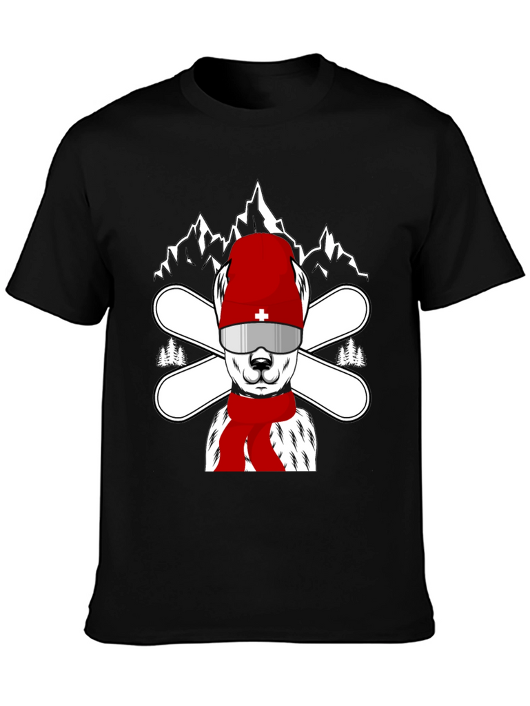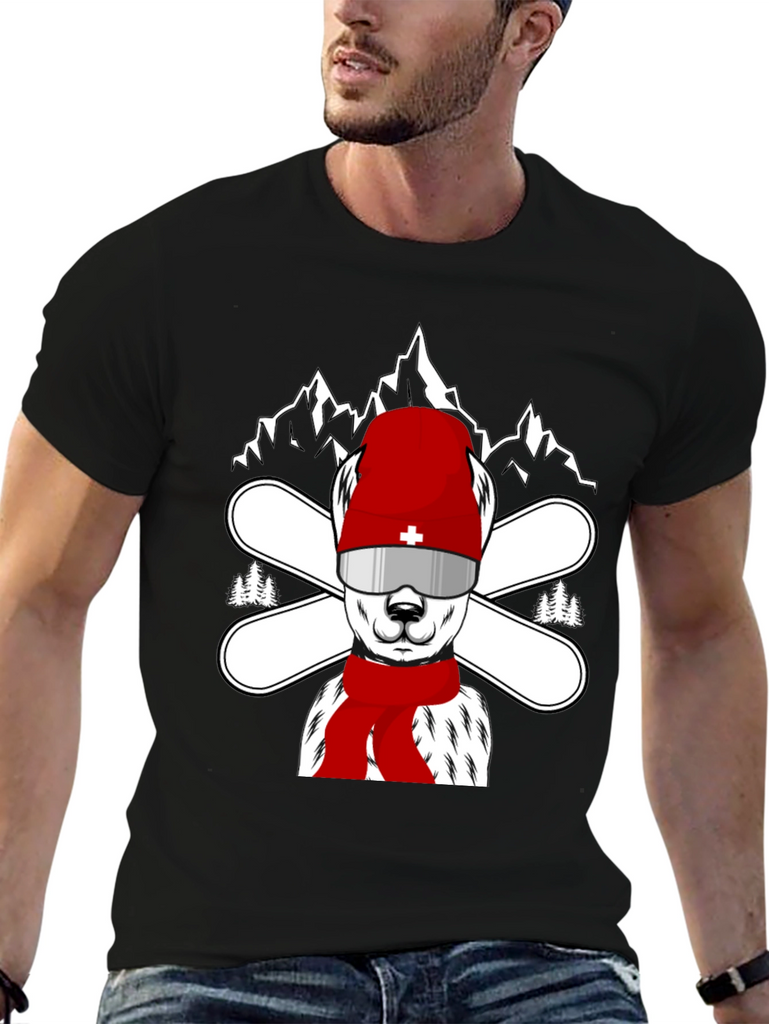 Embrace the winter spirit with this fun Ski Bear Graphic Tee. This t-shirt features a graphic of a bear wearing a red beanie with a Swiss cross, ski goggles, and a cozy red scarf, set against a snowy mountain backdrop with crossed skis. The design is playful and perfect for ski enthusiasts and animal lovers alike. Made from comfortable, breathable fabric, this t-shirt is ideal for casual wear, outdoor adventures, or a day on the slopes. Show off your love for winter sports with this stylish and unique tee. It’s a great conversation starter and adds a touch of whimsy to any outfit.