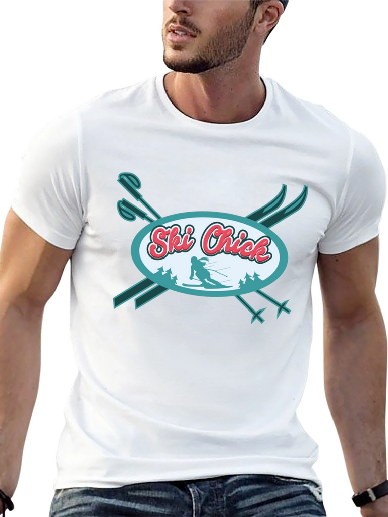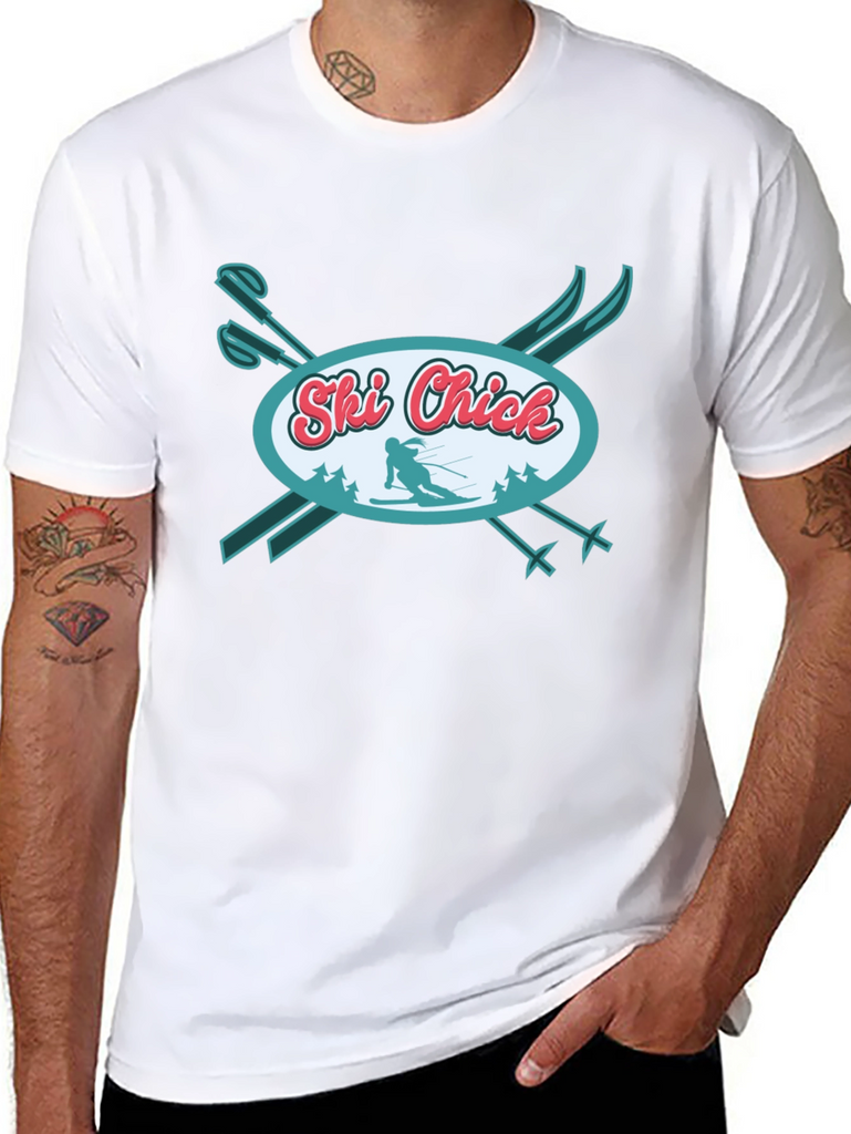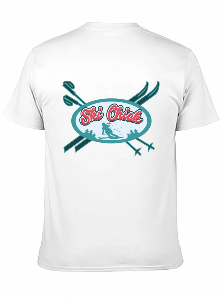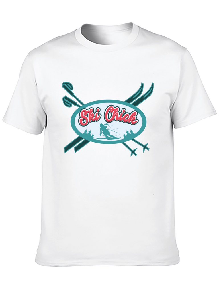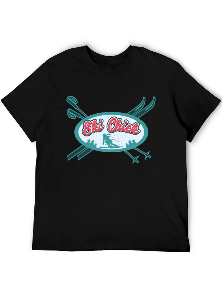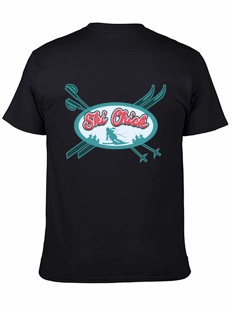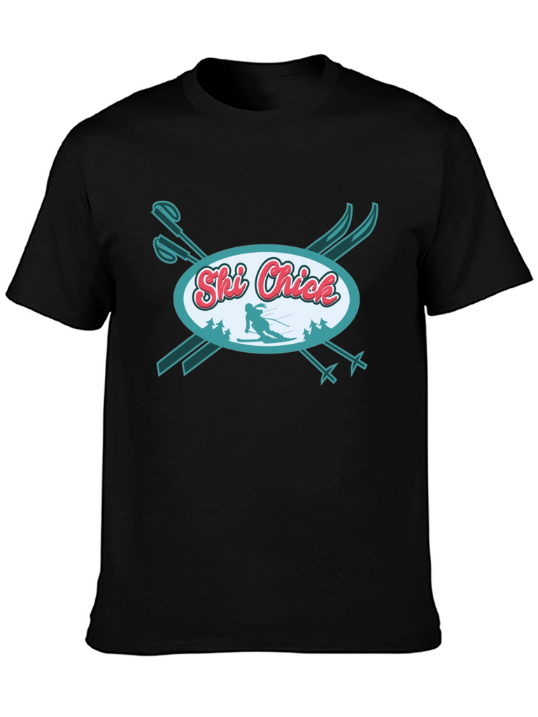 Hit the slopes in style with this unique black t-shirt featuring a playful "Ski Chick" graphic. The design showcases crossed skis and ski poles overlaid with an oval emblem. Inside the emblem, a skier glides through a snowy landscape with evergreen trees. The retro-inspired design and bold color scheme make this tee stand out. Crafted from comfortable, breathable fabric, this unisex t-shirt is perfect for casual wear, outdoor adventures, or après-ski gatherings. Show off your love for skiing with this eye-catching and stylish tee! Ideal for skiers, snowboarders, or anyone who enjoys winter sports.