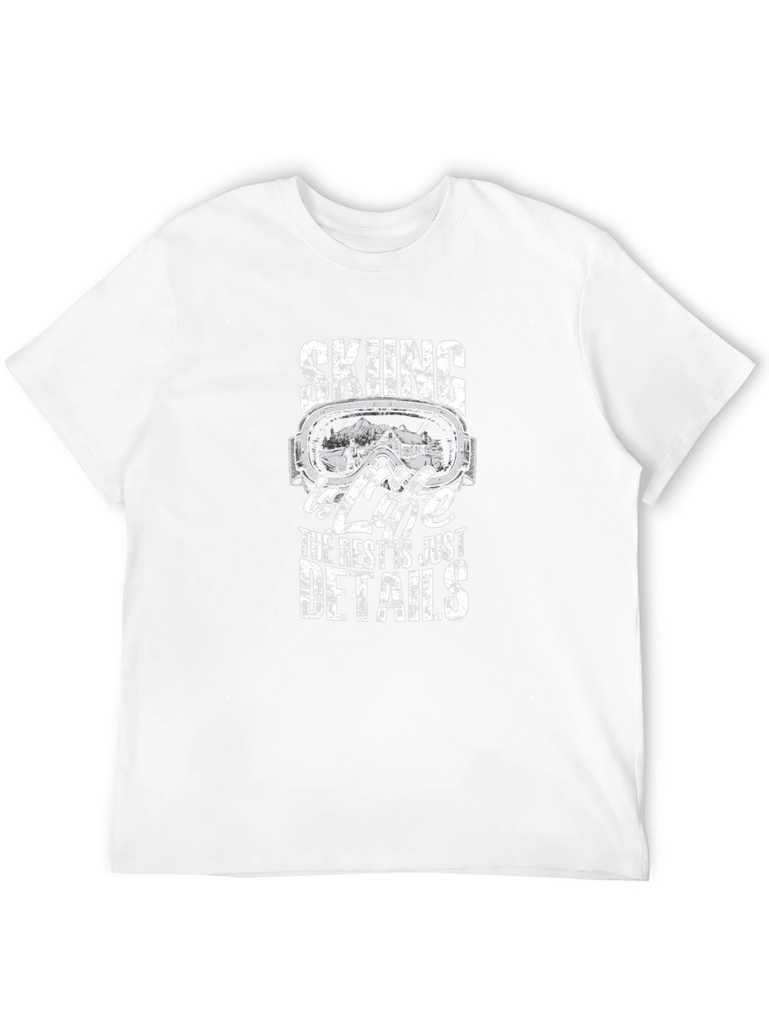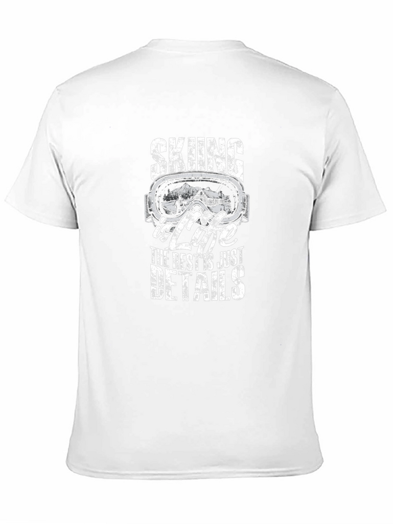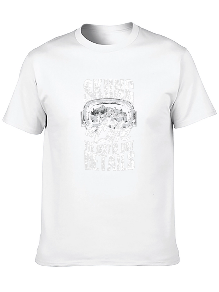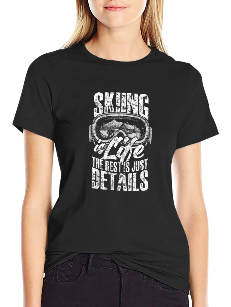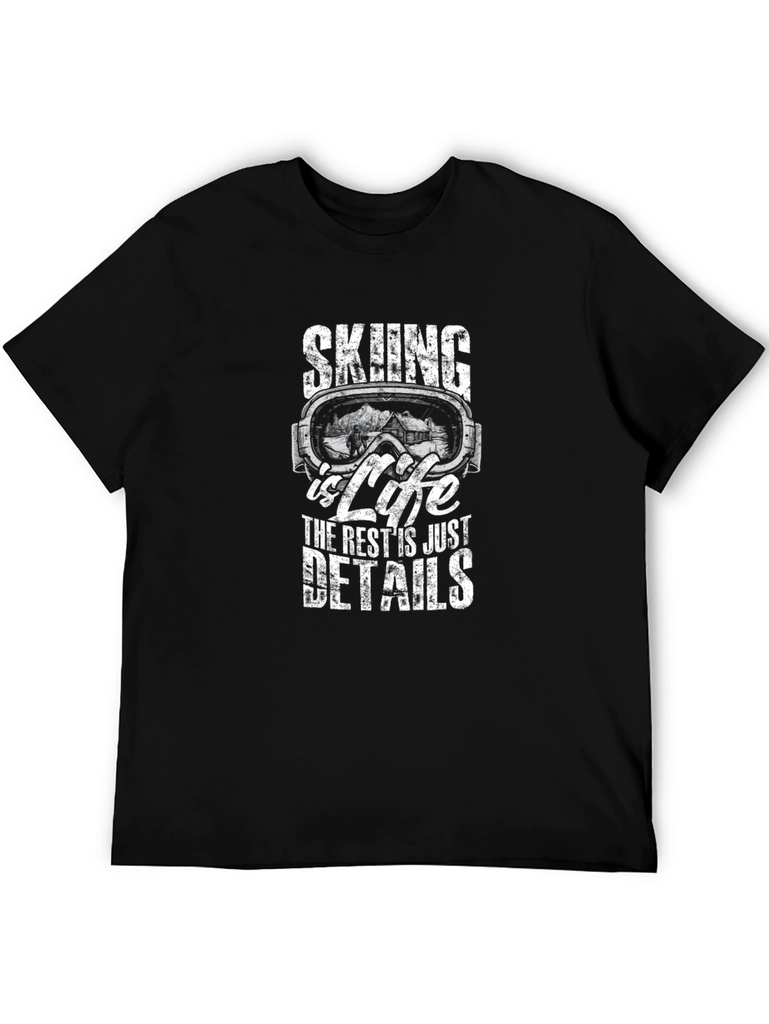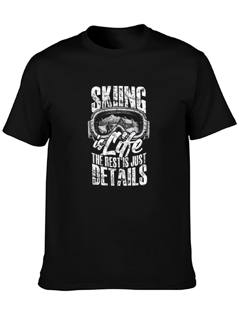 Show off your love for the slopes with this stylish black graphic t-shirt. Featuring a bold design with the phrase "Skiing is Life, The Rest is Just Details," this tee is perfect for any ski enthusiast. The distressed, vintage-inspired print incorporates ski goggles showcasing a mountain landscape. Made from a comfortable-looking fabric, this shirt is ideal for casual wear, ski trips, or après-ski gatherings. Makes a great gift for skiers. Get yours today and represent the sport you love!