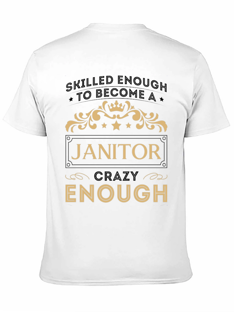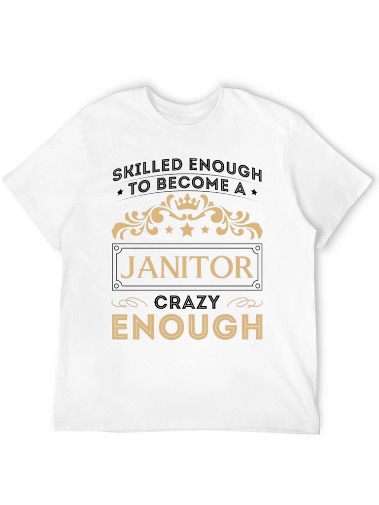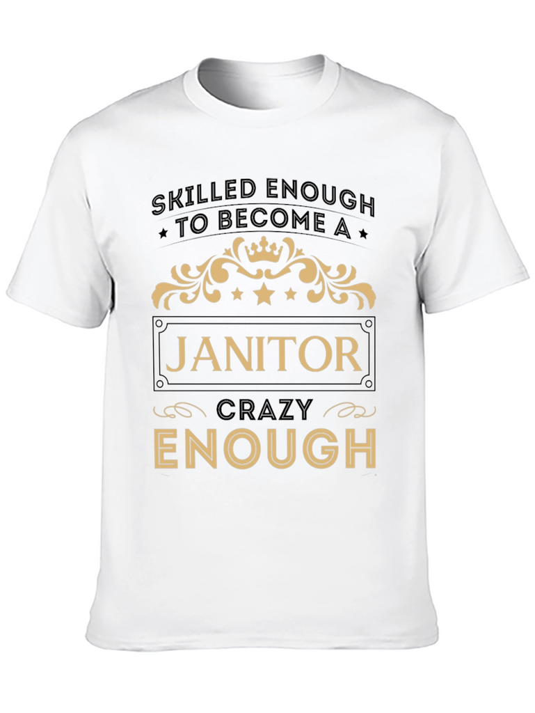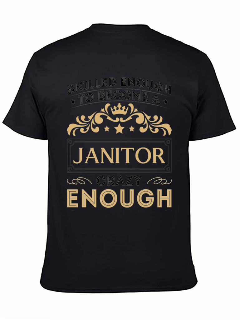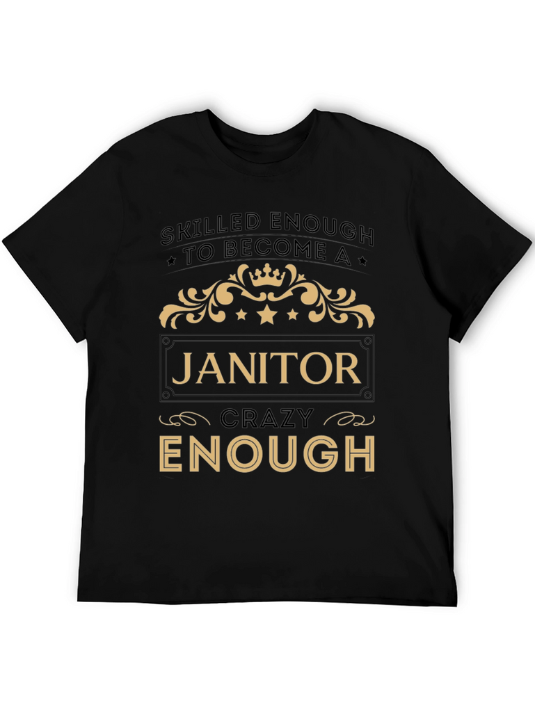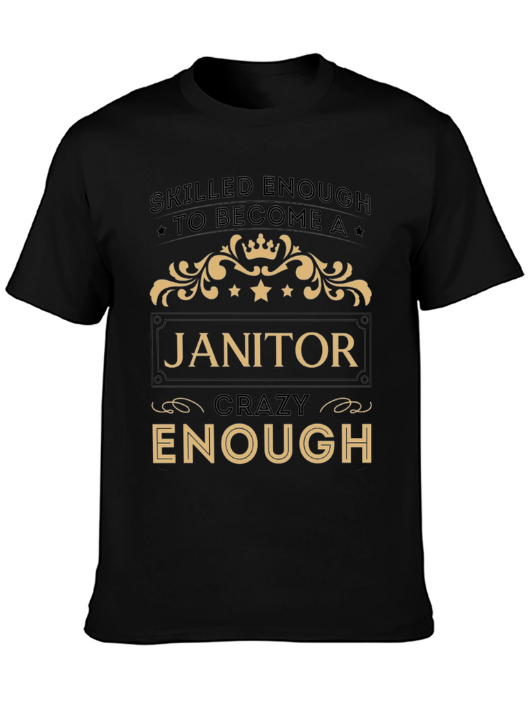 Show off your pride with this bold Janitor graphic tee! This black t-shirt features a striking gold design with the phrase "Skilled Enough to Become A Janitor Crazy Enough". The design incorporates decorative flourishes for added flair. Perfect for casual wear, work, or as a gift for your favorite janitor. This tee is sure to turn heads and spark conversations. Get yours today and let the world know about your skills!