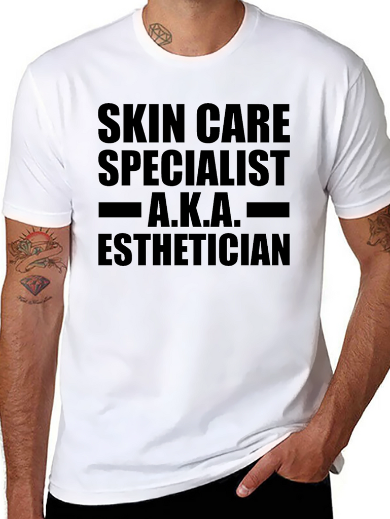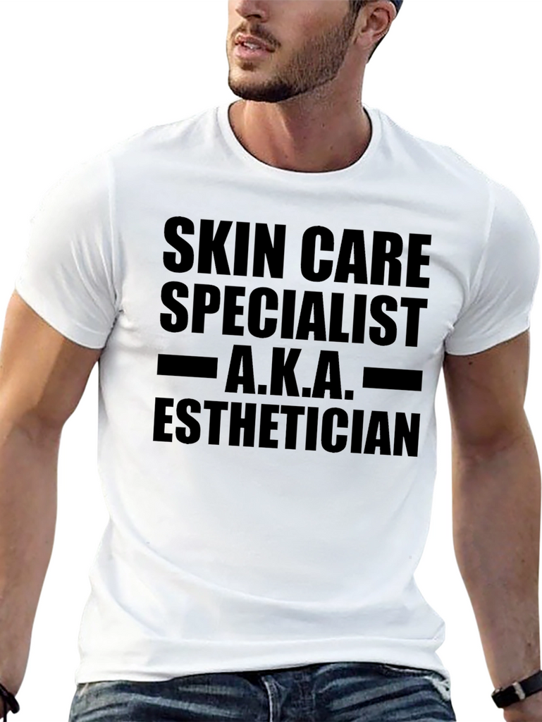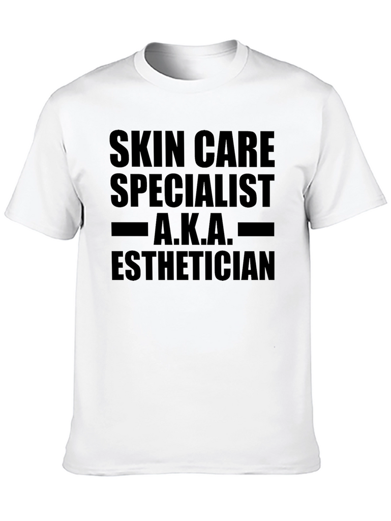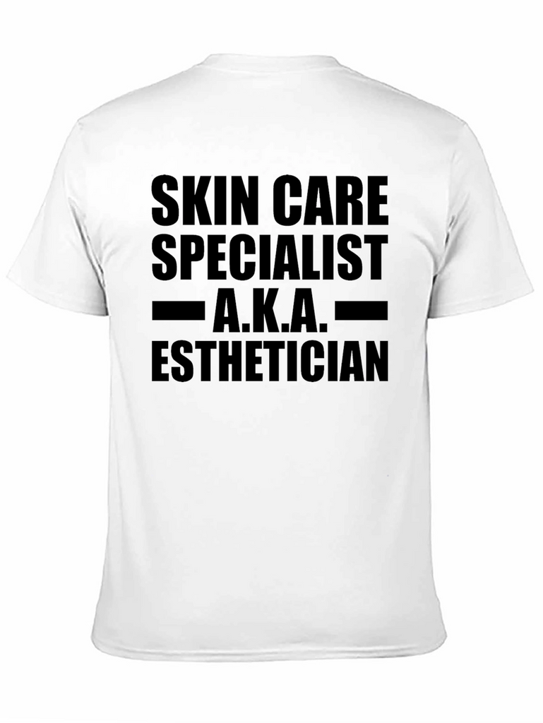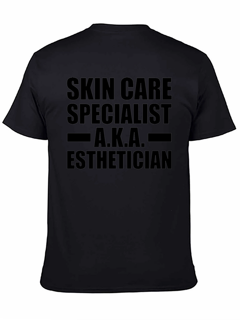 Show off your skin care expertise with this black cotton blend t-shirt. Featuring the bold text, "SKIN CARE SPECIALIST A.K.A. ESTHETICIAN," this tee is perfect for professionals in the beauty and skincare industry. The classic fit ensures comfortable all-day wear, whether you're working in a salon, spa, or simply want to express your passion for skincare. This shirt is a great conversation starter and makes a thoughtful gift for estheticians, dermatologists, or anyone dedicated to healthy, glowing skin. The bold graphic will make a statement, while the breathable fabric keeps you cool and comfortable.