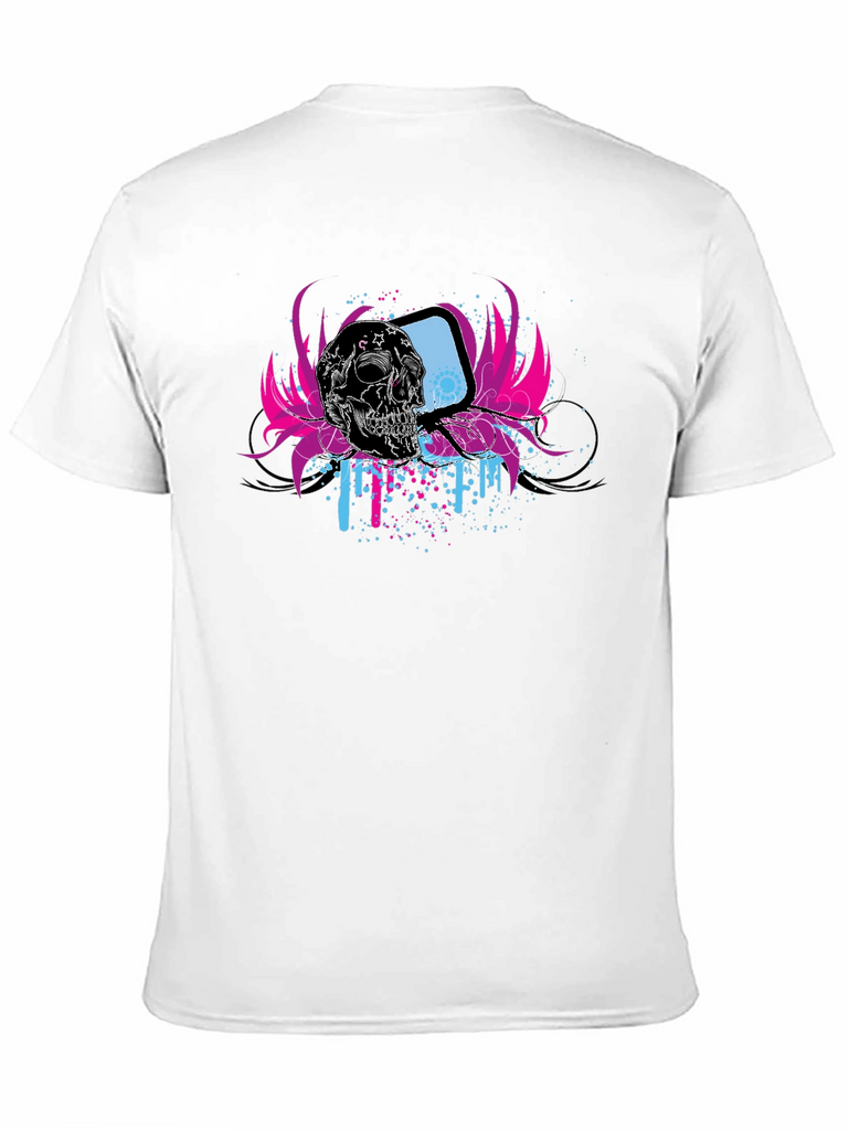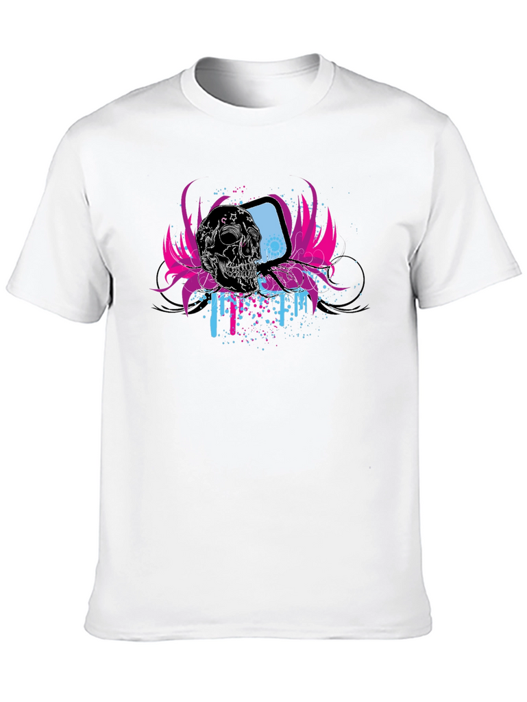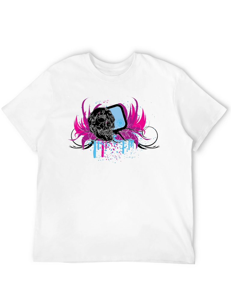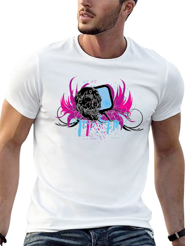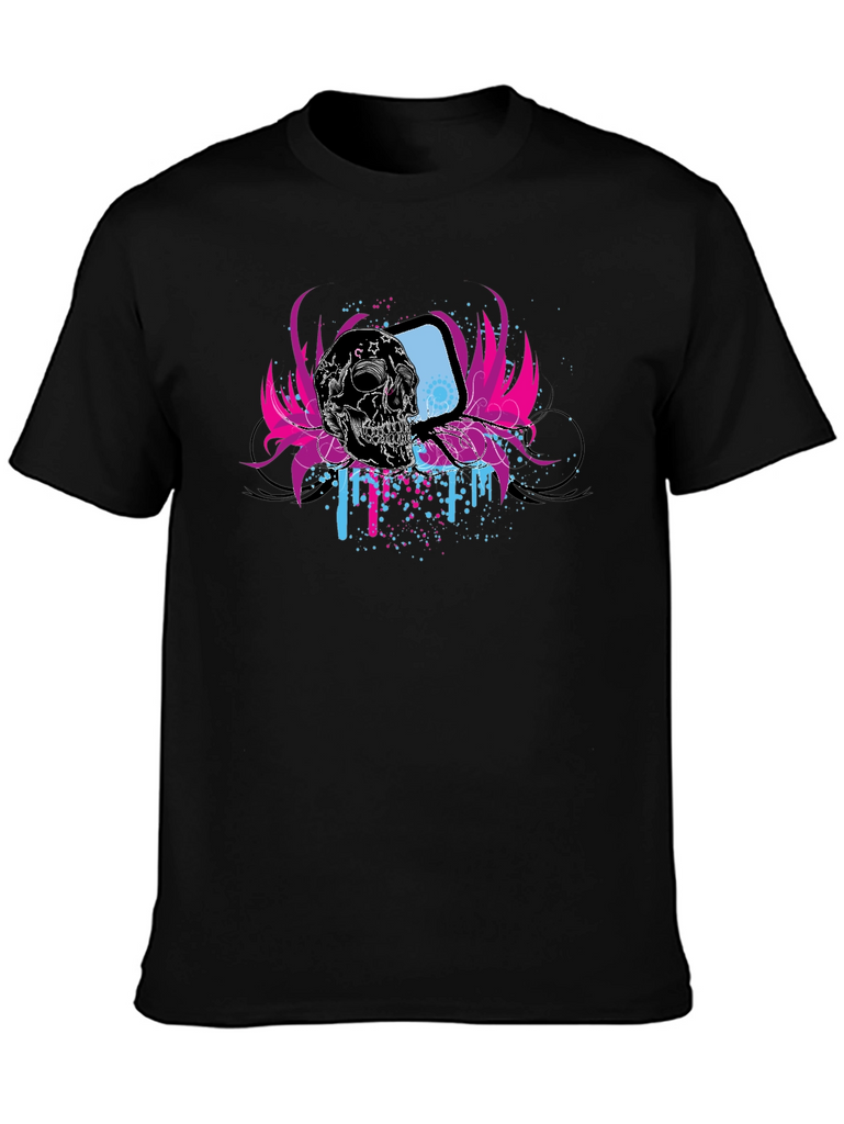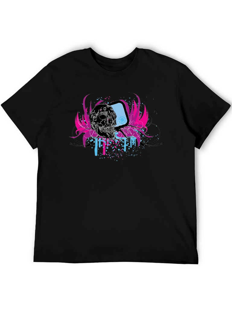 Make a bold statement with this edgy black t-shirt. The eye-catching design features a stylized skull integrated with a retro television graphic, surrounded by vibrant pink and blue accents. This unique artwork creates a visually striking contrast. Made from a comfortable and breathable fabric, this tee is perfect for everyday wear or to express your individual style at concerts, parties, or casual outings. Pair it with jeans, shorts, or layer it under a jacket for a cool and contemporary look. Own the spotlight and showcase your unique personality with this head-turning t-shirt.