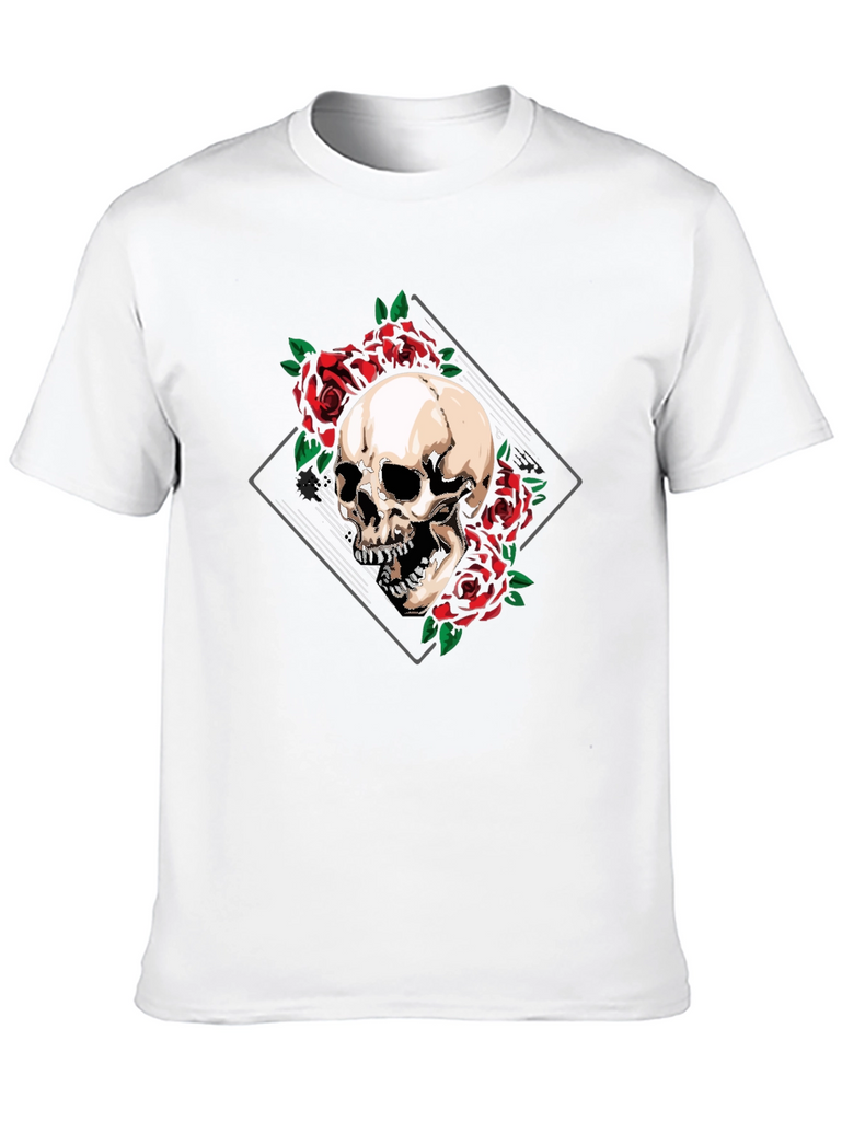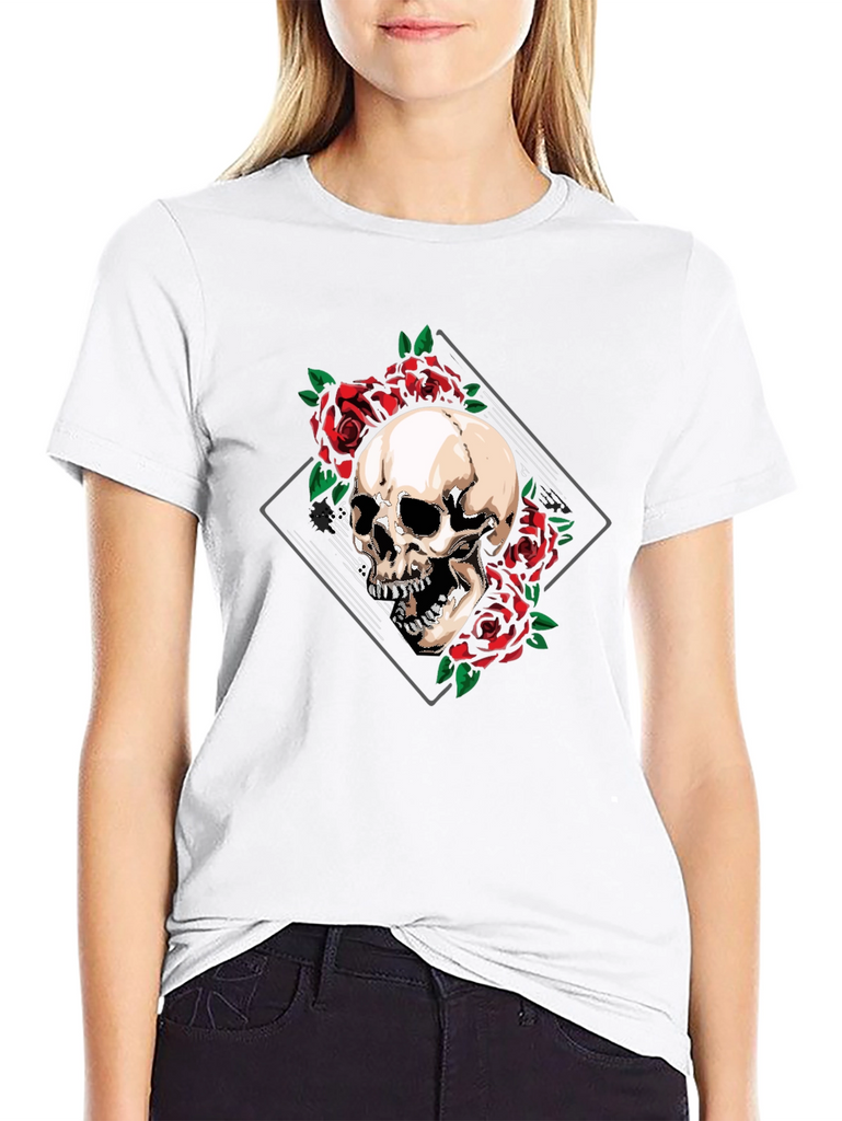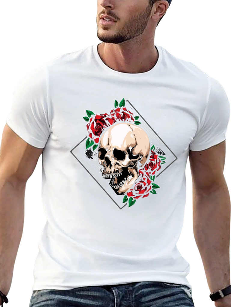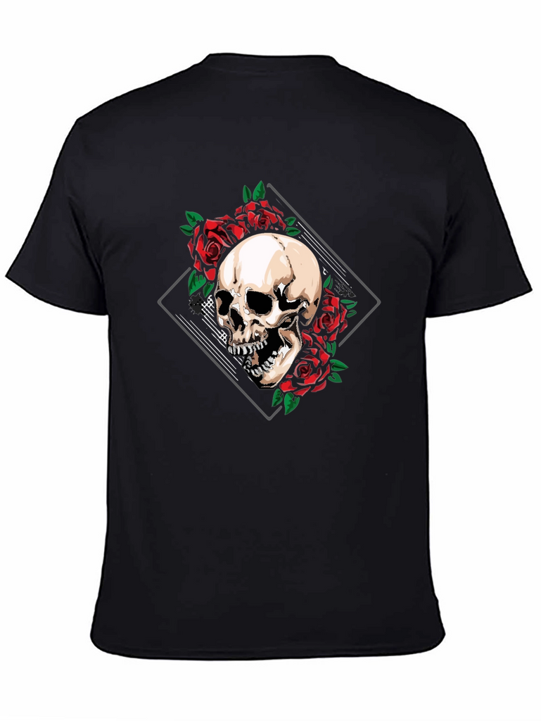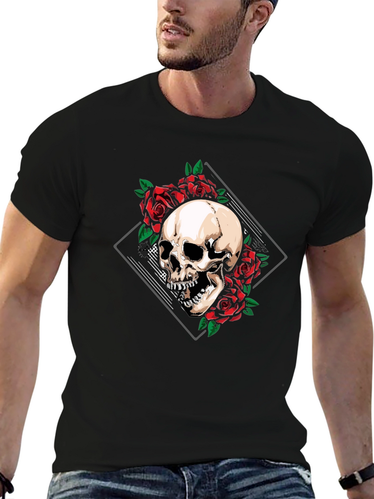 Make a bold statement with this black t-shirt featuring a striking graphic design. A realistic skull is surrounded by vibrant red roses and green leaves, set against a geometric diamond shape. This eye-catching design is perfect for those who love edgy, alternative fashion. The t-shirt appears to be made of a soft, comfortable material, ideal for everyday wear. Whether you're going to a concert, hanging out with friends, or simply expressing your unique style, this tee is sure to turn heads. Add a touch of gothic flair to your wardrobe with this must-have piece.