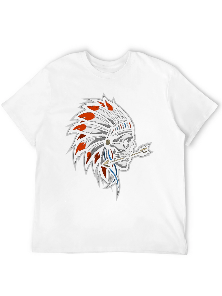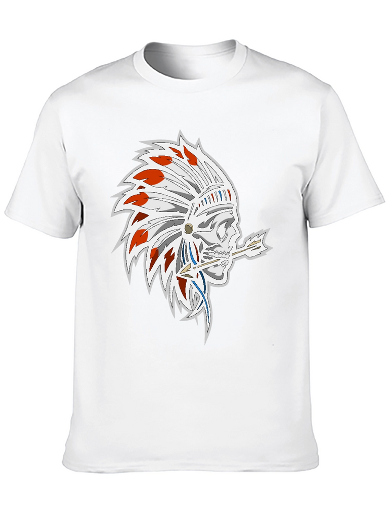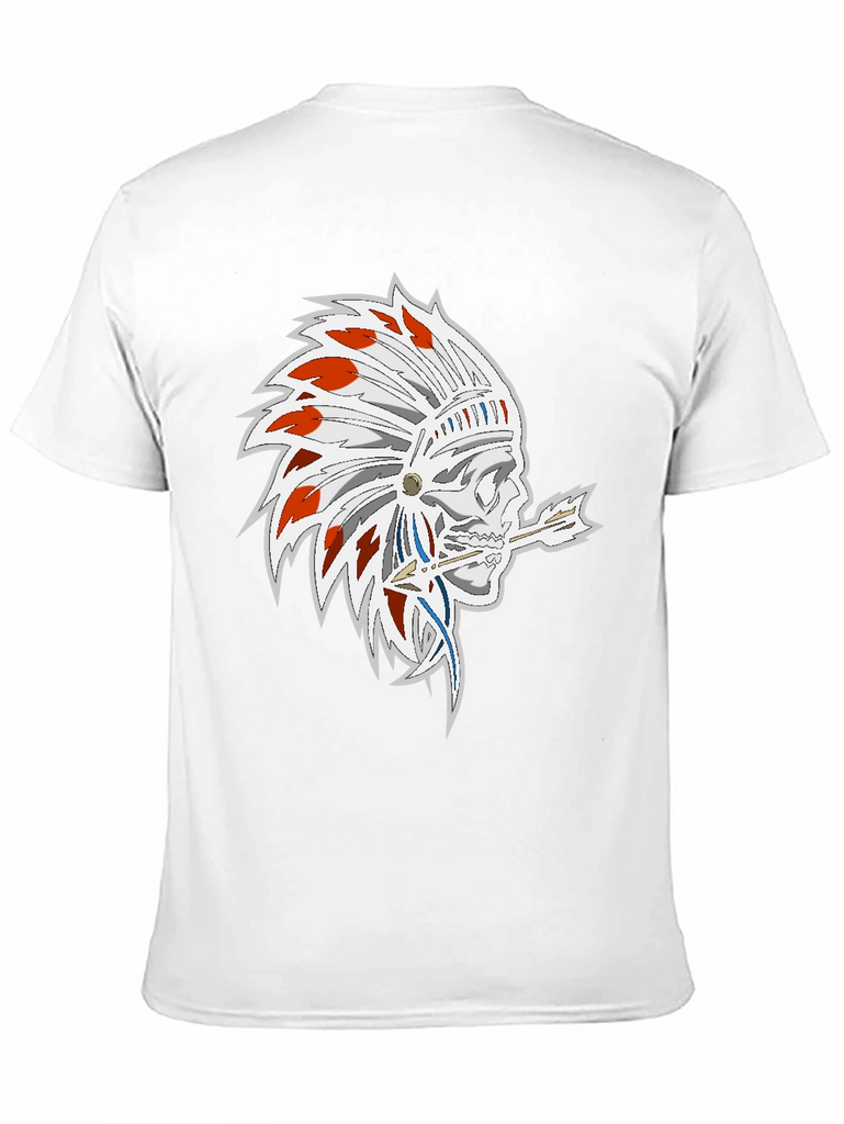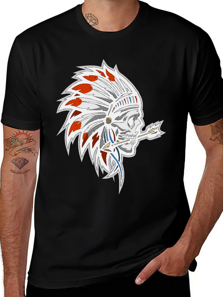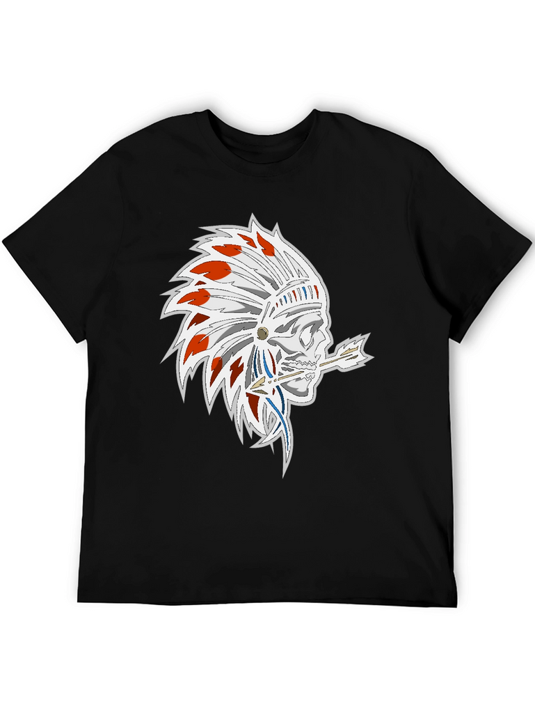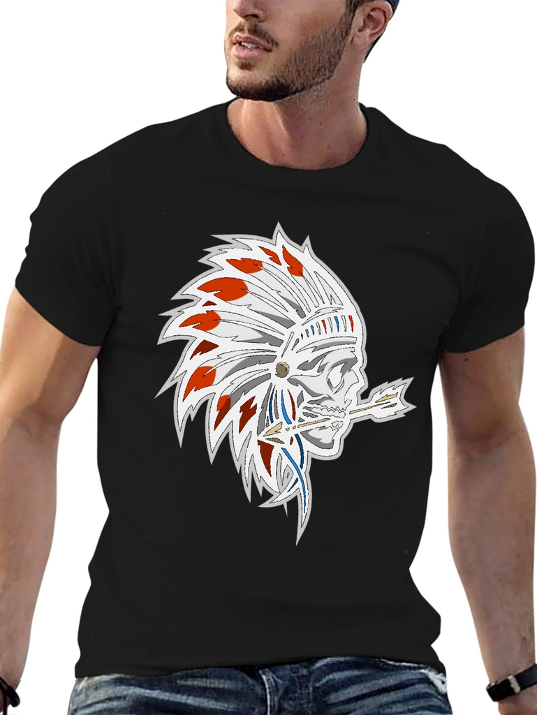 Rock this edgy black t-shirt featuring a striking graphic design. The design showcases a skull adorned with a traditional Native American headdress, complete with vibrant red and white feathers and an arrow piercing the skull. This unique piece is perfect for adding a bold statement to your casual wardrobe. Crafted from comfortable materials, this tee is ideal for everyday wear, concerts, or expressing your individual style. It pairs effortlessly with jeans, shorts, or layered under a jacket. Express your unique style with this eye-catching tee!