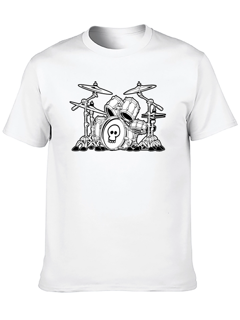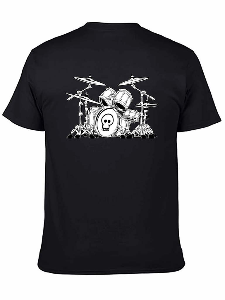 Show off your love of music with this striking black t-shirt featuring a graphic of a drum set with a skull design. This tee is perfect for musicians, music lovers, or anyone who appreciates edgy, artistic designs. Made from a soft, breathable fabric, this shirt offers both comfort and style. The stark contrast of the white graphic against the black background makes a bold statement. Wear it casually with jeans, shorts, or layer it under a jacket for a cool, everyday look. Great for concerts, band practices, or just hanging out.
