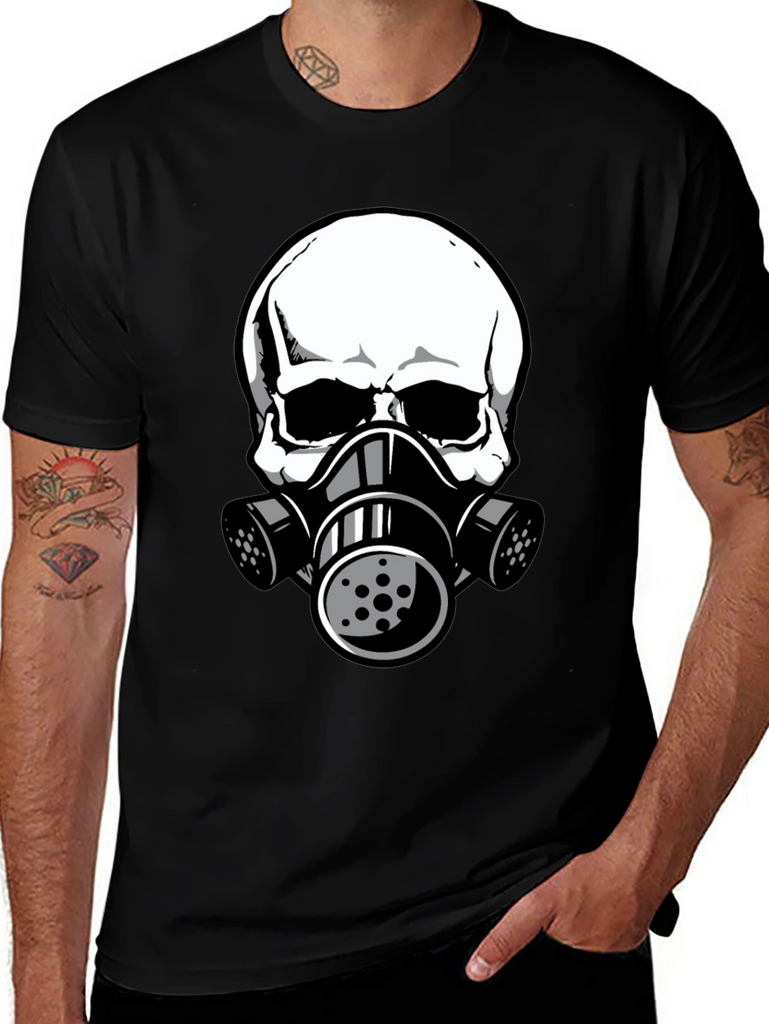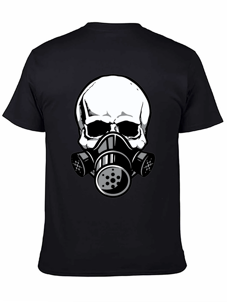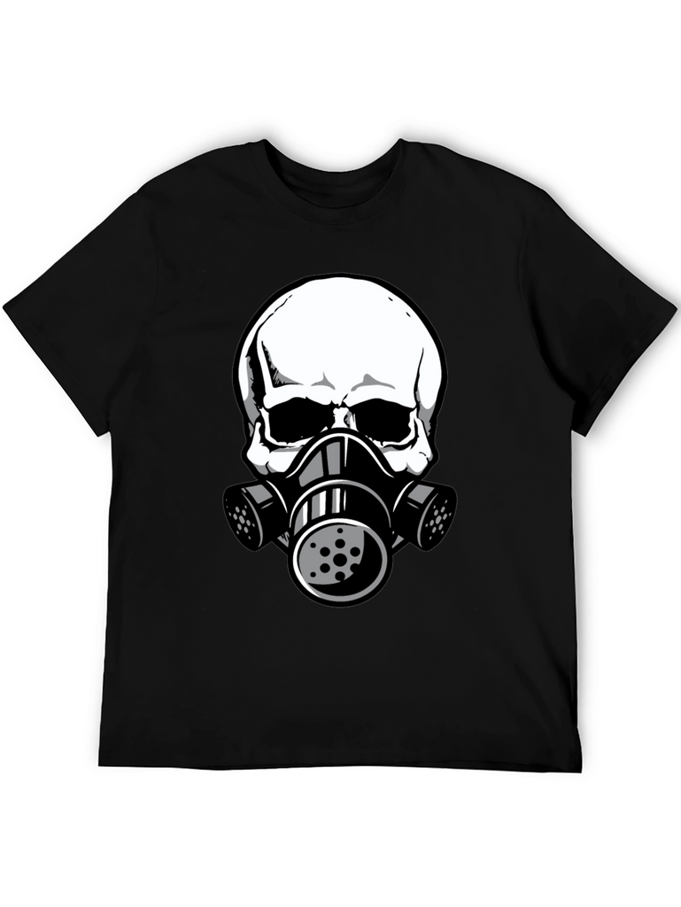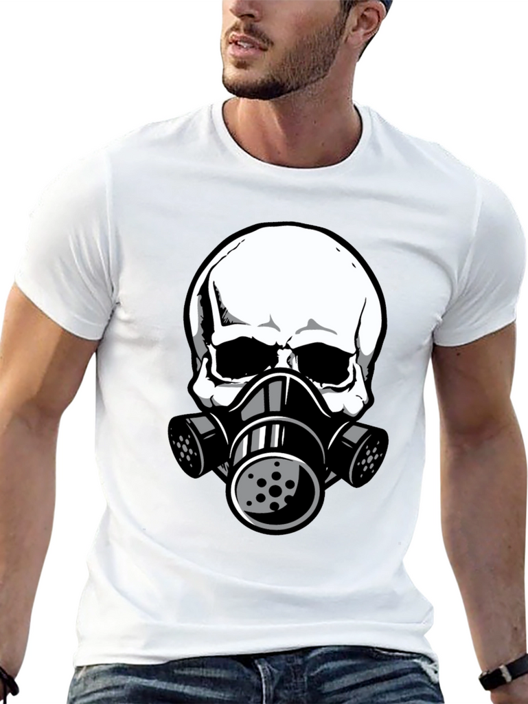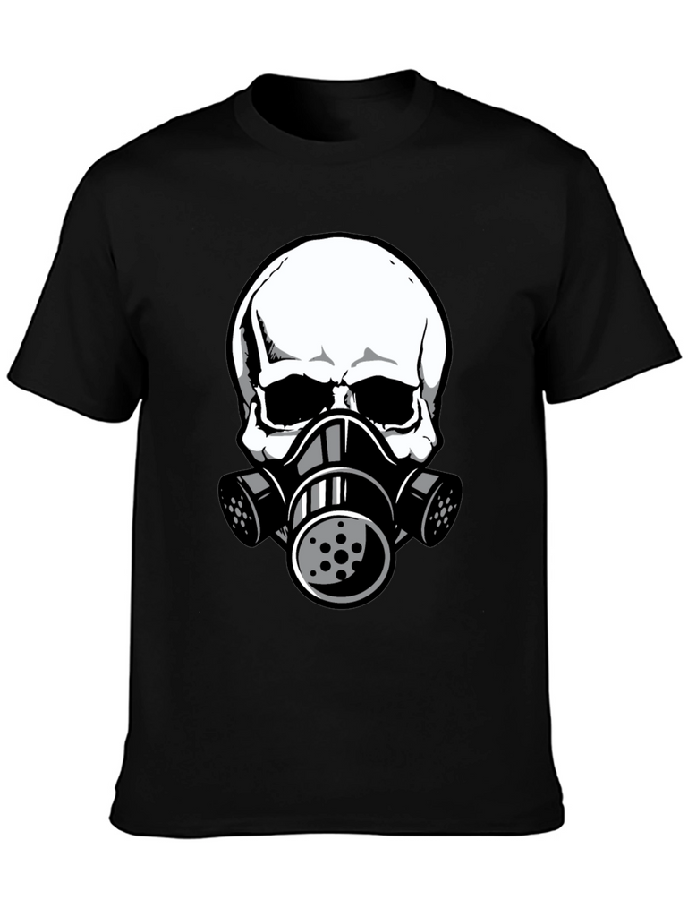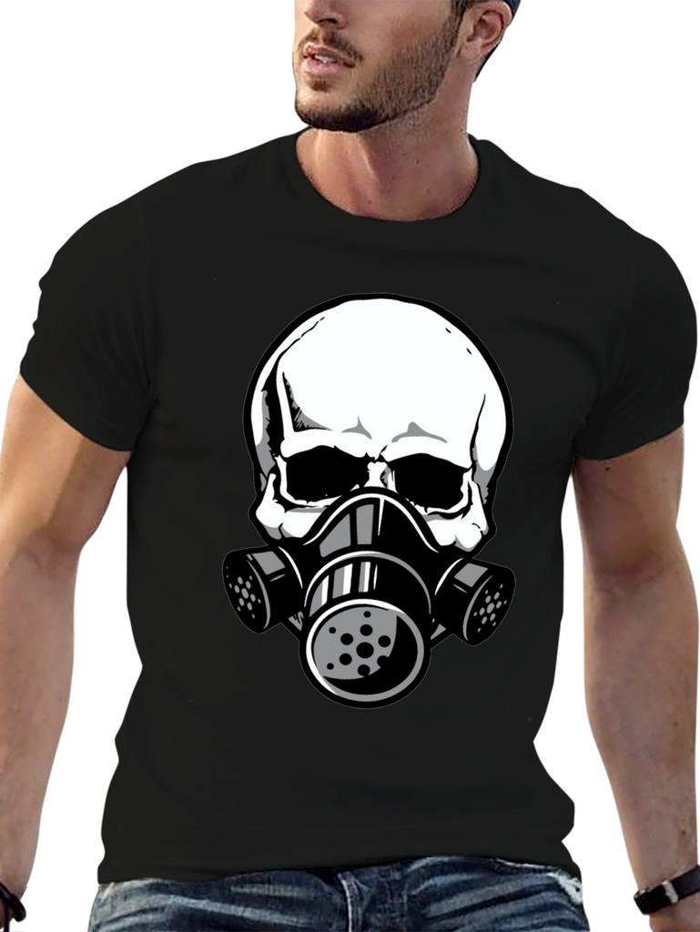 This black t-shirt features a striking graphic of a white skull wearing a gas mask. The design is bold and eye-catching, perfect for those who like unique and edgy apparel. The shirt appears to be made from comfortable, breathable fabric, making it ideal for everyday wear. The detailed graphic gives it a modern, urban feel. Wear it casually with jeans, shorts, or layer it under a jacket for a stylish statement. This tee is sure to turn heads and spark conversation. A great addition to any wardrobe!