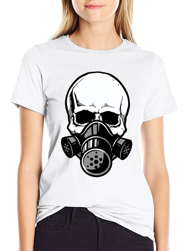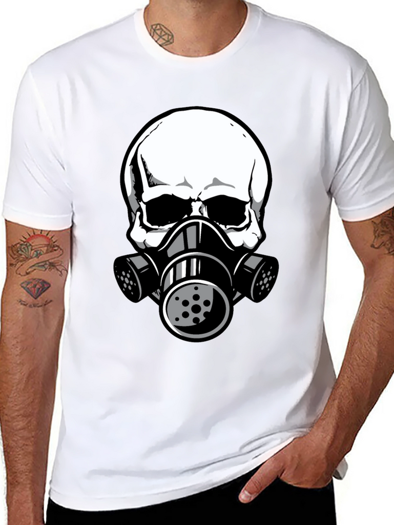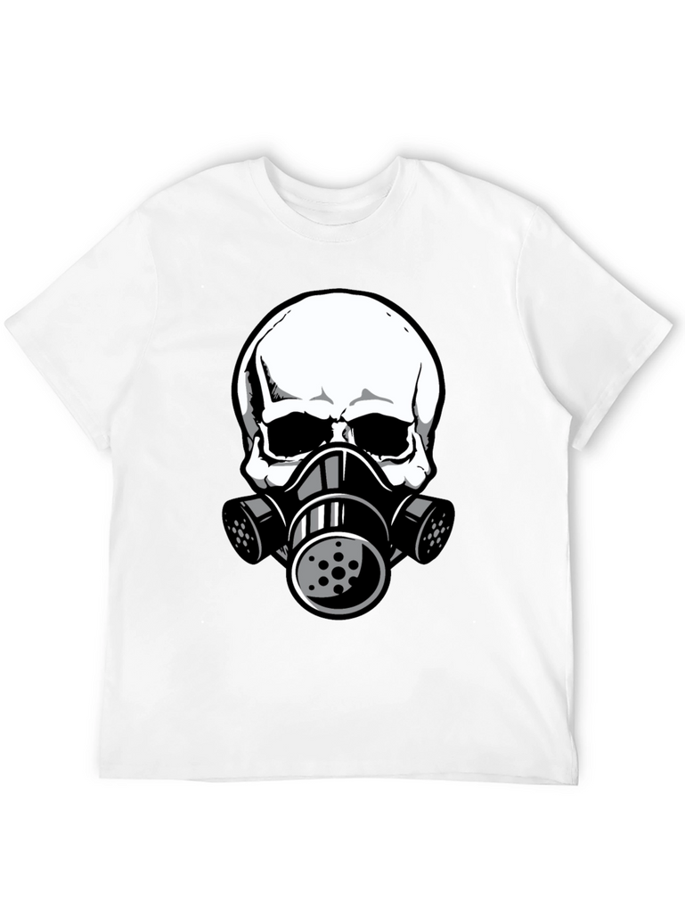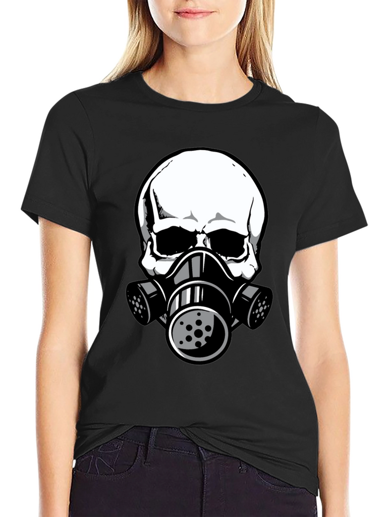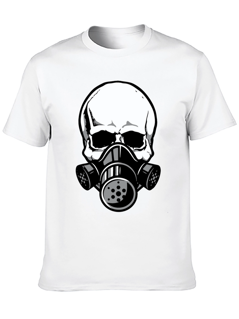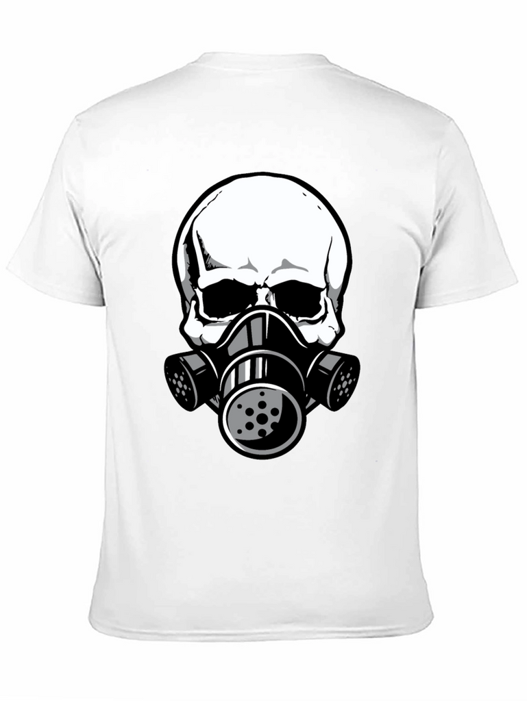 This black t-shirt features a striking graphic of a white skull wearing a gas mask. The design is bold and eye-catching, perfect for those who like unique and edgy apparel. The shirt appears to be made from comfortable, breathable fabric, making it ideal for everyday wear. The detailed graphic gives it a modern, urban feel. Wear it casually with jeans, shorts, or layer it under a jacket for a stylish statement. This tee is sure to turn heads and spark conversation. A great addition to any wardrobe!
