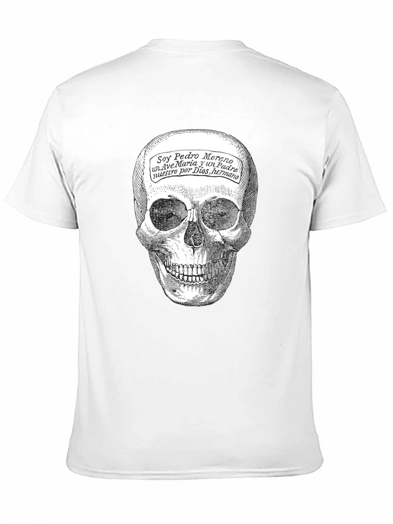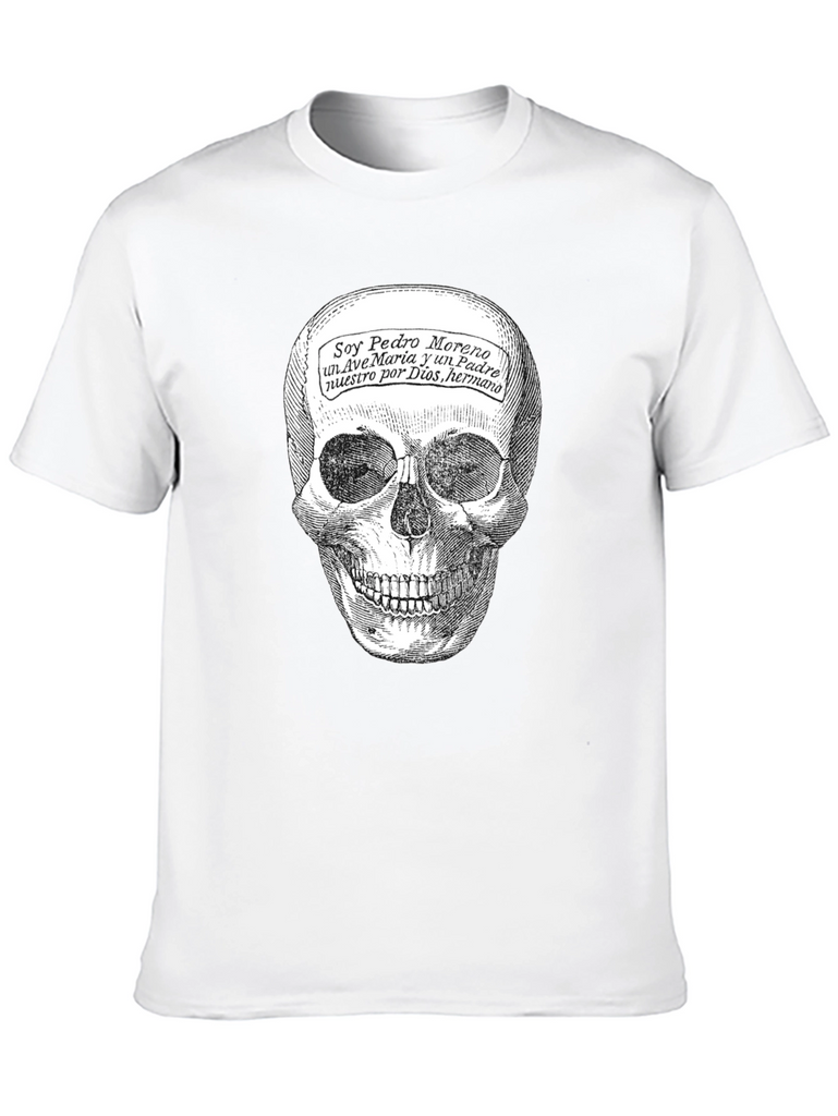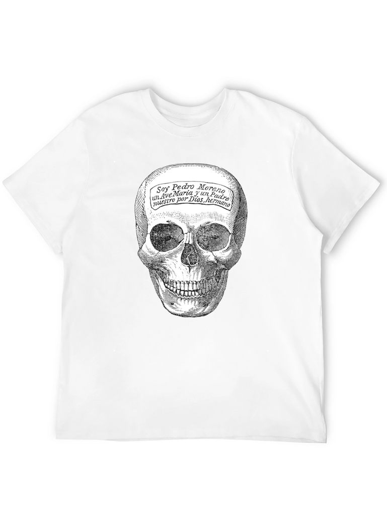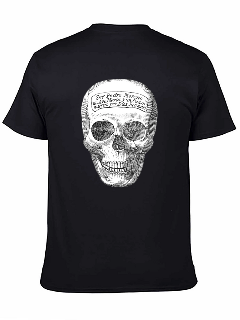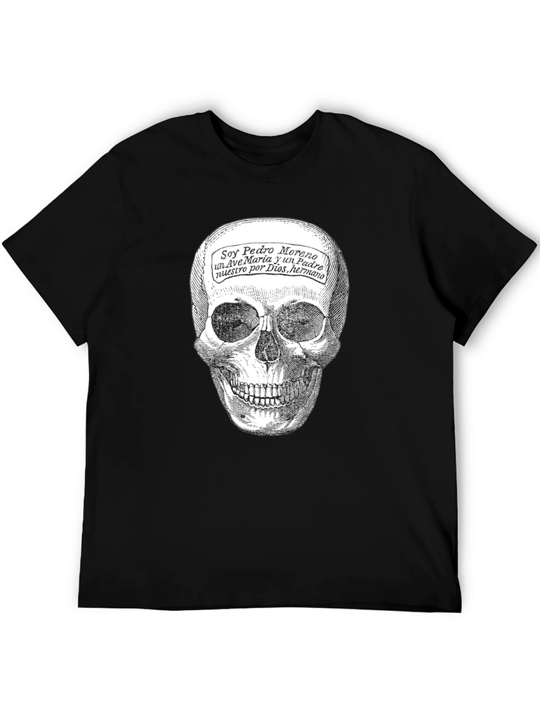 This black t-shirt features a striking skull graphic print that commands attention. The detailed skull design is complemented by script text overlayed on the forehead, adding an element of intrigue. Made from a soft, comfortable fabric, this tee is perfect for everyday wear. Its classic fit ensures a flattering silhouette for all body types. This shirt is ideal for those who appreciate alternative fashion or want to make a statement with their wardrobe. Wear it casually with jeans or dress it up with a blazer for a night out. It's also a great conversation starter and a unique addition to any t-shirt collection. Embrace your individuality and showcase your bold style with this eye-catching tee!
