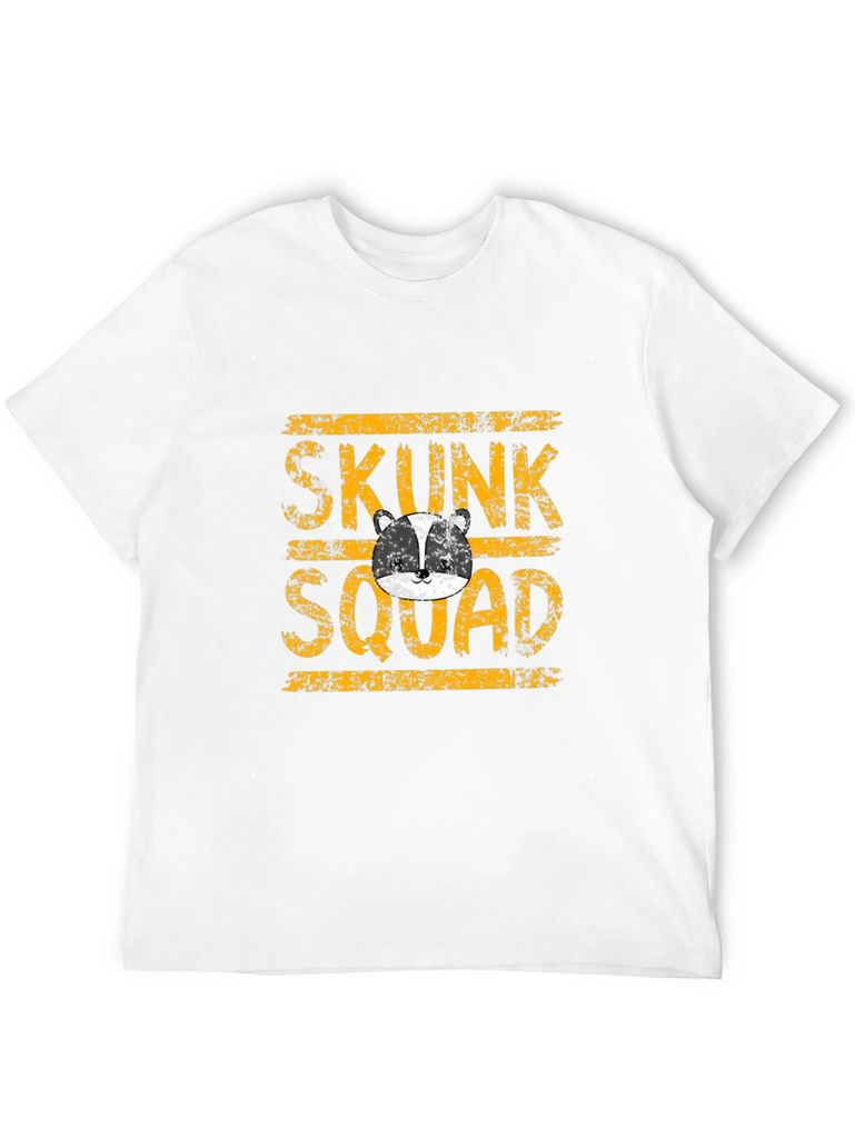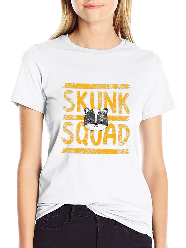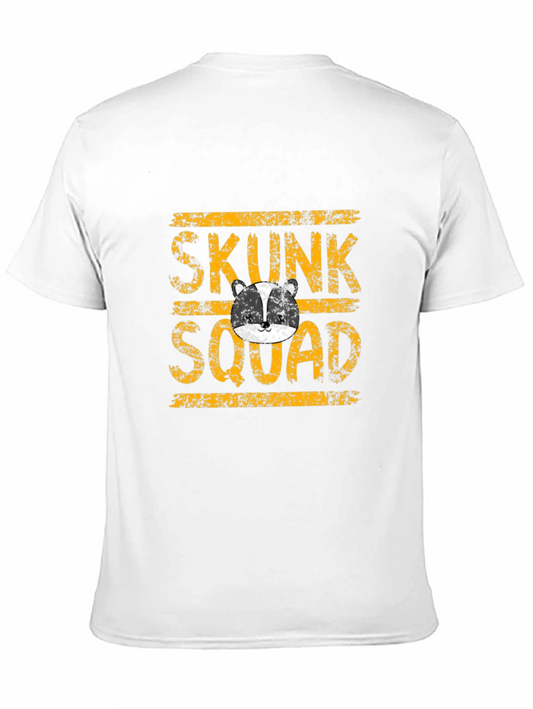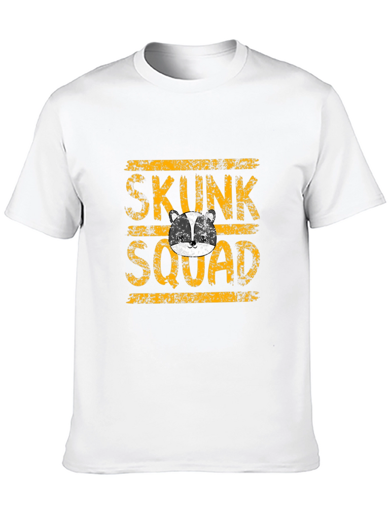 Show off your love for skunks with this unique graphic tee! This black t-shirt features a playful "Skunk Squad" design in a distressed, golden-yellow font. A cute skunk cartoon graphic is placed centrally, adding a fun touch. Made from what appears to be a soft, comfortable fabric, this shirt is perfect for casual wear. Ideal for animal lovers, nature enthusiasts, or anyone who enjoys quirky, eye-catching apparel. Wear it to the zoo, a casual hangout, or while relaxing at home. Grab yours today and join the Skunk Squad!