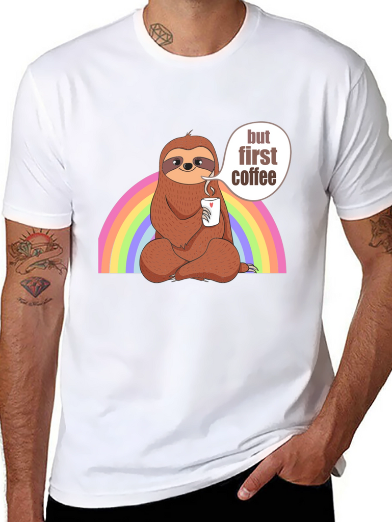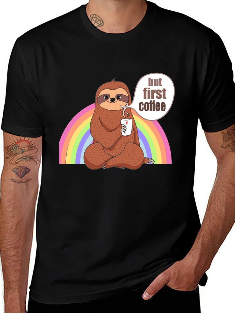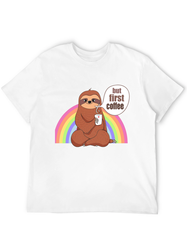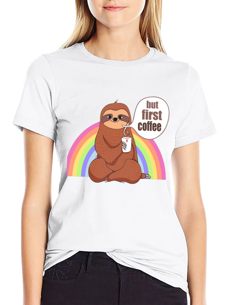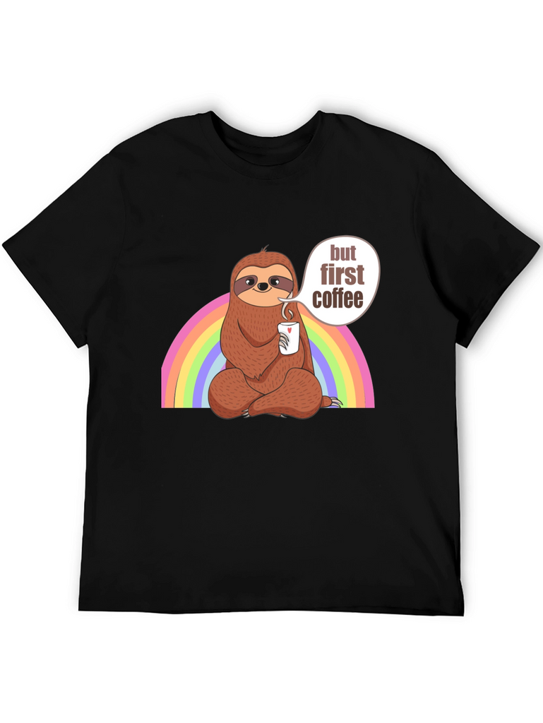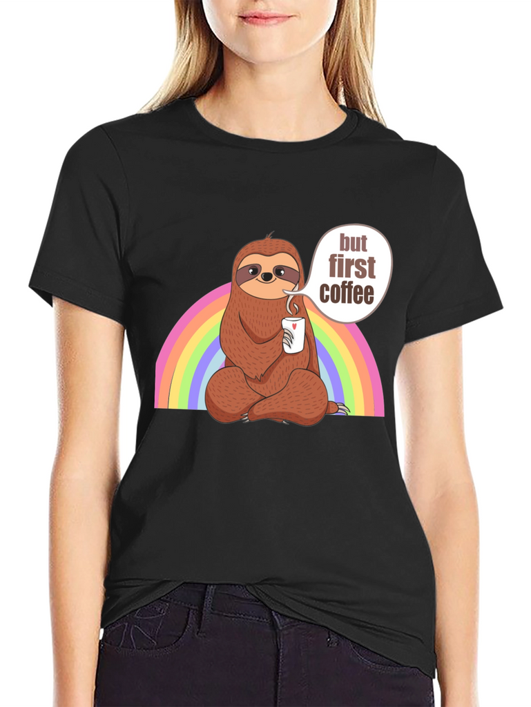 This black t-shirt features a cute sloth design with a rainbow backdrop. The sloth is holding a coffee cup and the phrase "but first coffee" is in a speech bubble. The shirt appears to be made of a comfortable, breathable material, making it perfect for everyday wear. Ideal for casual outings, lounging at home, or as a fun gift for coffee lovers and sloth enthusiasts. Show off your laid-back style with this unique and eye-catching tee!