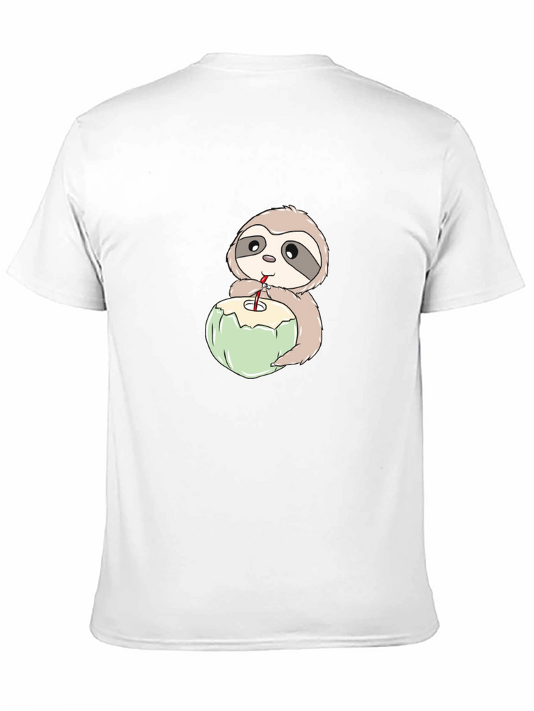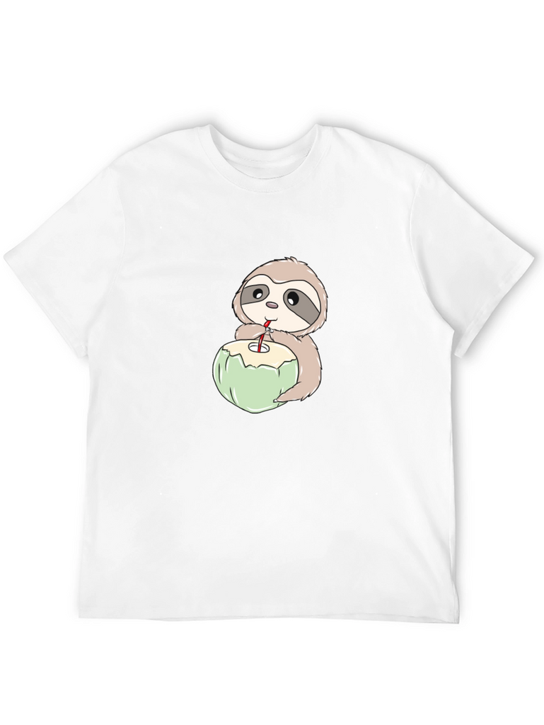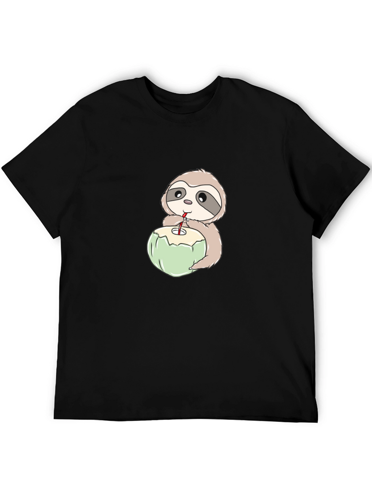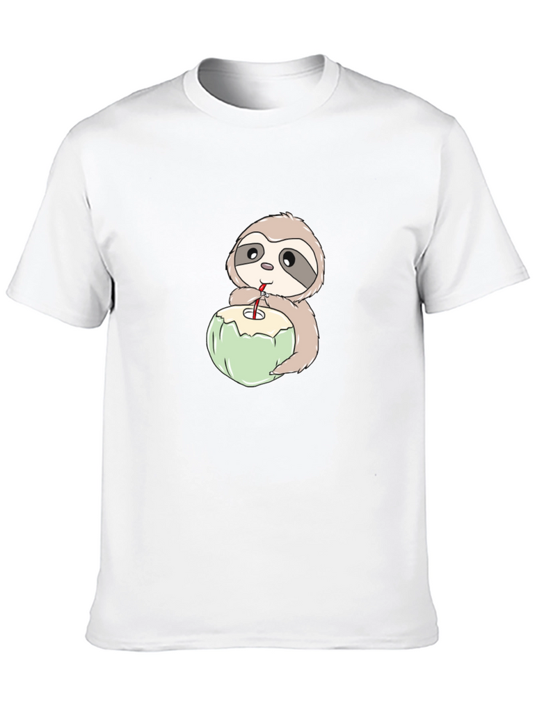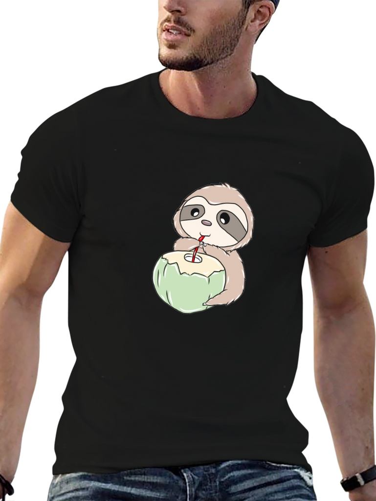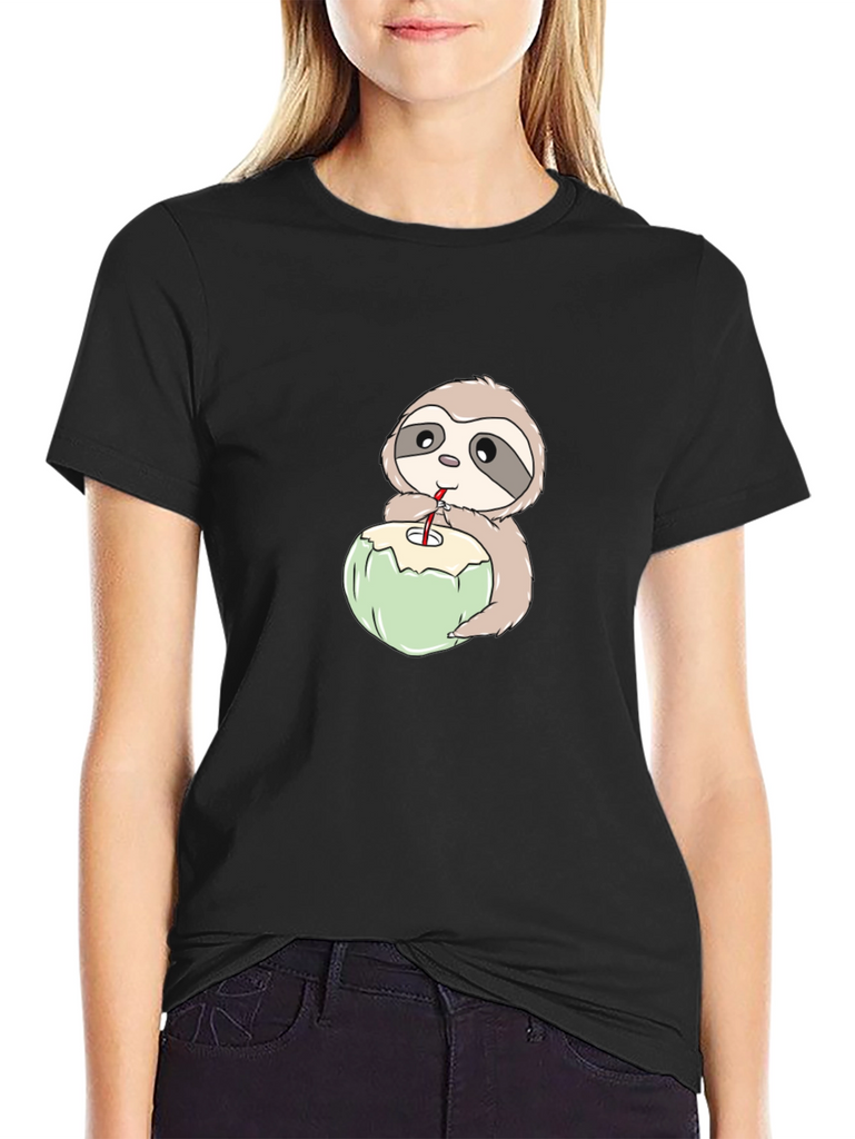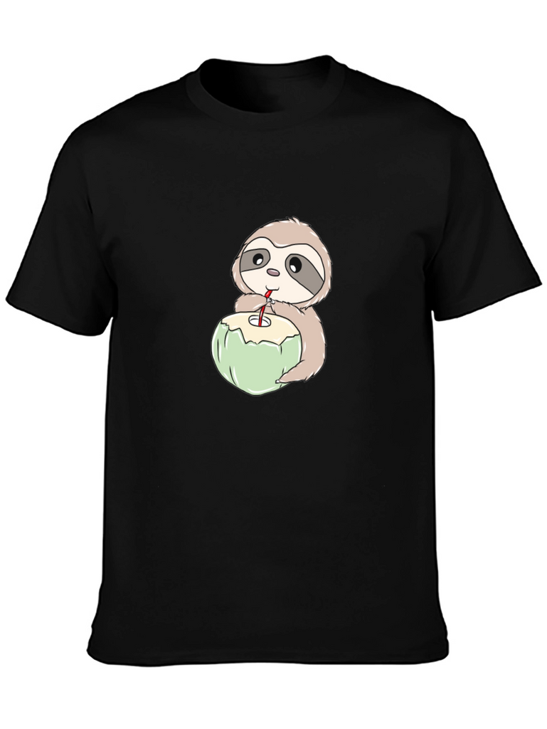 This adorable t-shirt features a cute cartoon sloth enjoying a refreshing coconut drink! The design is printed on a soft, comfortable black fabric, perfect for everyday wear. The charming sloth graphic adds a touch of whimsy to your wardrobe. Made from a breathable material, this shirt ensures comfort all day long. It's a fantastic choice for casual outings, lounging at home, or as a unique gift for sloth lovers. Show off your fun side with this delightful and eye-catching t-shirt.