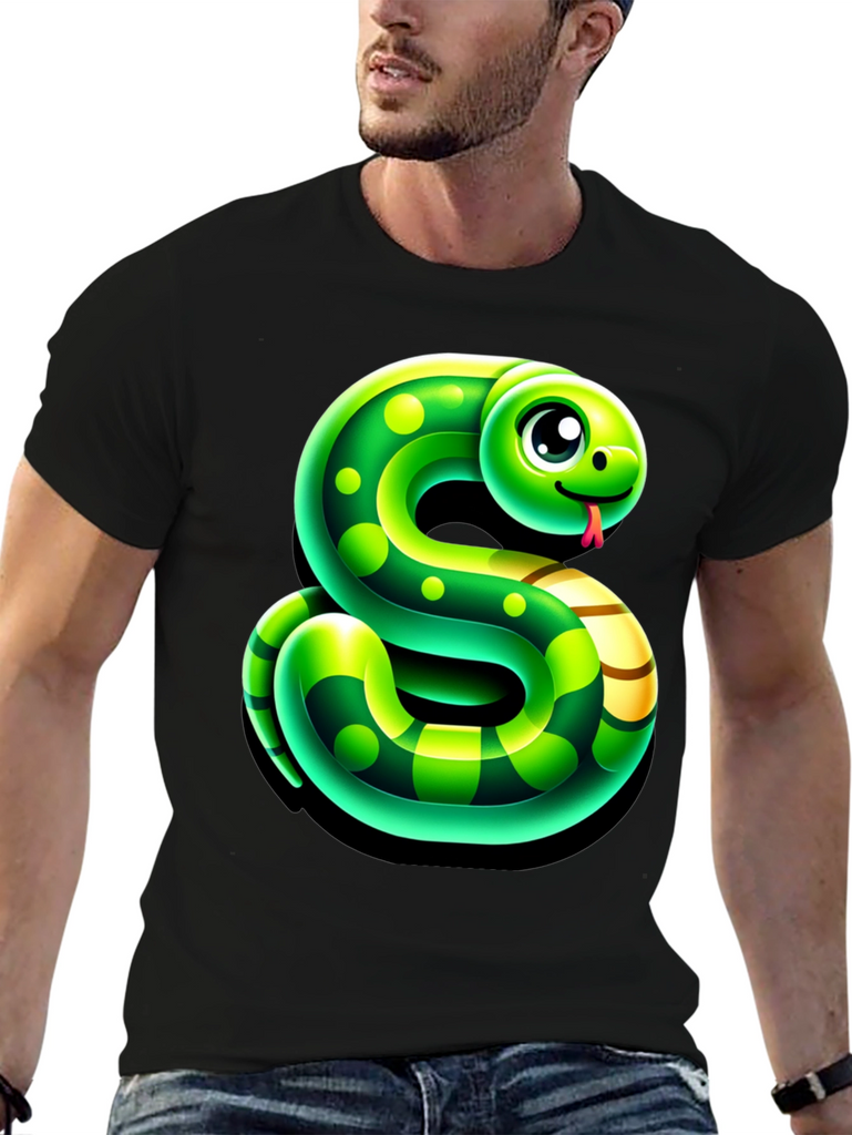 Show off your fun side with this eye-catching black tee! This shirt features a vibrant cartoon-style snake graphic in bright greens and yellows, designed to look like the letter 'S'. The playful design is perfect for casual wear, parties, or anyone who loves whimsical fashion. Made from comfortable, breathable fabric, this shirt is as comfortable as it is stylish. Stand out in the crowd and let your personality shine through with this unique and charming tee!