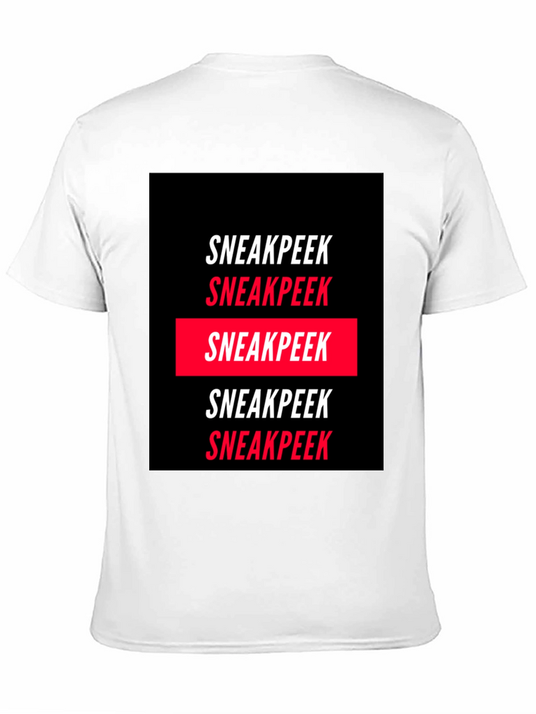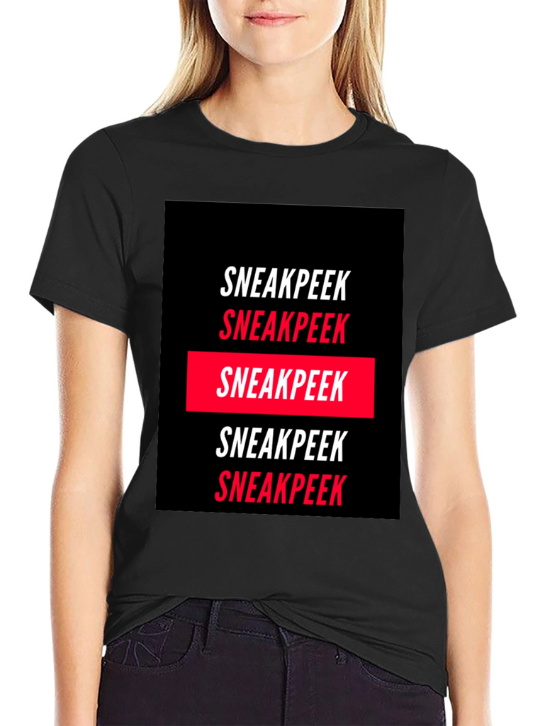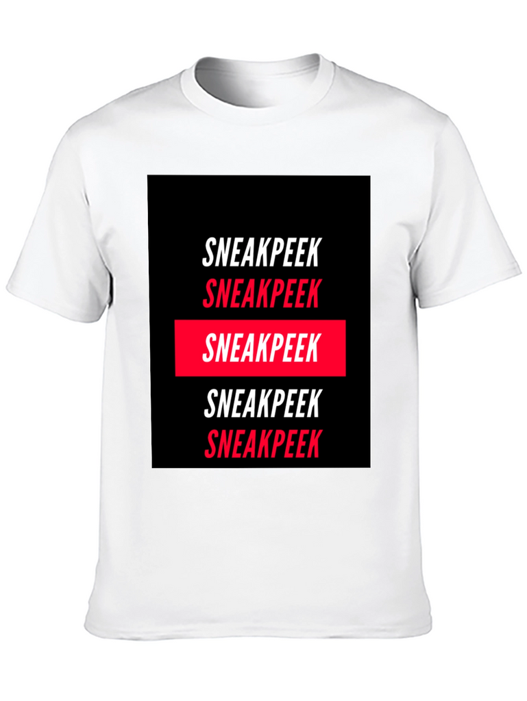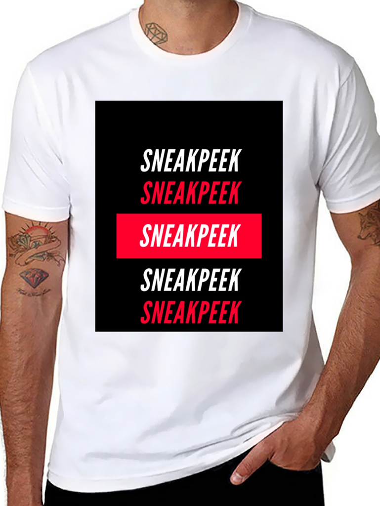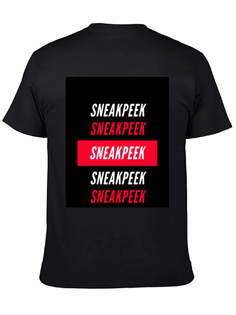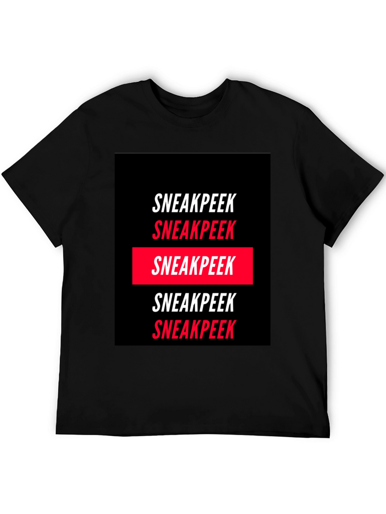 Elevate your wardrobe with this statement Sneakpeek graphic tee. Crafted from a comfortable, soft fabric, this tee features a bold, repetitive print of the word "Sneakpeek" in a striking black and red color scheme. The design is modern and eye-catching, making it perfect for casual wear, streetwear fashion, or adding a unique touch to your everyday look. Pair it with jeans, shorts, or joggers for a cool and confident style. Showcase your individual style with this trendy tee.