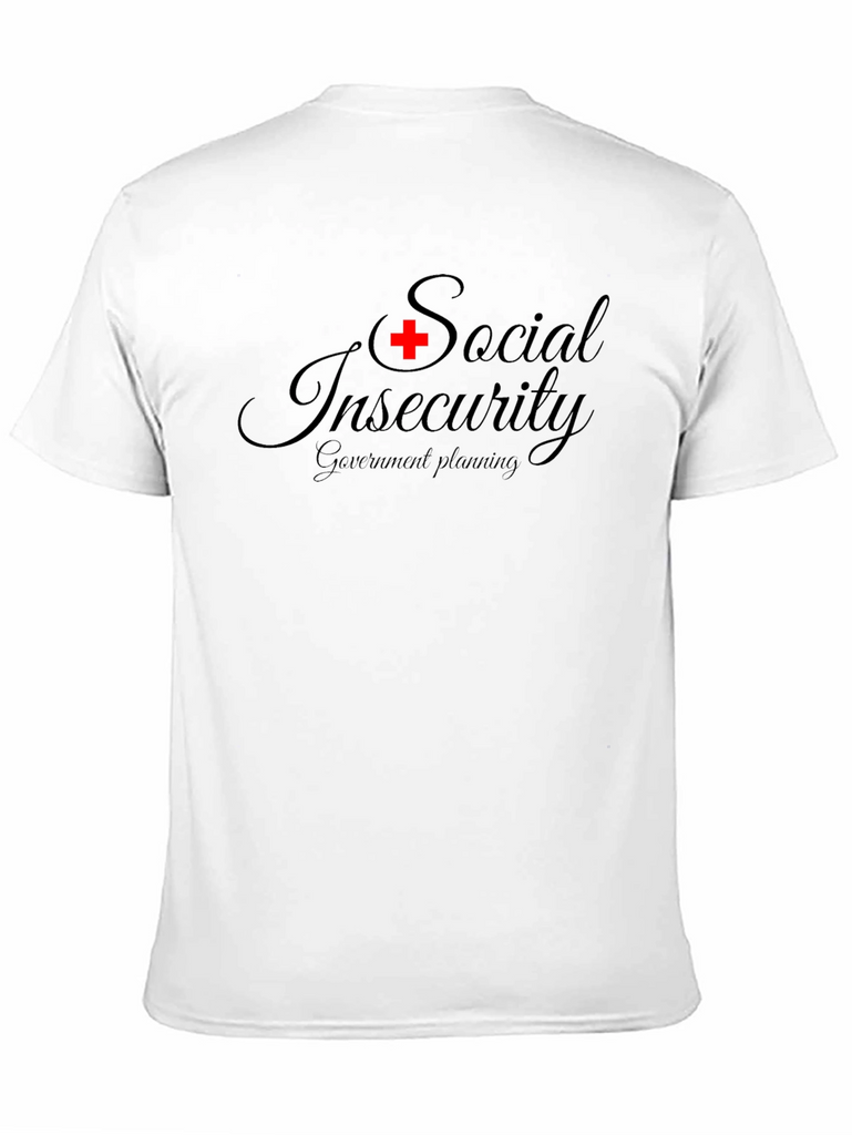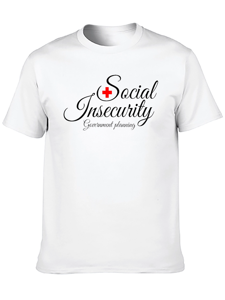 Show off your unique sense of humor with this eye-catching black t-shirt! The shirt features a witty graphic design that reads "Social Insecurity" in a stylish font, complete with a red cross symbol for a playful twist. The phrase "Government Planning" sits below, adding another layer of intrigue. Made from a soft, comfortable material, this tee is perfect for everyday wear. Dress it up or down, it's versatile for casual outings, social gatherings, or simply lounging at home. Stand out from the crowd with this conversation-starting piece!
