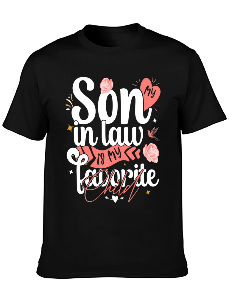 Show your love and appreciation for your son-in-law with this unique graphic t-shirt. Featuring a fun and heartwarming design that reads "Son in Law is my Favorite Child", adorned with floral accents and a heart detail. This eye-catching tee is perfect for casual wear, family gatherings, or as a thoughtful gift for your beloved son-in-law. Made from comfortable materials, it offers a great fit and is sure to bring a smile to anyone's face. Celebrate the special bond with your family with this awesome t-shirt!