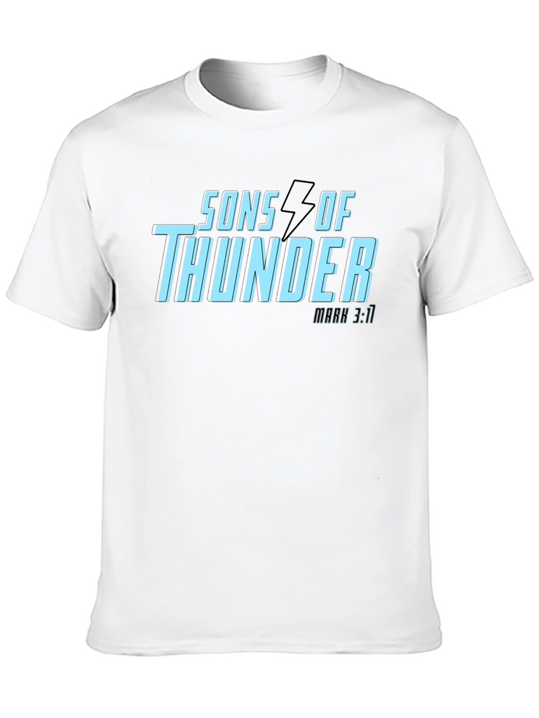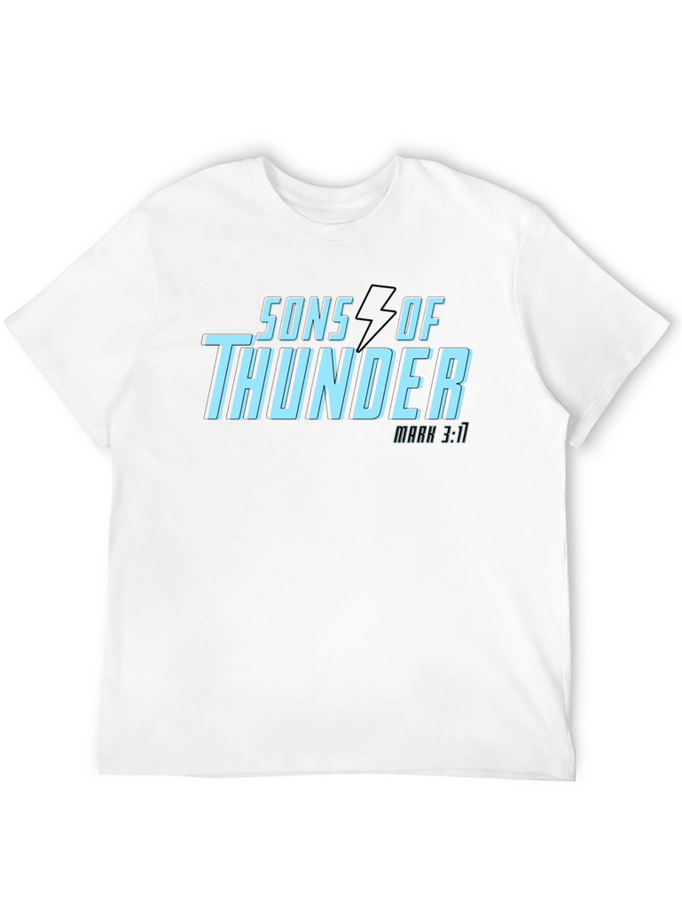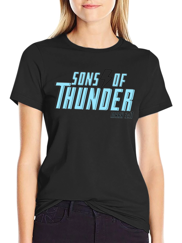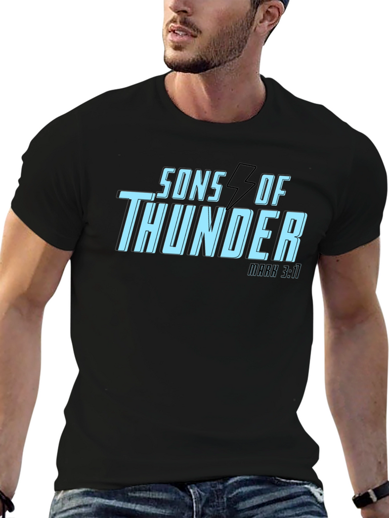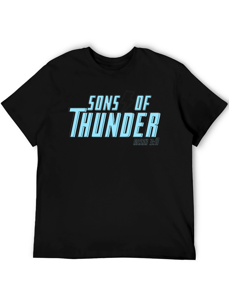 Show your faith with this stylish black t-shirt featuring a bold "Sons of Thunder" graphic in blue. This eye-catching design also includes a lightning bolt and "Mark 3:17." Made from a soft and comfortable fabric blend, this classic fit tee is perfect for everyday wear, church events, or casual outings. Let your shirt be a conversation starter and share your beliefs with the world. Durable and easy to care for, this tee will become a staple in your wardrobe.