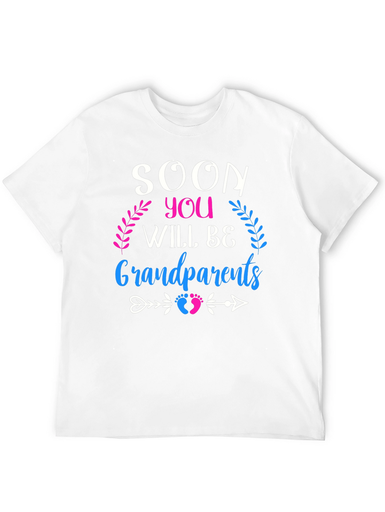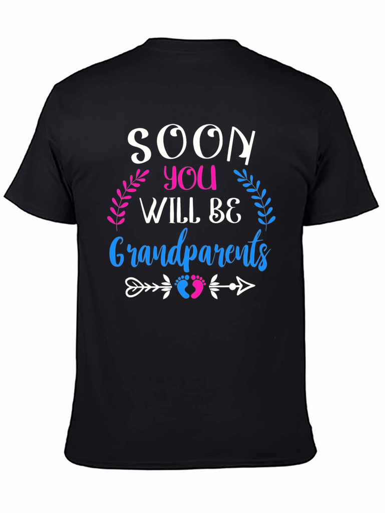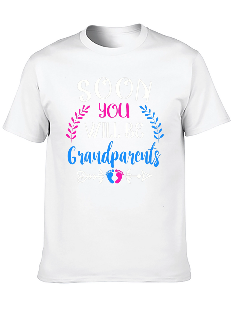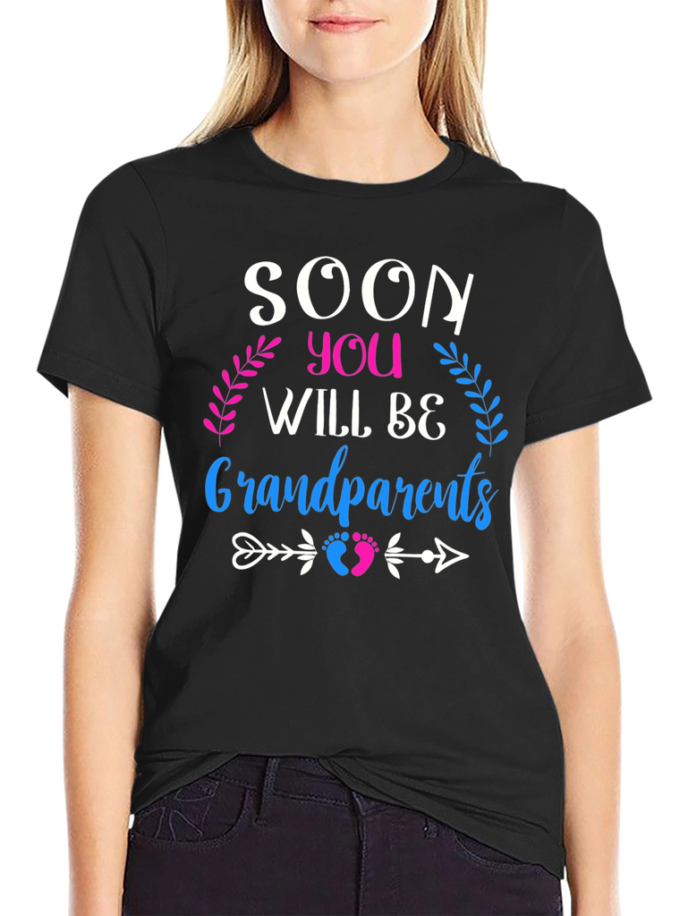 Announce the exciting news with this adorable 'Soon You Will Be Grandparents' T-shirt. Crafted from a soft, breathable fabric, this classic fit tee features a charming design with the words 'SOON YOU WILL BE Grandparents' in a playful mix of colors. Pink and blue leafy accents and tiny footprints add a sweet touch. This shirt is perfect for the expecting parents to wear at family gatherings, baby showers, or casual outings. It will bring joy and anticipation to the soon-to-be grandparents. A memorable keepsake for this special milestone!
