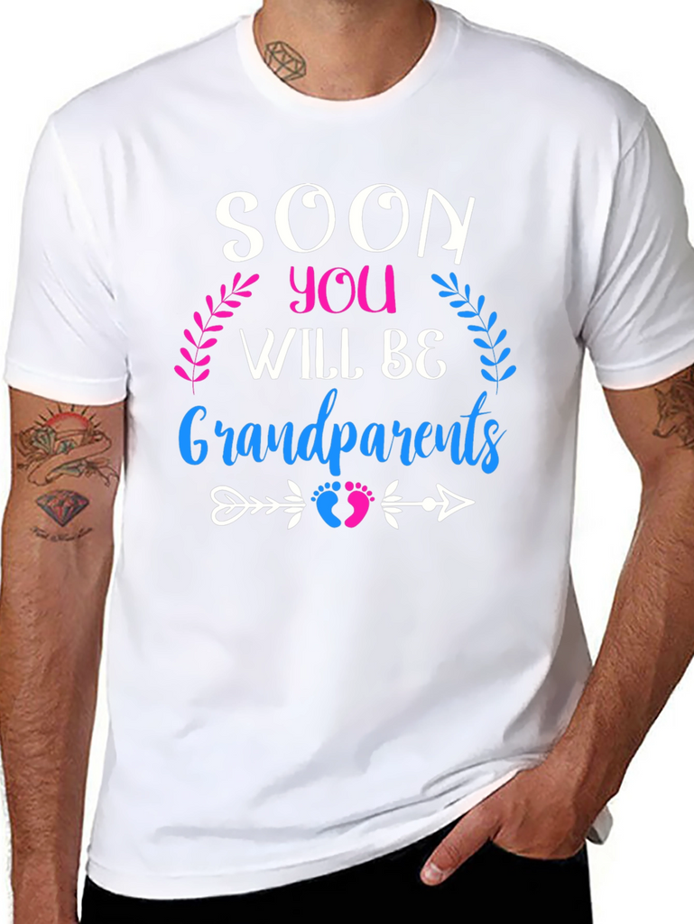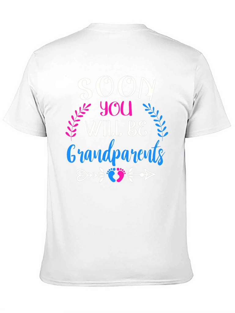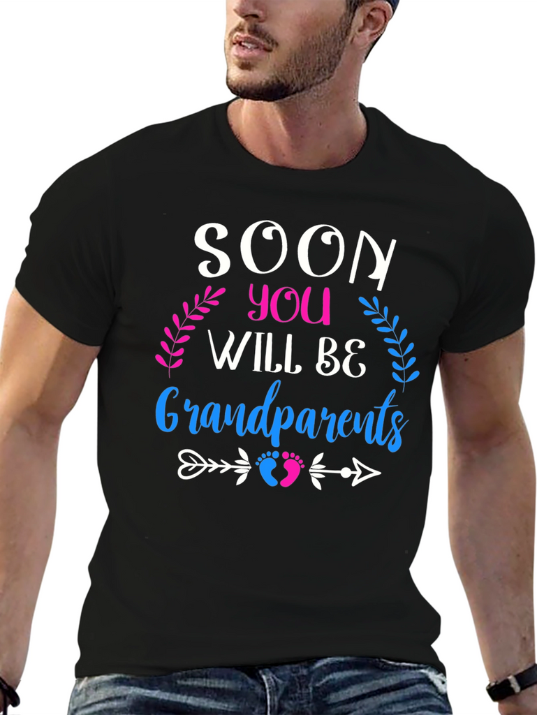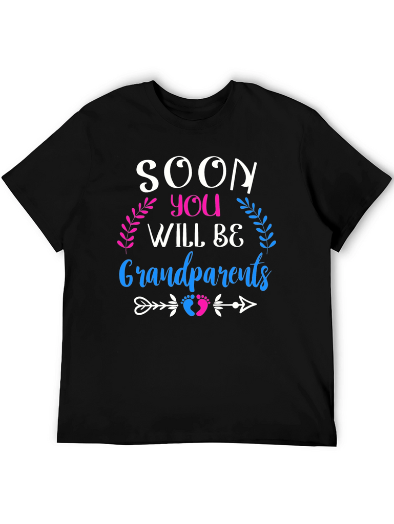 Announce the exciting news with this adorable 'Soon You Will Be Grandparents' T-shirt. Crafted from a soft, breathable fabric, this classic fit tee features a charming design with the words 'SOON YOU WILL BE Grandparents' in a playful mix of colors. Pink and blue leafy accents and tiny footprints add a sweet touch. This shirt is perfect for the expecting parents to wear at family gatherings, baby showers, or casual outings. It will bring joy and anticipation to the soon-to-be grandparents. A memorable keepsake for this special milestone!