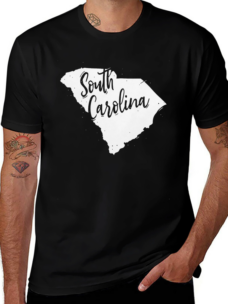 Show your South Carolina pride with this stylish black t-shirt. The shirt features a white silhouette of the state of South Carolina with the state's name elegantly inscribed. Made from soft, comfortable fabric, this tee is perfect for everyday wear. Whether you're a native, a transplant, or simply a fan of the Palmetto State, this shirt is a great way to show your love. Wear it to casual outings, sporting events, or just lounging at home. A must-have for any South Carolina enthusiast!