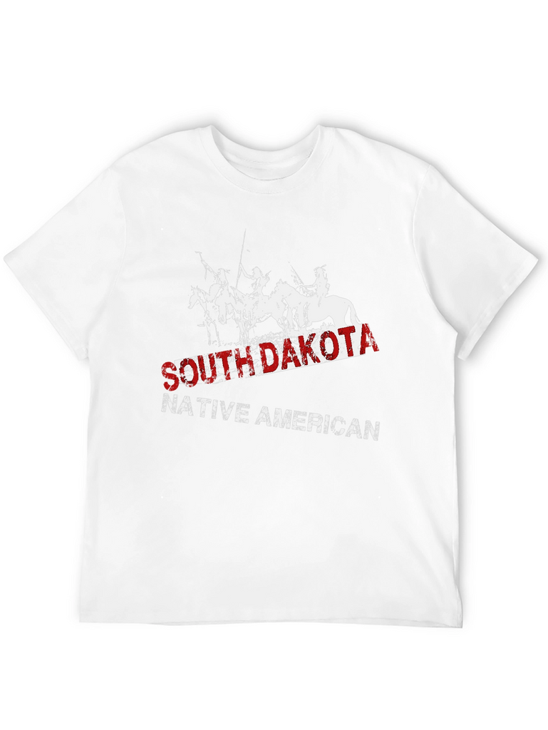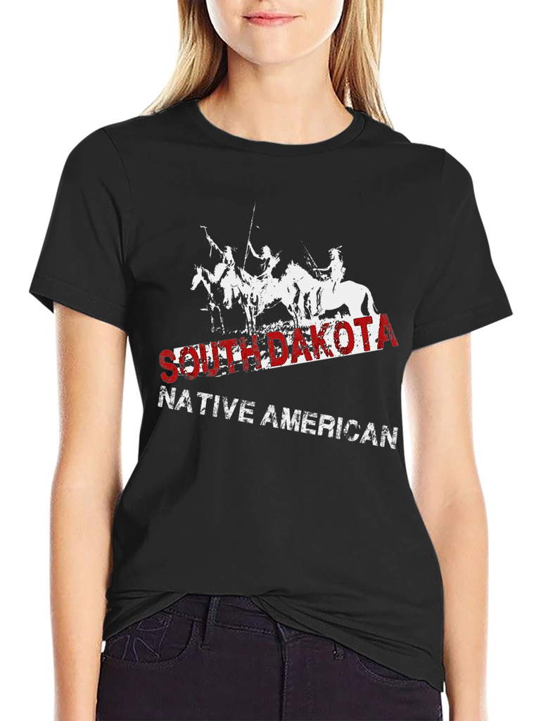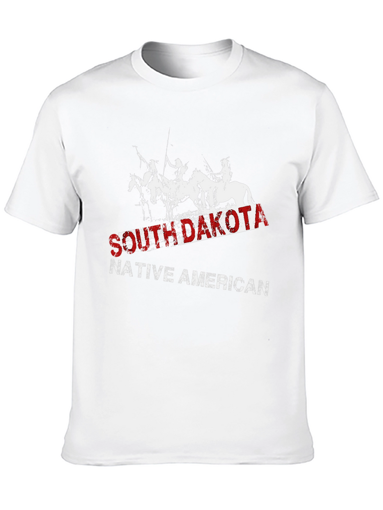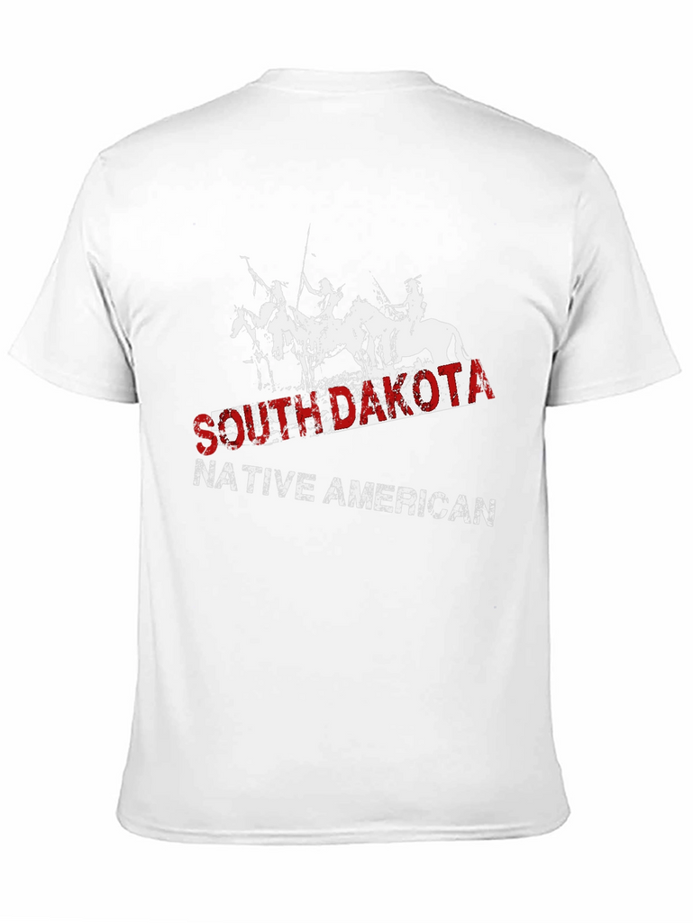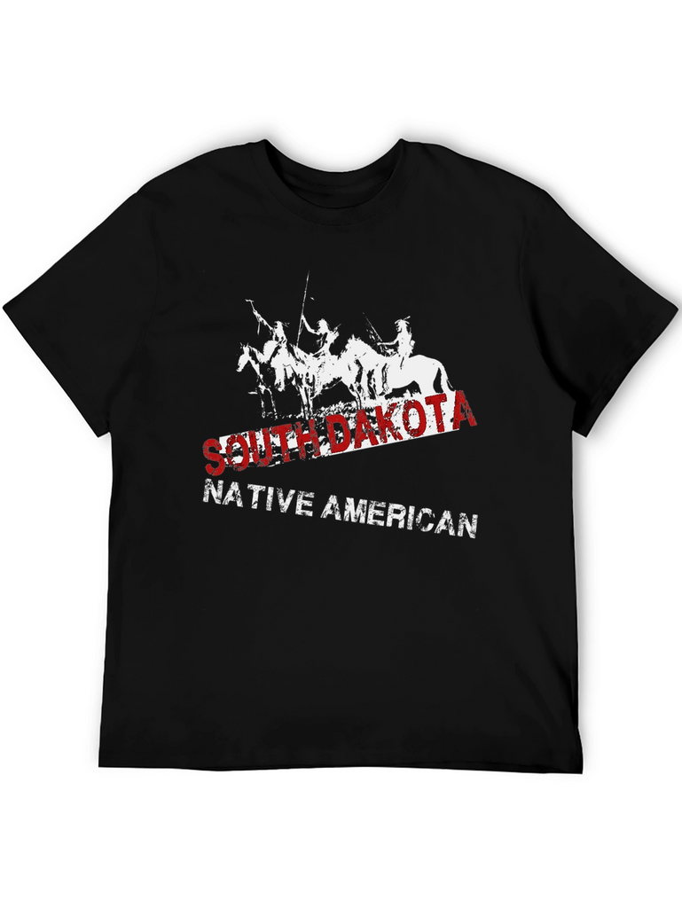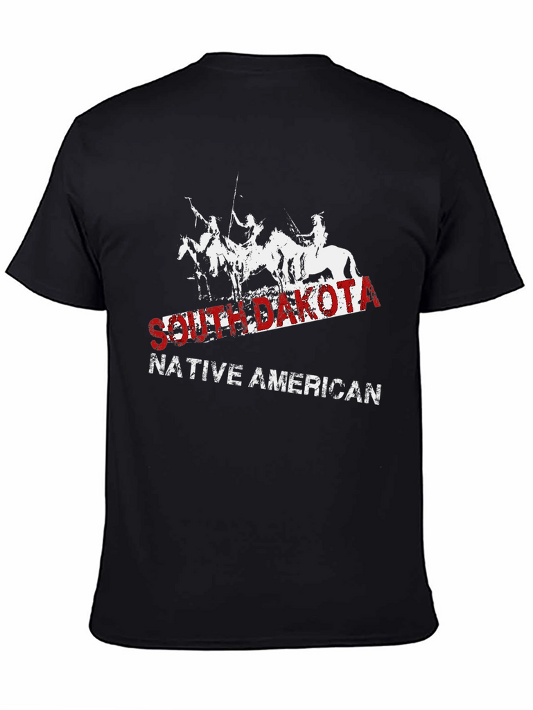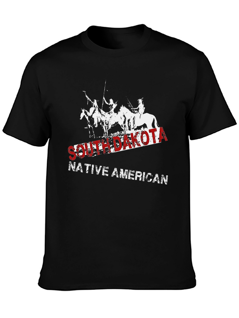 Show your pride with this South Dakota Native American t-shirt. This striking black tee features a distressed graphic of Native Americans on horseback, overlaid with the text "SOUTH DAKOTA" in bold red lettering and "NATIVE AMERICAN" in white. The classic fit and soft fabric make it comfortable for everyday wear. Perfect for casual outings, history buffs, or anyone wanting to celebrate Native American heritage. Make a statement and honor the spirit of the South Dakota Native Americans with this unique and stylish t-shirt.