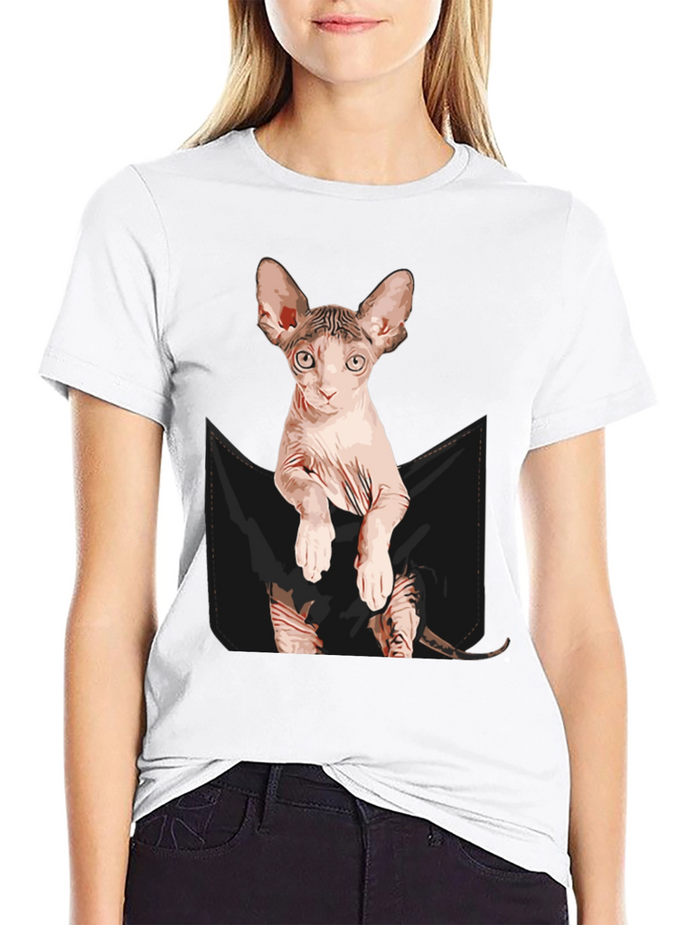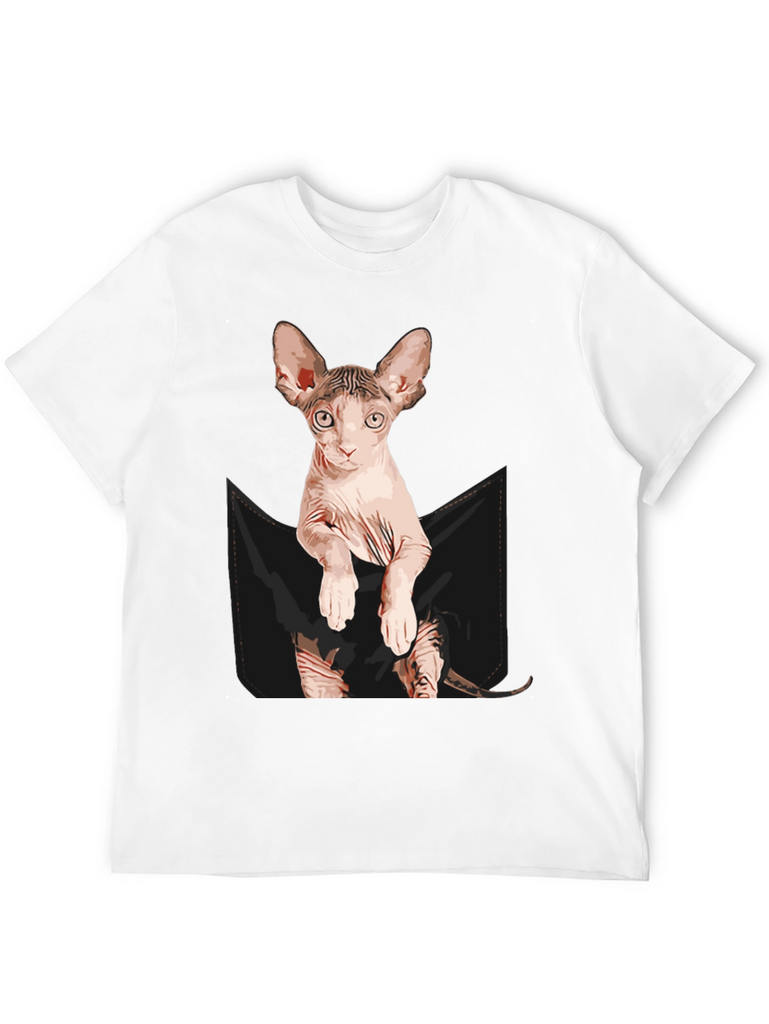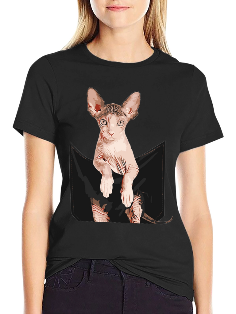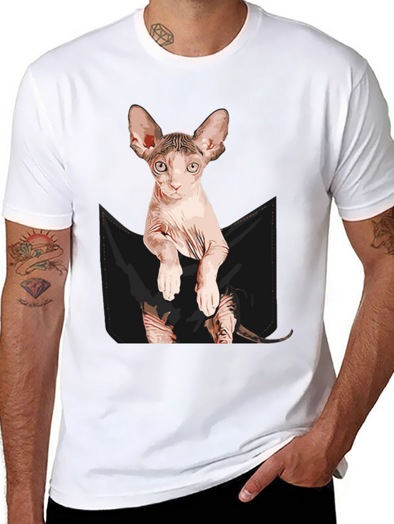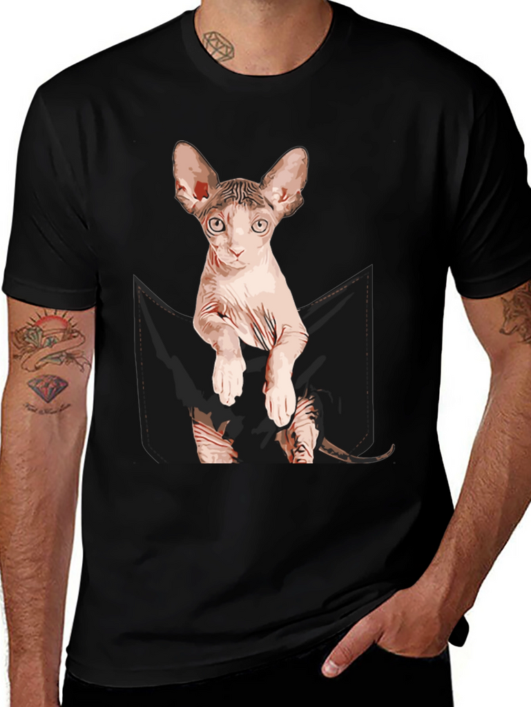 Show off your love for cats with this unique and eye-catching t-shirt! This black tee features a realistic graphic of a Sphynx cat peering out of a faux pocket design. The design is printed with vivid colors and attention to detail, creating a fun and playful look. Made from a soft, comfortable fabric blend, this t-shirt is perfect for everyday wear. Great for casual outings, lounging at home, or as a conversation starter for cat lovers. A must-have addition to any cat enthusiast's wardrobe, and it also makes a perfect gift!