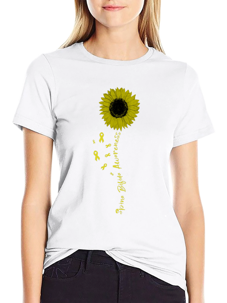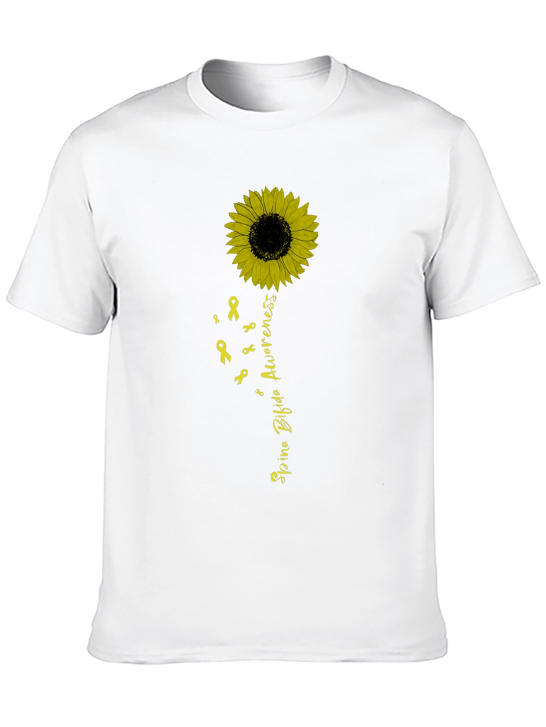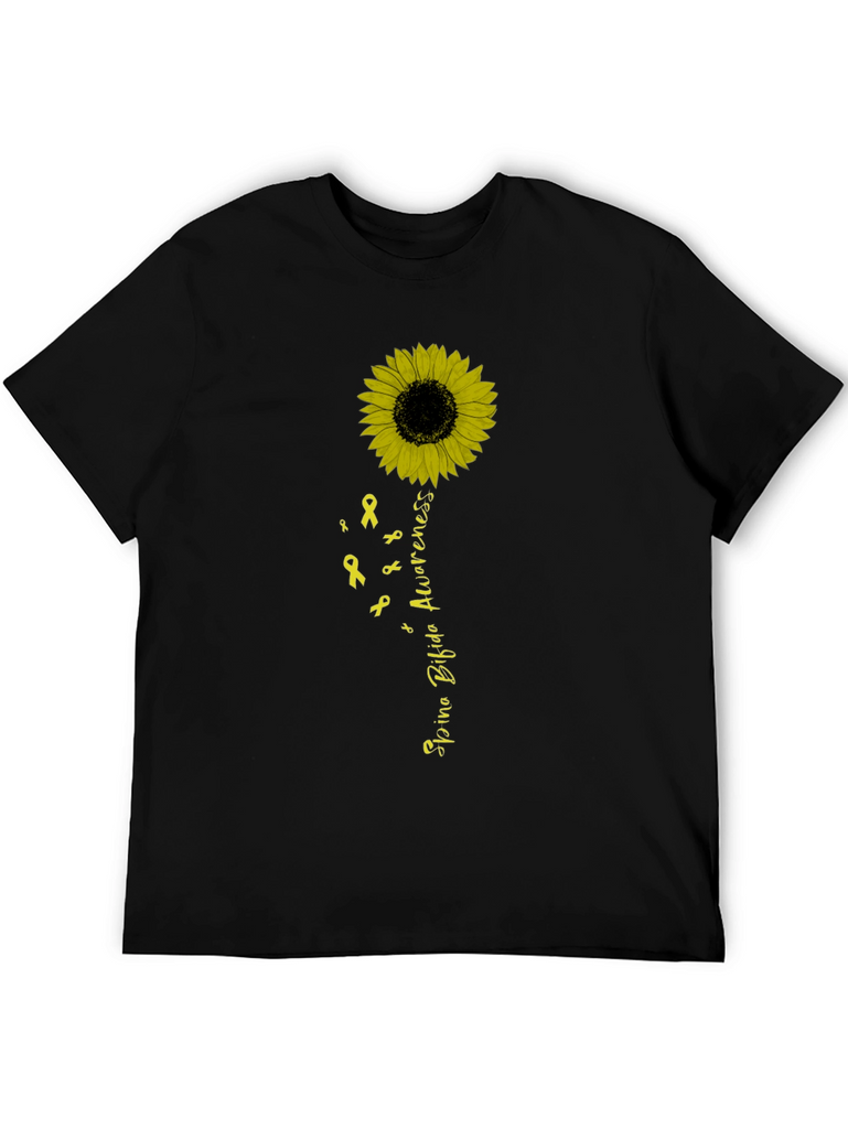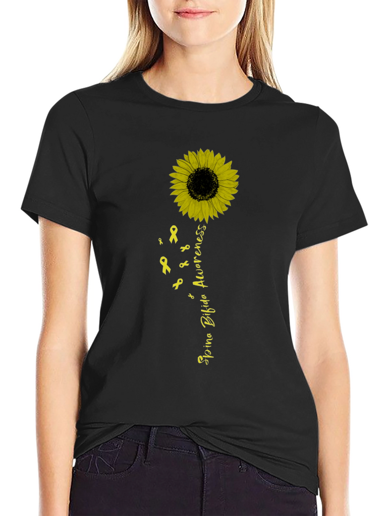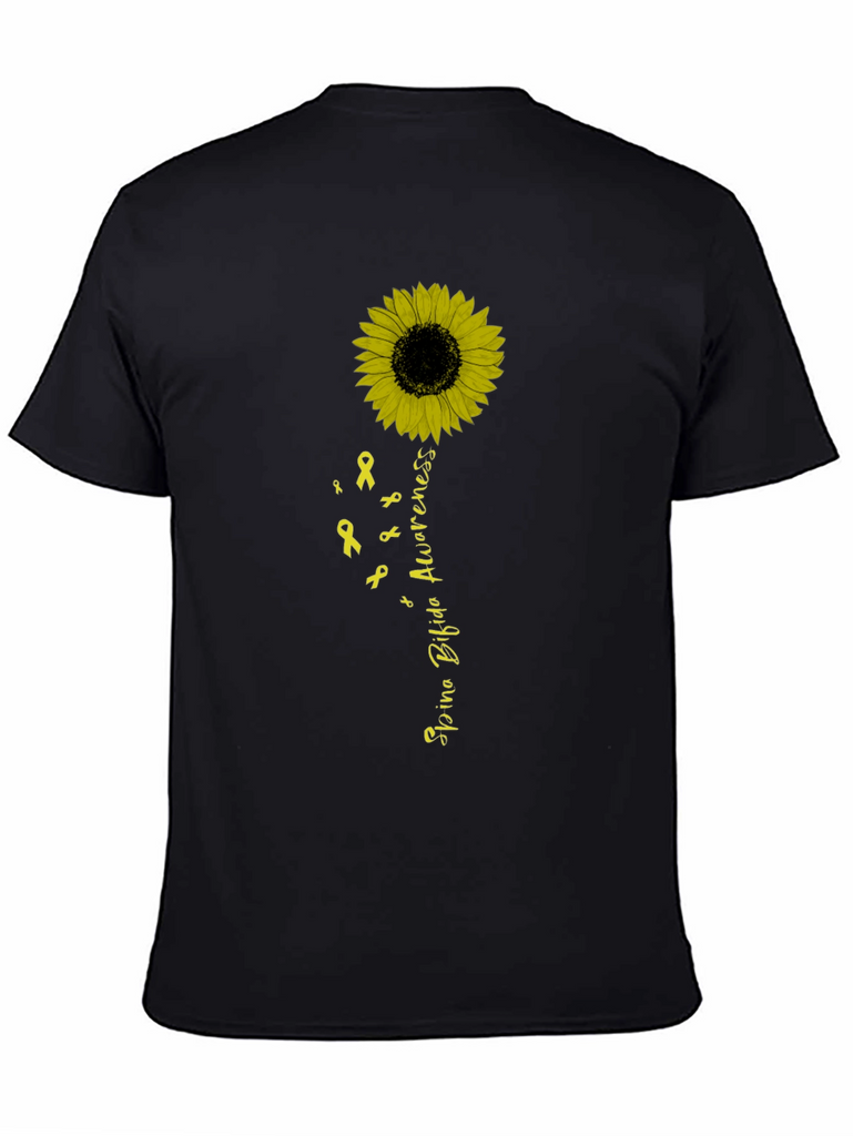 Show your support with this black t-shirt featuring a vibrant sunflower design. The sunflower is accompanied by Spina Bifida awareness ribbons and the words 'Spina Bifida Awareness' in a flowing script. Made from a comfortable, breathable fabric, this t-shirt is perfect for everyday wear and raising awareness for a worthy cause. Wear it to support loved ones, participate in awareness events, or simply show your solidarity. A meaningful and stylish way to make a difference. It is also suitable for casual wear.