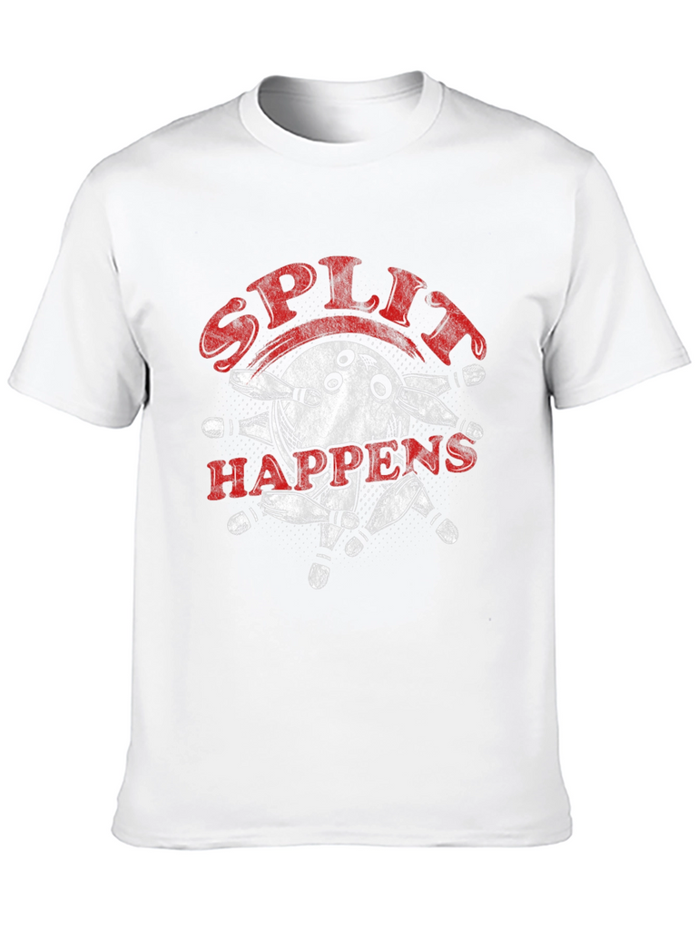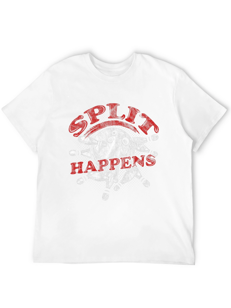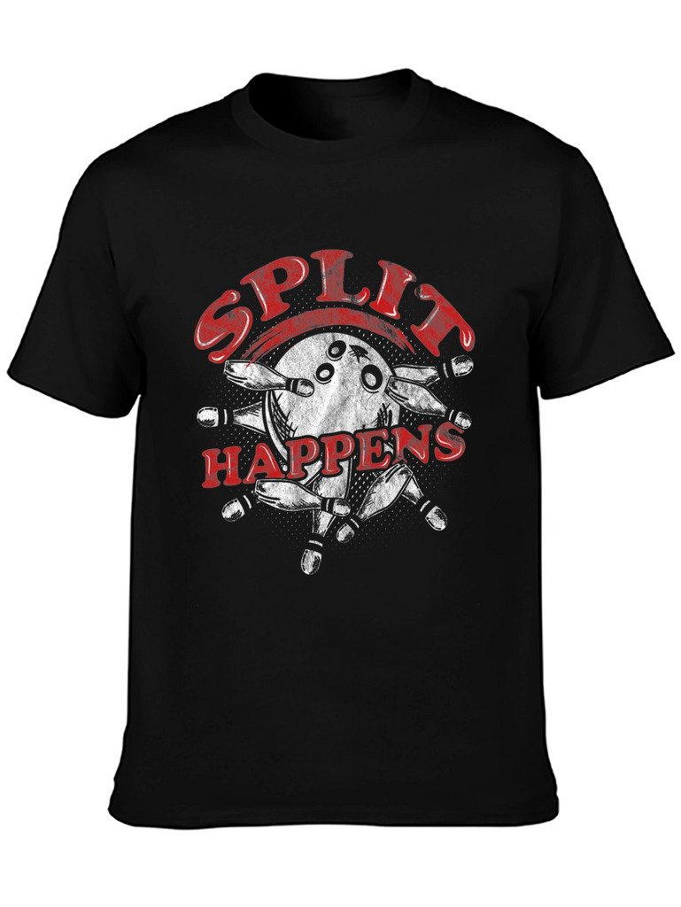 Rock this awesome black tee featuring a cool bowling design! The graphic showcases a bowling ball in action, scattering pins, with the catchy phrase 'Split Happens' in a bold, distressed font. Made from what appears to be a soft, comfortable cotton blend, this shirt is perfect for bowling enthusiasts, casual outings, or just lounging around. Show off your love for the game with this unique and stylish piece. A must-have for any bowler's wardrobe!