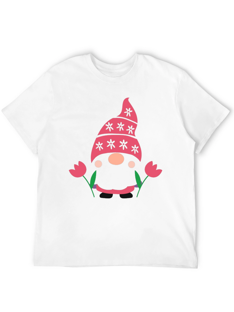 Embrace the spring season with this charming black t-shirt featuring an adorable gnome graphic. The gnome wears a pink hat adorned with floral designs and is accompanied by pink tulip flowers. Made from a comfortable, breathable fabric, this t-shirt is perfect for casual wear. The vibrant colors of the print pop against the classic black backdrop, making it a standout piece in any wardrobe. Show off your love for springtime cheer with this unique and stylish tee. Ideal for everyday wear, garden parties, or simply spreading joy, this gnome t-shirt is sure to be a conversation starter. It's a fun, whimsical addition to any outfit.