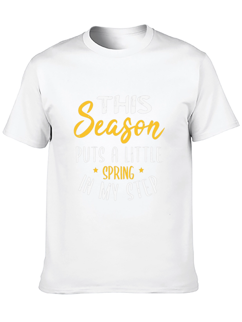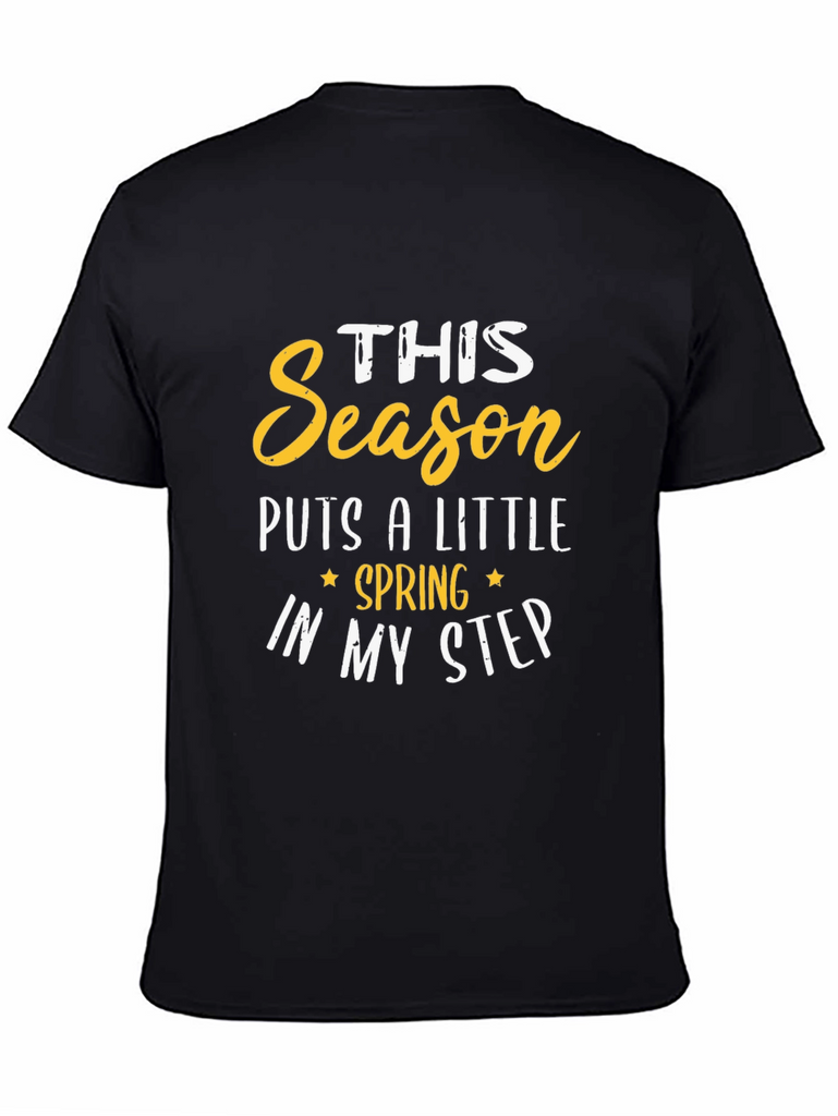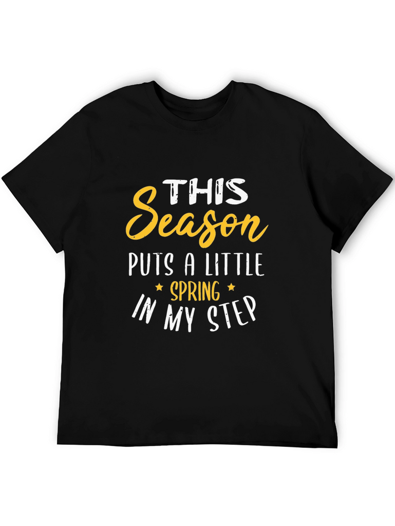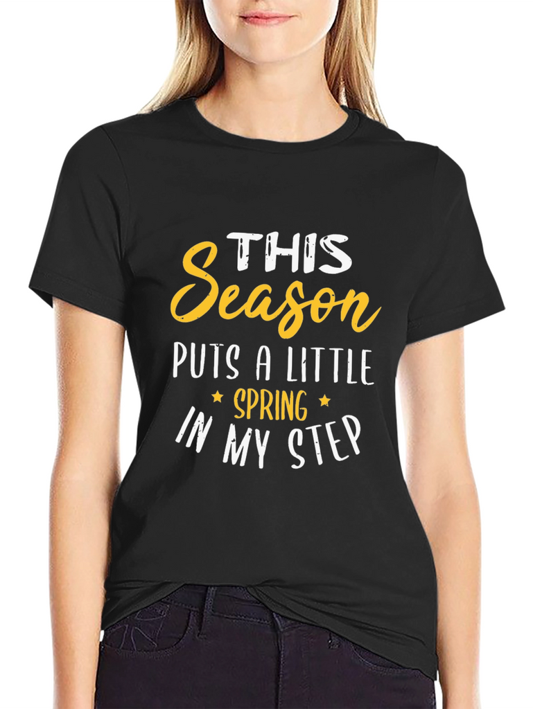 Elevate your casual wear with this stylish black t-shirt. Featuring a playful graphic design, it showcases the phrase "THIS Season PUTS A LITTLE SPRING IN MY STEP" in a mix of white and golden-yellow fonts. This tee is crafted from what appears to be soft, breathable cotton, ensuring a comfortable fit for everyday wear. Perfect for adding a touch of personality to your wardrobe, this t-shirt is ideal for springtime outings, relaxed weekends, or simply expressing your positive vibes. A great conversation starter, it's sure to bring a smile to those around you!