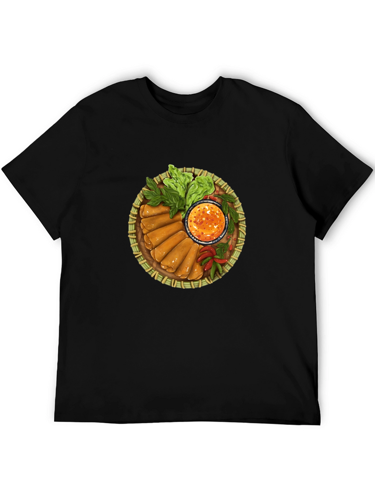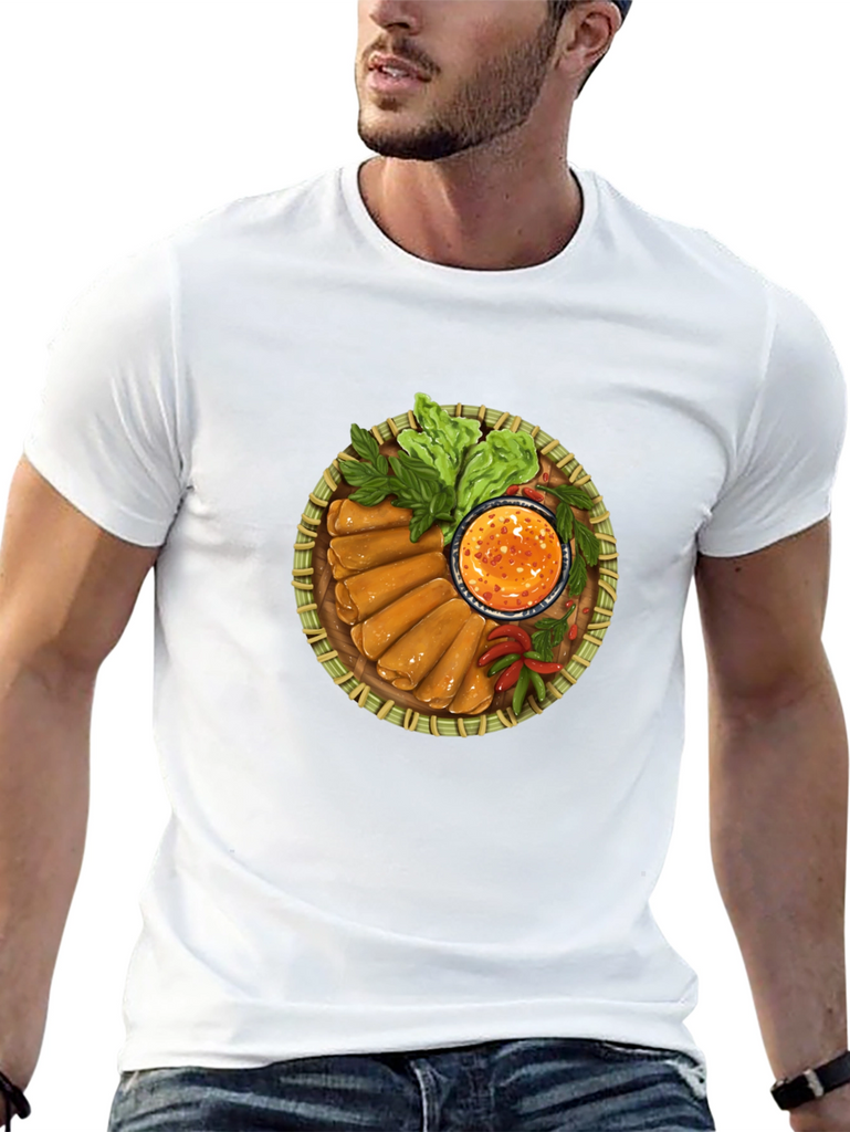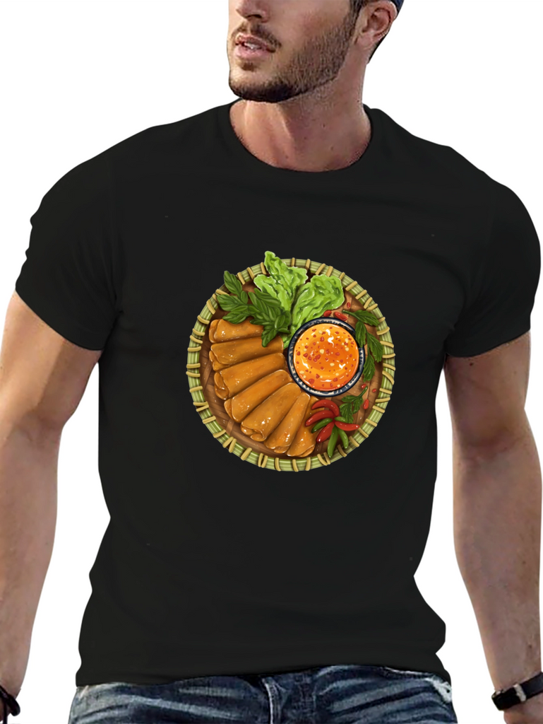 Showcase your love for delicious Asian cuisine with this unique spring rolls t-shirt. The shirt features a vibrant, detailed print of a bamboo platter filled with crispy spring rolls, fresh lettuce, and a spicy dipping sauce. The design is eye-catching and perfect for foodies and anyone who enjoys a touch of culinary art in their wardrobe. Made from comfortable, breathable fabric, this tee is ideal for everyday wear, casual outings, or as a fun conversation starter at your next food-themed event. Add some flavor to your style with this one-of-a-kind shirt!