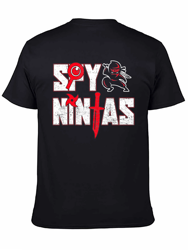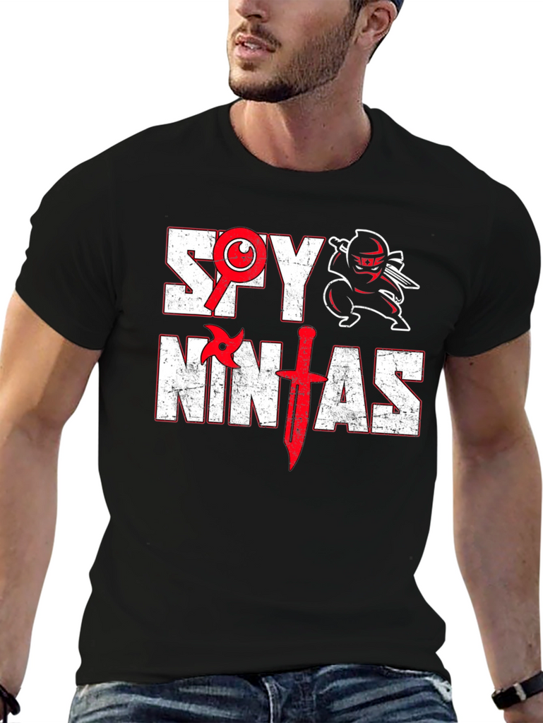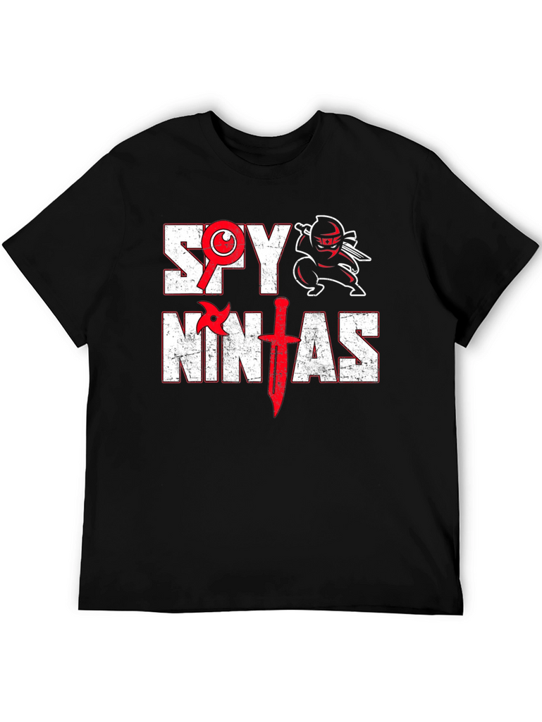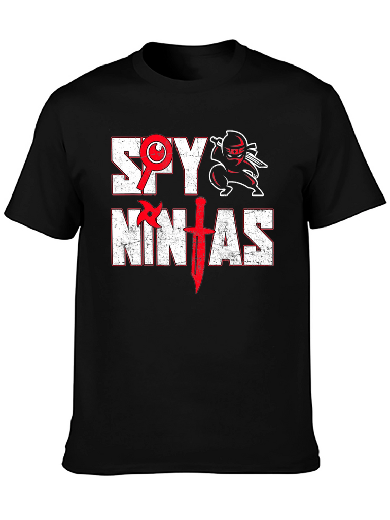Show off your love for the Spy Ninjas with this stylish black T-shirt. The tee features a bold and eye-catching graphic design with the phrase "SPY NINJAS" in a distressed white font, accented with red spy-themed elements. These details include a spyglass, ninja star, and sword. Made from a comfortable fabric blend, this short-sleeve shirt is perfect for casual wear, school, or hanging out with friends. A must-have for any Spy Ninjas fan, this T-shirt makes a great gift or a fun addition to your own wardrobe.