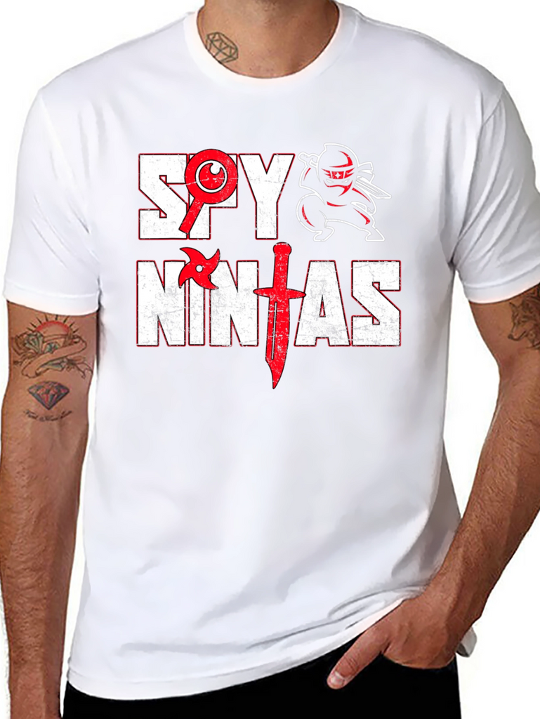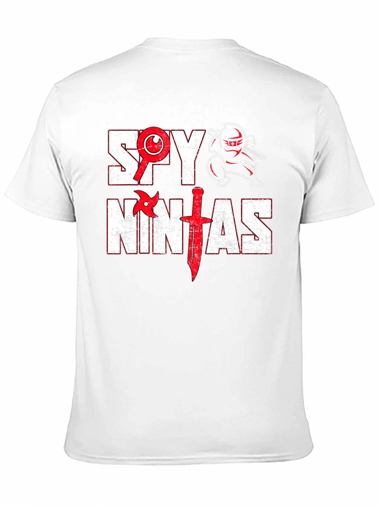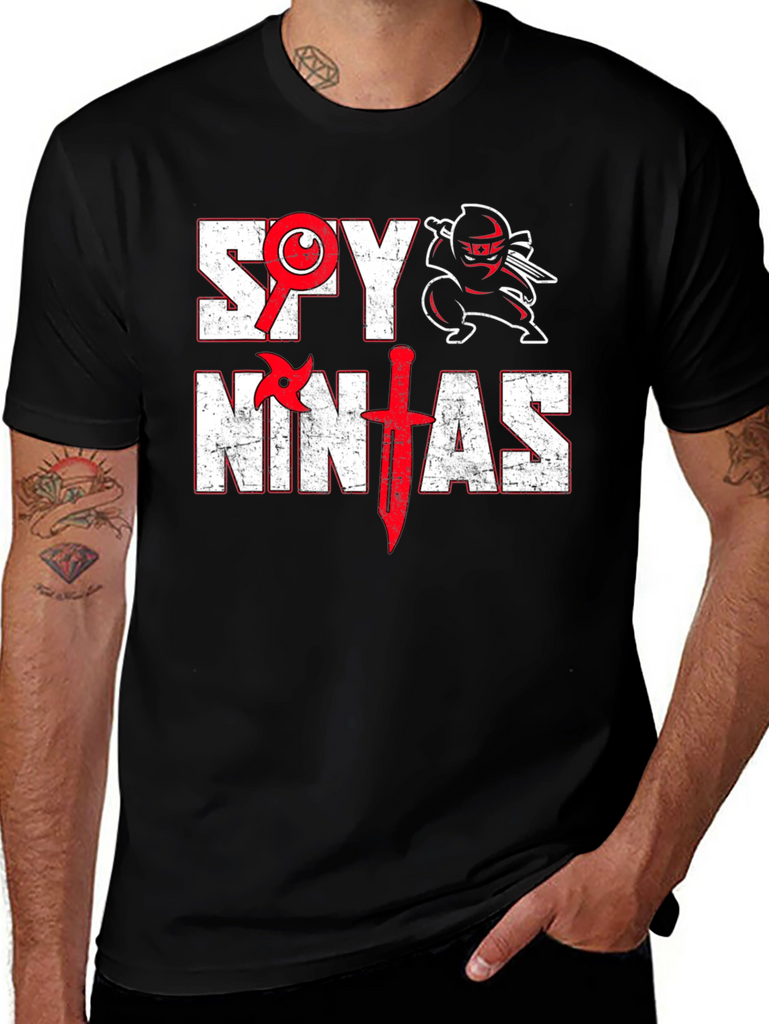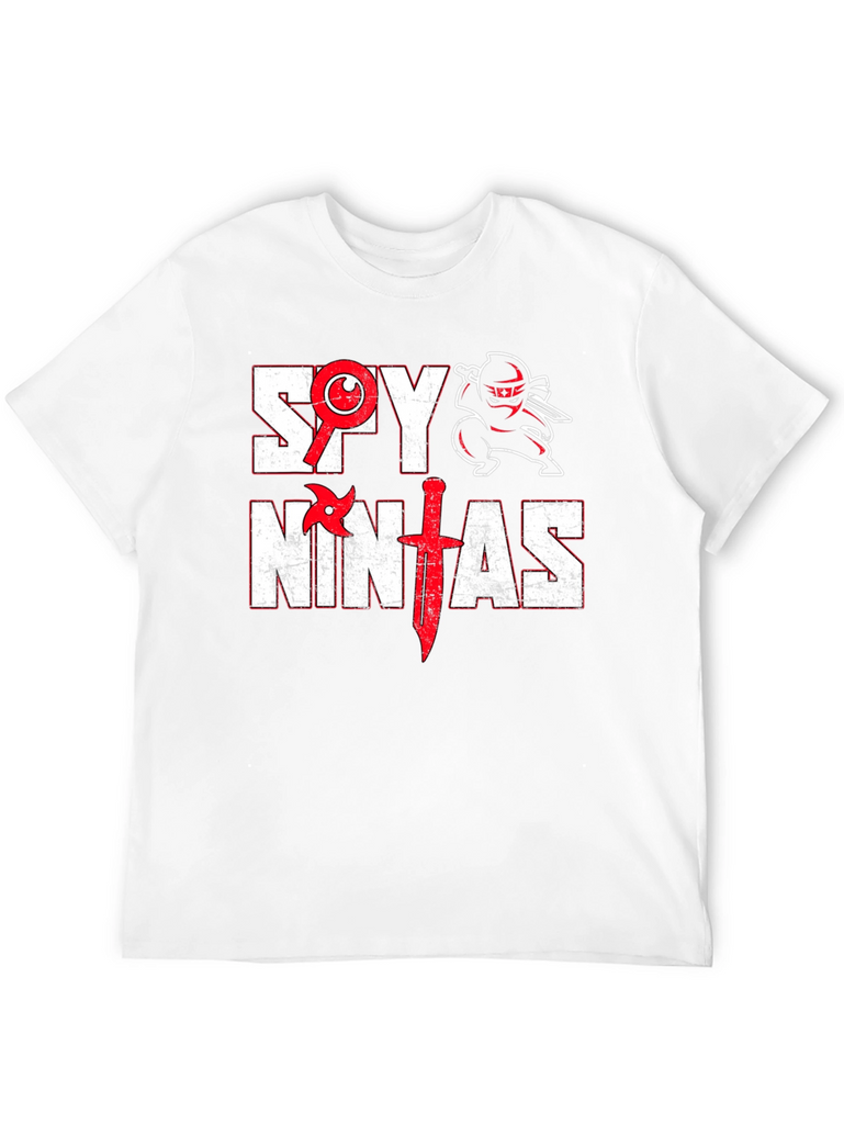 Show off your love for the Spy Ninjas with this stylish black T-shirt. The tee features a bold and eye-catching graphic design with the phrase "SPY NINJAS" in a distressed white font, accented with red spy-themed elements. These details include a spyglass, ninja star, and sword. Made from a comfortable fabric blend, this short-sleeve shirt is perfect for casual wear, school, or hanging out with friends. A must-have for any Spy Ninjas fan, this T-shirt makes a great gift or a fun addition to your own wardrobe.