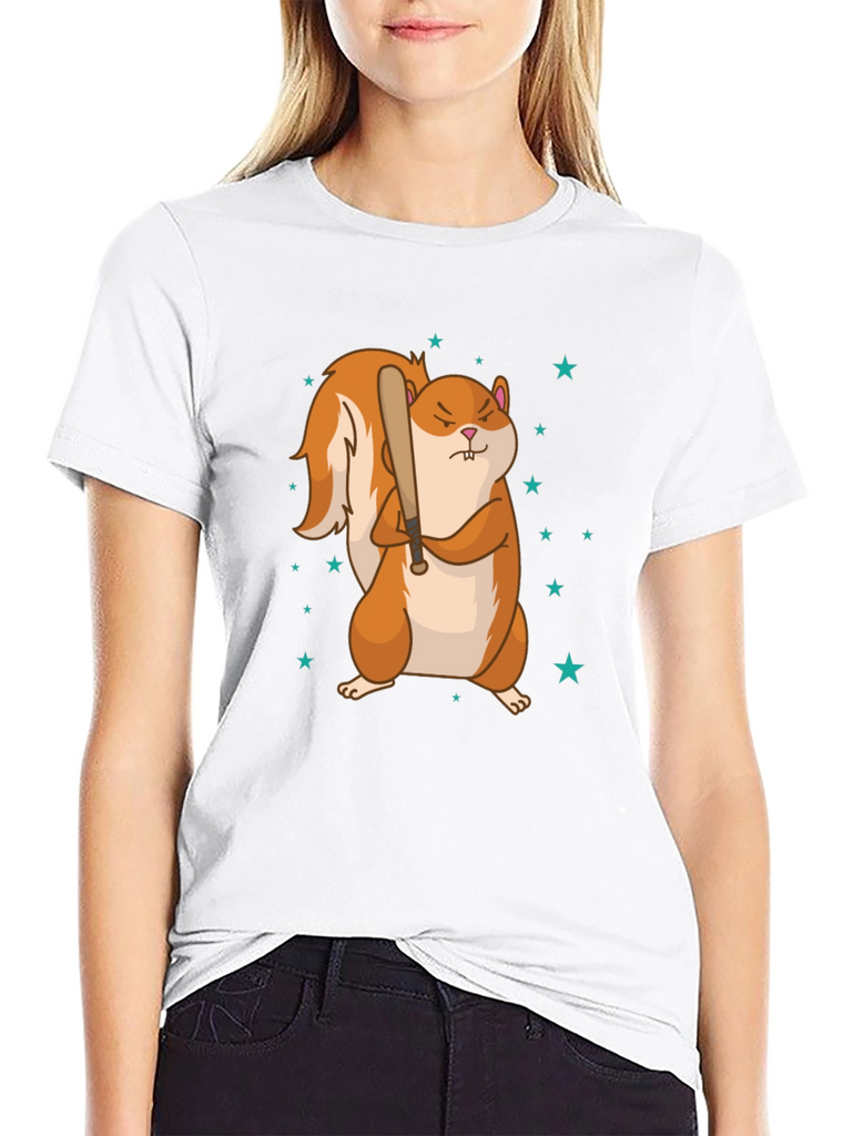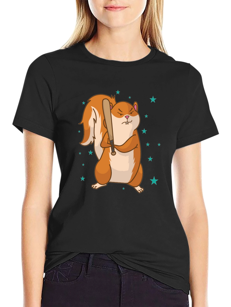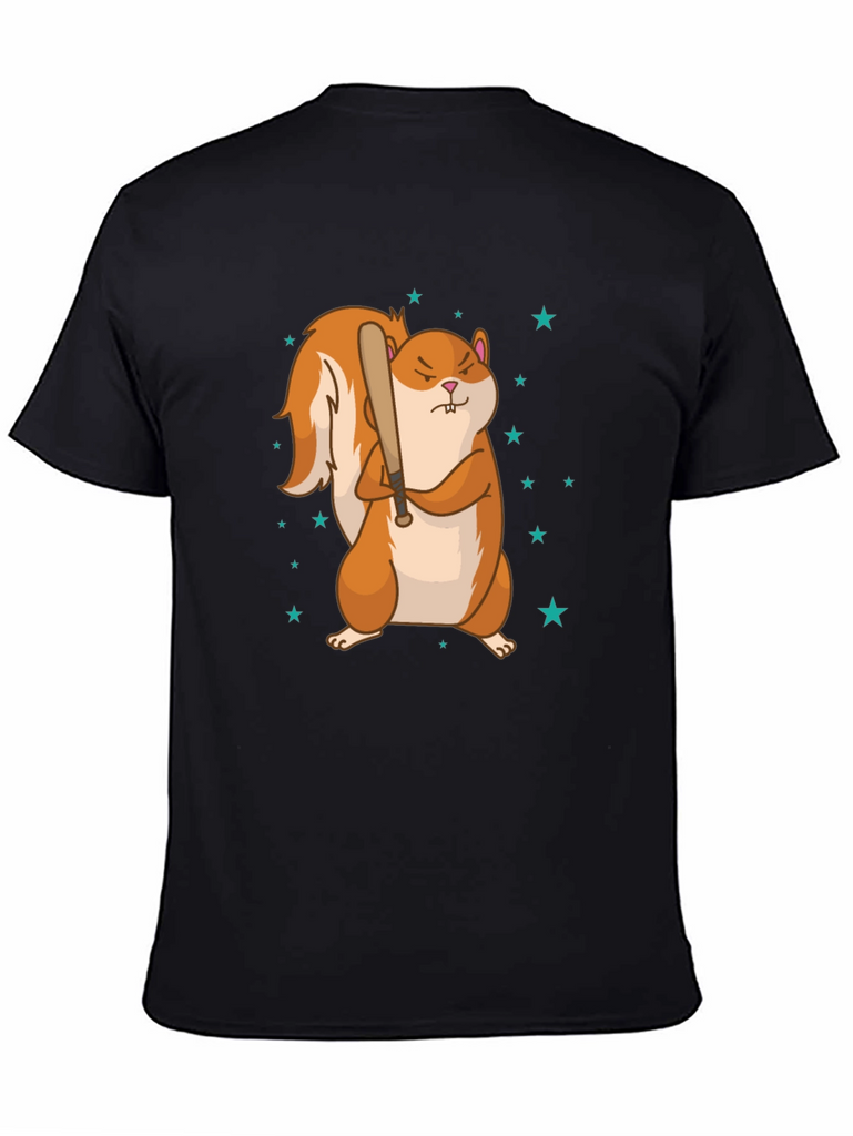 Showcase your unique style with this eye-catching graphic tee. This black t-shirt features a cartoon squirrel holding a baseball bat surrounded by stars. The design is printed on a comfortable and durable fabric, ensuring long-lasting wear and vibrant colors. This tee is perfect for casual outings, sports events, or simply lounging around, the unique graphic makes a statement wherever you go. Express your love for animals with this fun and playful tee. Machine washable.