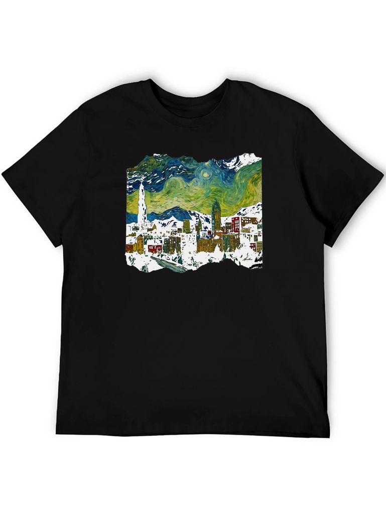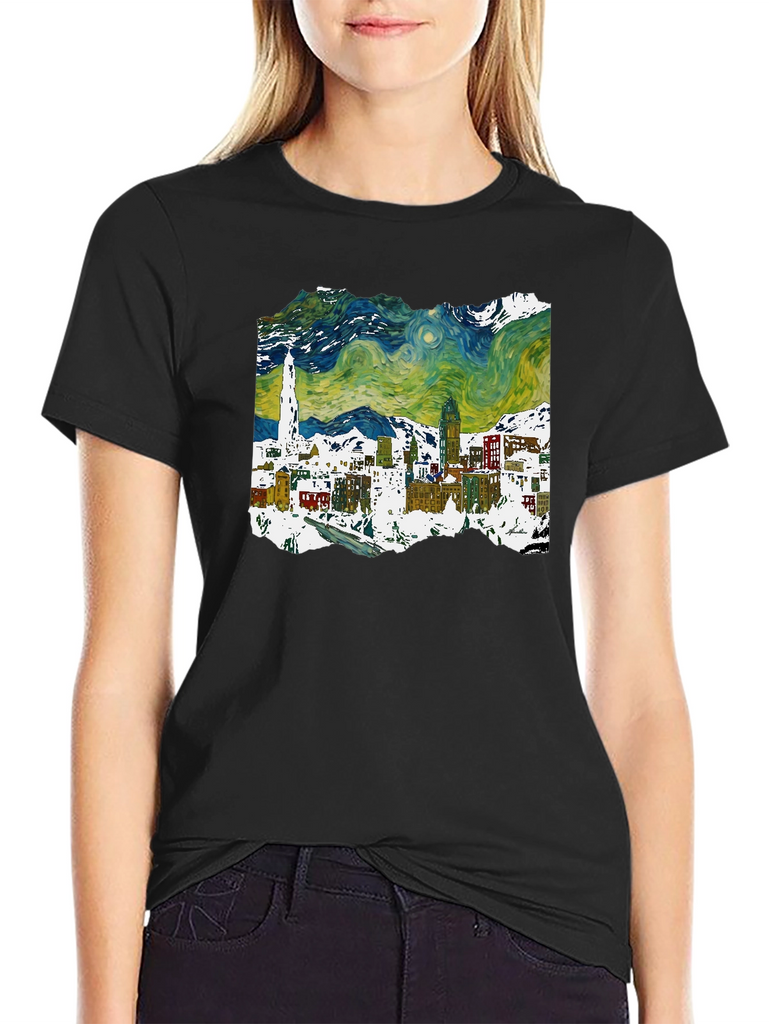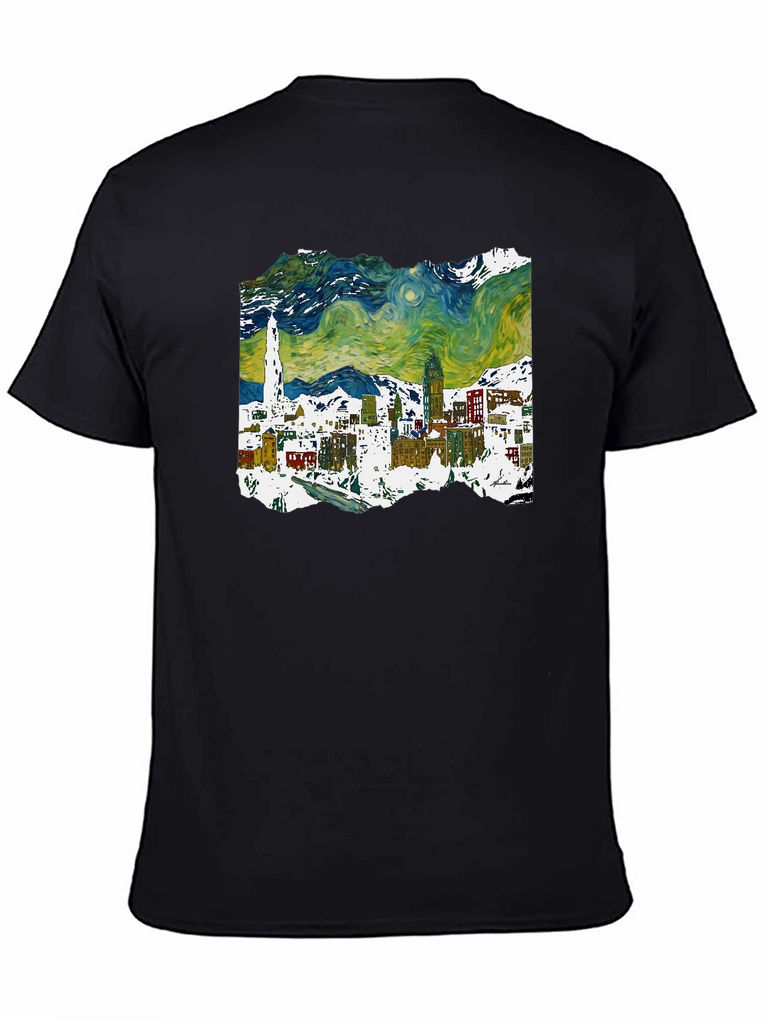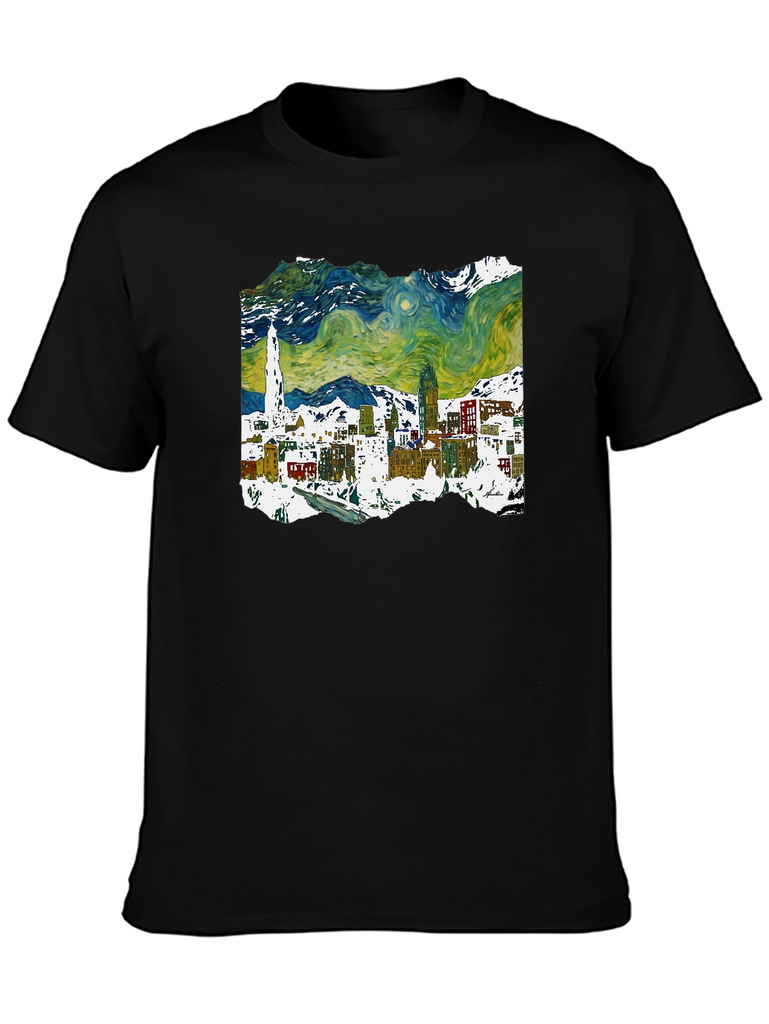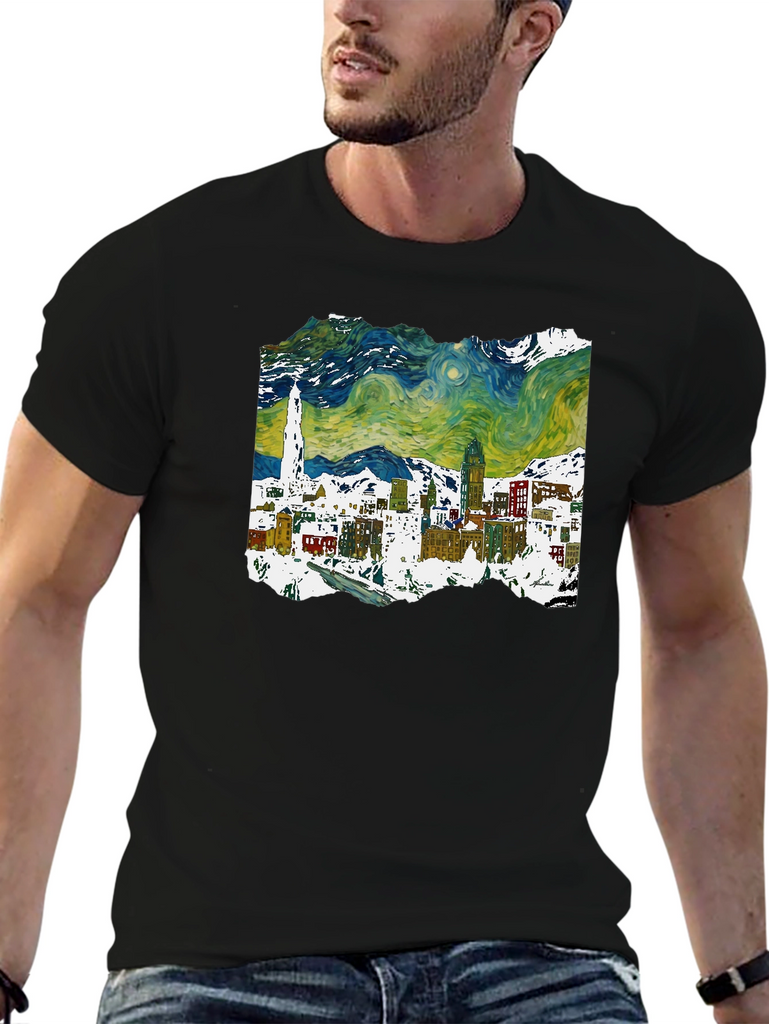 Show off your artistic side with this unique graphic tee! Featuring a stylized cityscape reminiscent of Van Gogh's "Starry Night," this black t-shirt offers a creative twist on a classic design. The print showcases swirling blues and yellows above a detailed urban landscape, making it a wearable piece of art. Made from a comfortable fabric, this tee is perfect for casual wear, art enthusiasts, or anyone looking to add a touch of originality to their wardrobe. Pair it with jeans for a relaxed look or dress it up with a blazer for an eye-catching ensemble. Express yourself with this wearable masterpiece!