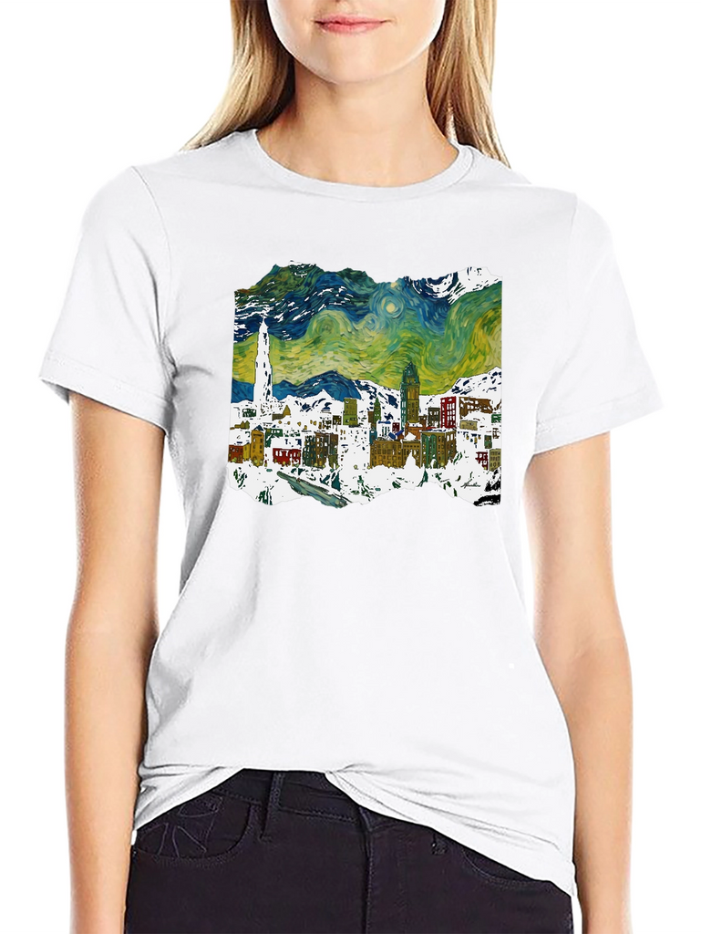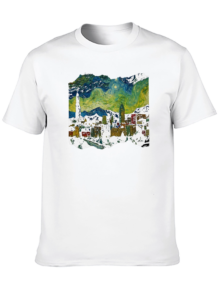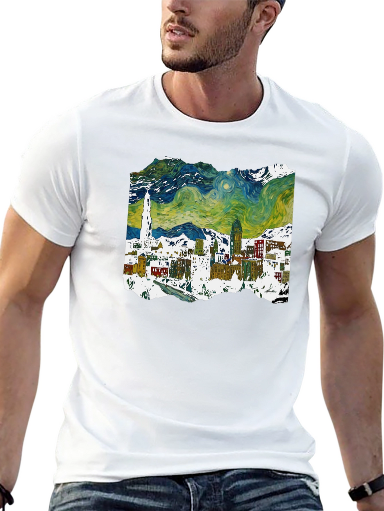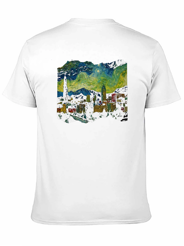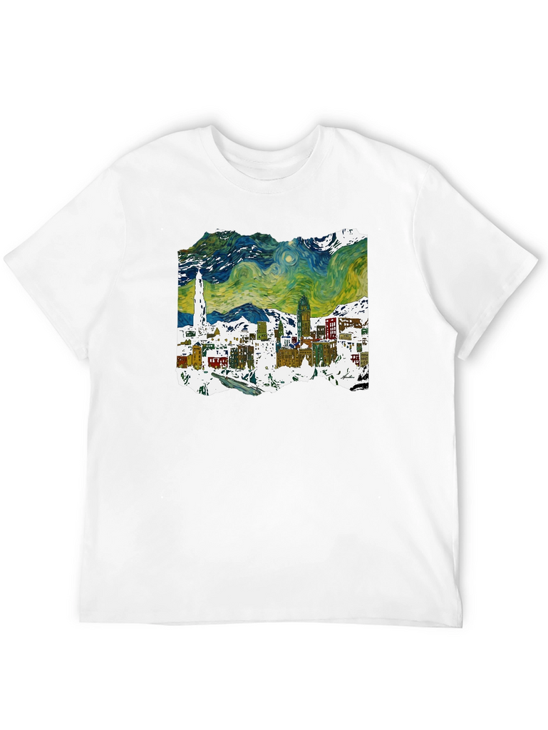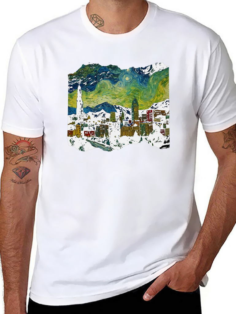 Show off your artistic side with this unique graphic tee! Featuring a stylized cityscape reminiscent of Van Gogh's "Starry Night," this black t-shirt offers a creative twist on a classic design. The print showcases swirling blues and yellows above a detailed urban landscape, making it a wearable piece of art. Made from a comfortable fabric, this tee is perfect for casual wear, art enthusiasts, or anyone looking to add a touch of originality to their wardrobe. Pair it with jeans for a relaxed look or dress it up with a blazer for an eye-catching ensemble. Express yourself with this wearable masterpiece!