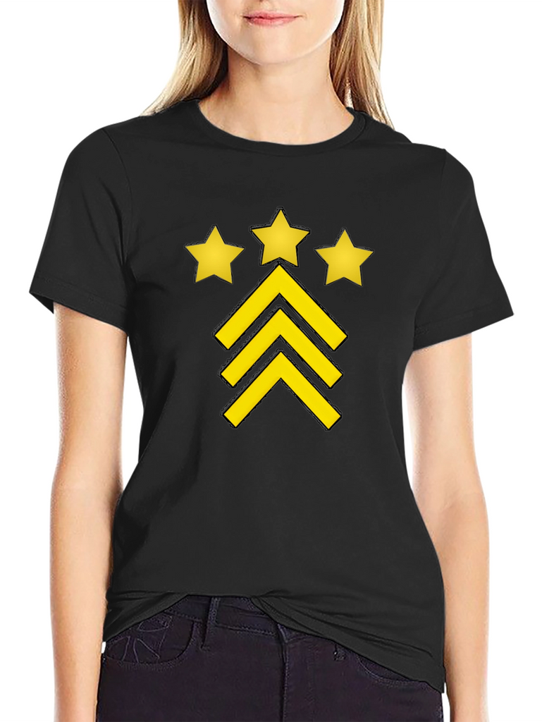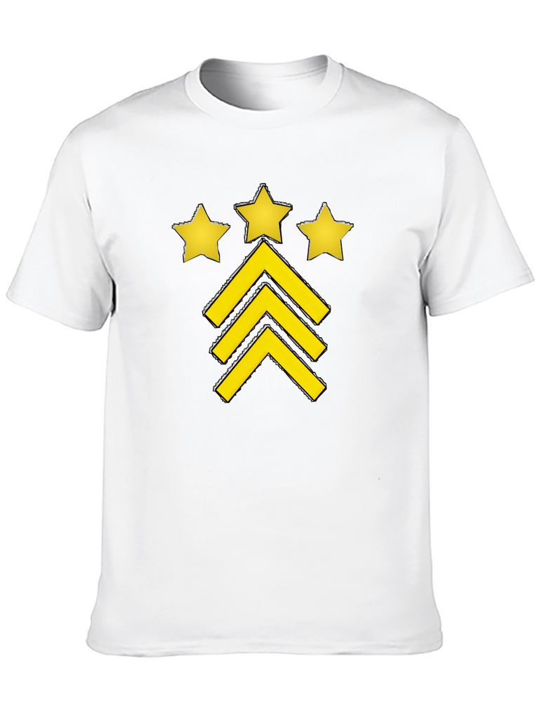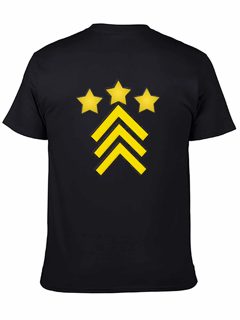 Show off your unique style with this bold black t-shirt. Featuring a striking graphic design of three gold stars above three gold chevron stripes, this shirt is sure to turn heads. Made from a comfortable, breathable fabric, it's perfect for everyday wear. Whether you're heading to a casual outing or just lounging at home, this tee offers both style and comfort. The classic fit makes it a versatile addition to any wardrobe. Make a statement with this trendy and eye-catching design.