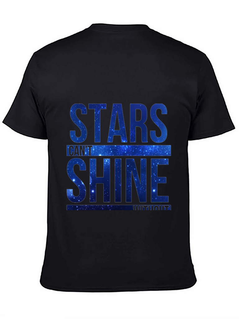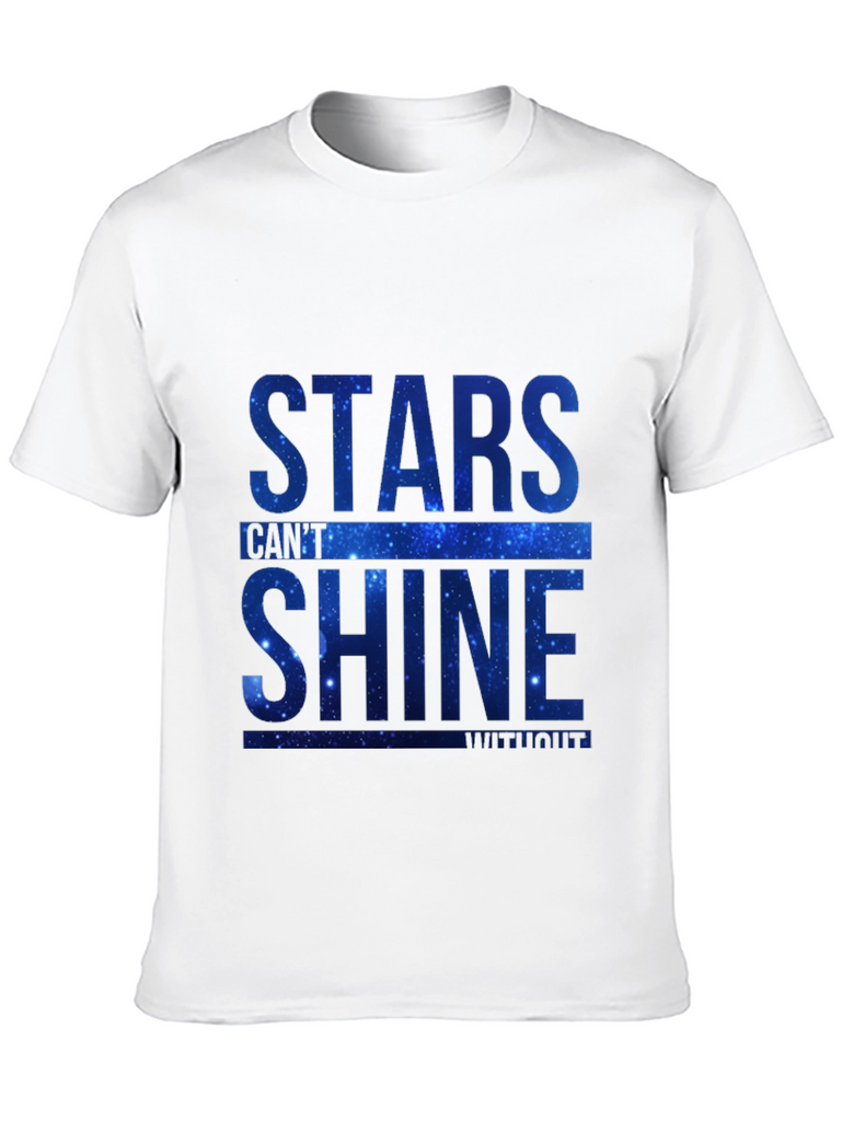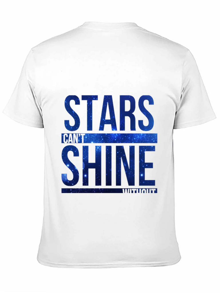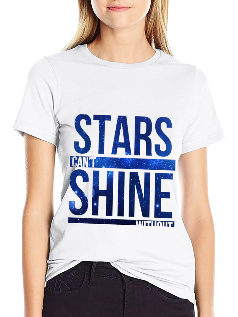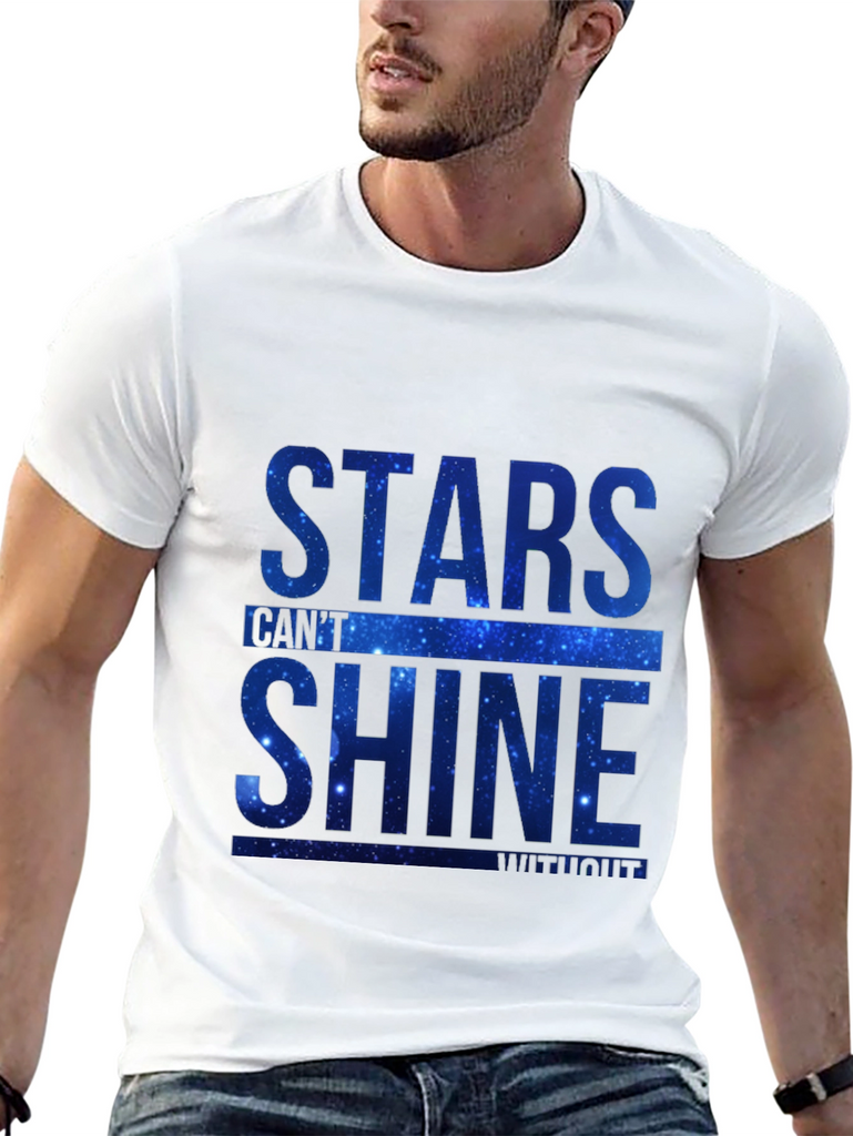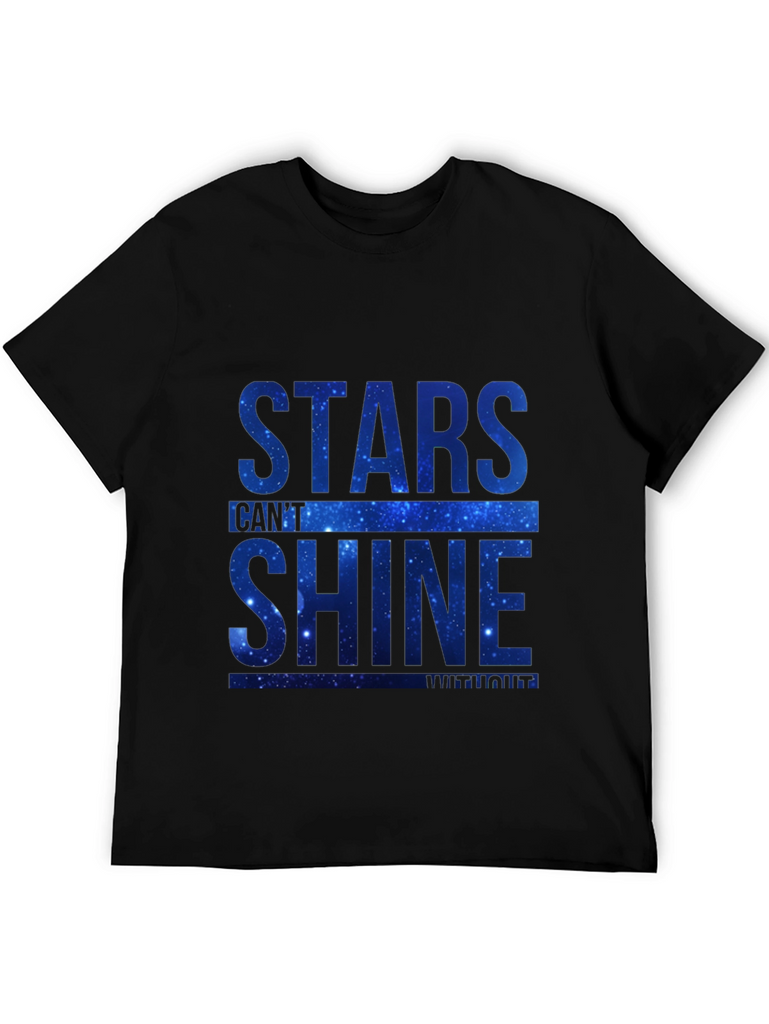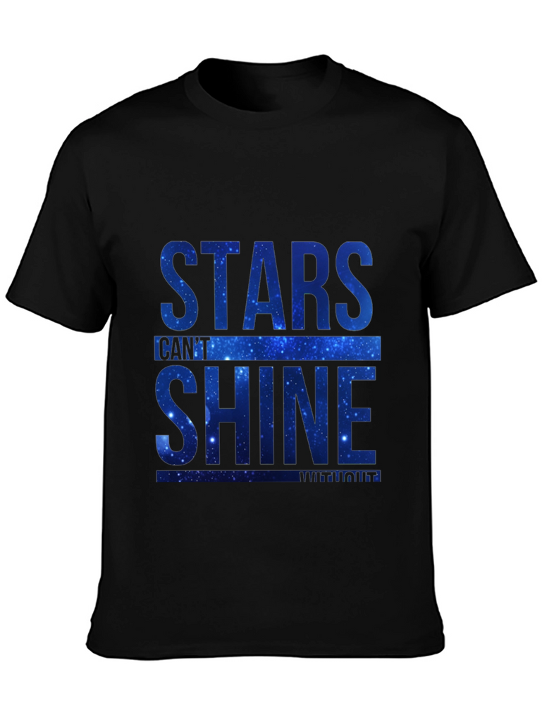 Show off your stellar style with this eye-catching graphic tee. The design features the phrase "Stars Can't Shine Without..." rendered in a bright blue, galaxy-like font. The shirt is made of a soft, comfortable black fabric that feels great against the skin. It's a classic crewneck style with short sleeves that can be dressed up or down. Perfect for everyday wear, casual outings, or expressing your unique personality. Stand out from the crowd with this must-have piece!