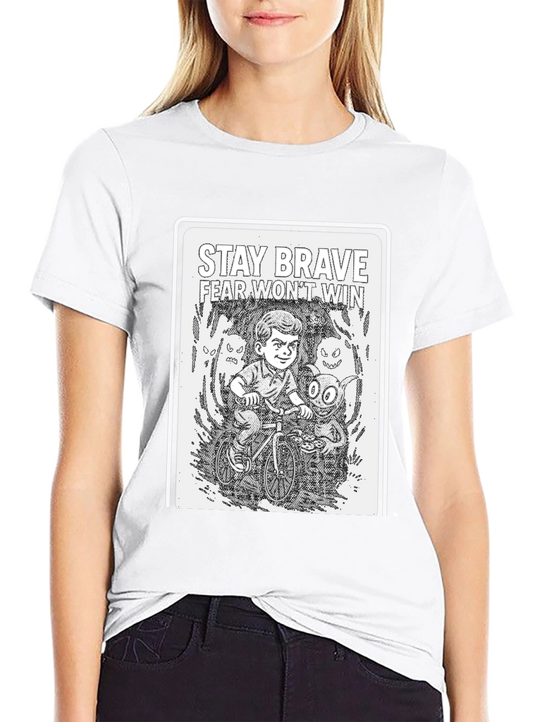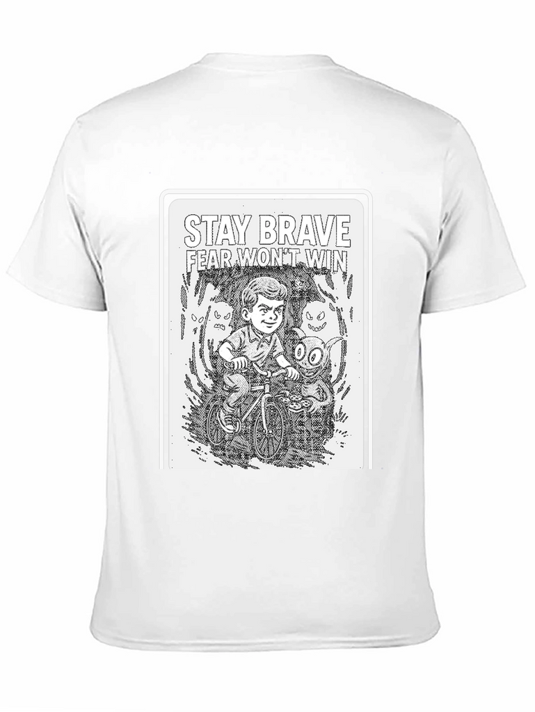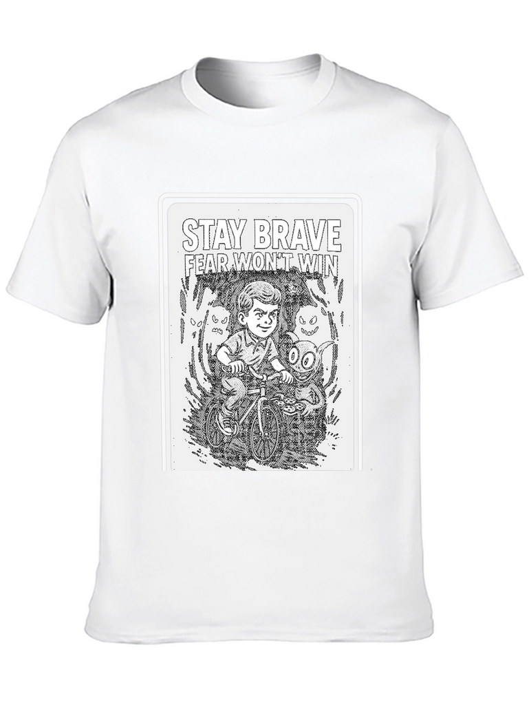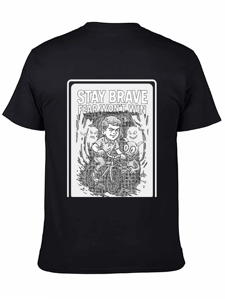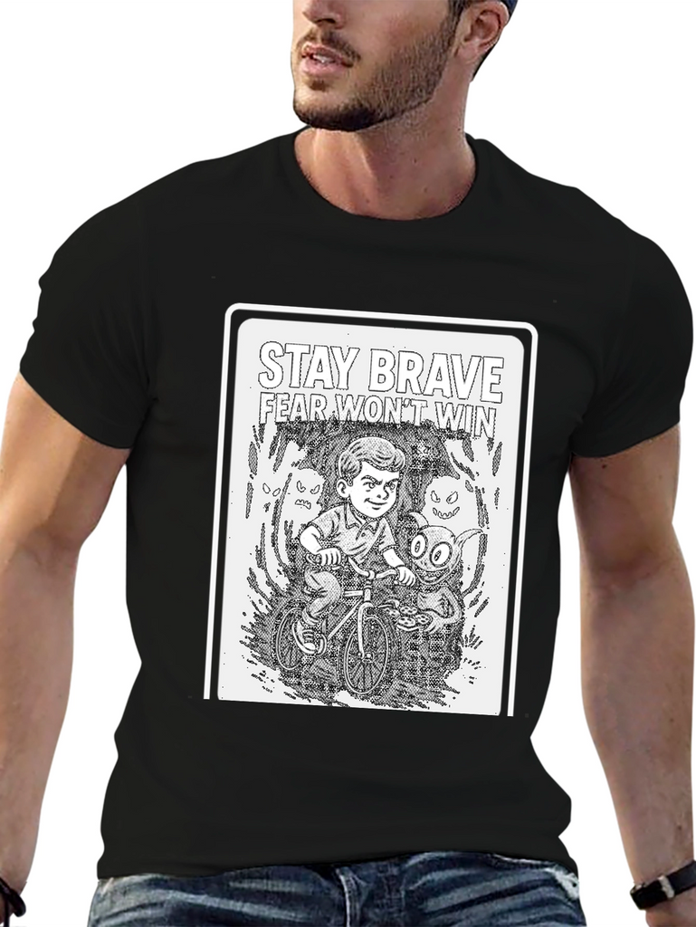 This classic black t-shirt features a unique graphic print on the front. The design includes a boy riding a bicycle with the words "Stay Brave, Fear Won't Win" above him, surrounded by cartoonish ghosts and an eerie forest-like background. Made from a comfortable material, this short-sleeved tee is perfect for everyday wear. The clean design makes it suitable for various casual occasions. The monochrome graphic stands out against the black backdrop, making it an eye-catching piece. Add a touch of bravery and humor to your wardrobe with this one-of-a-kind tee.