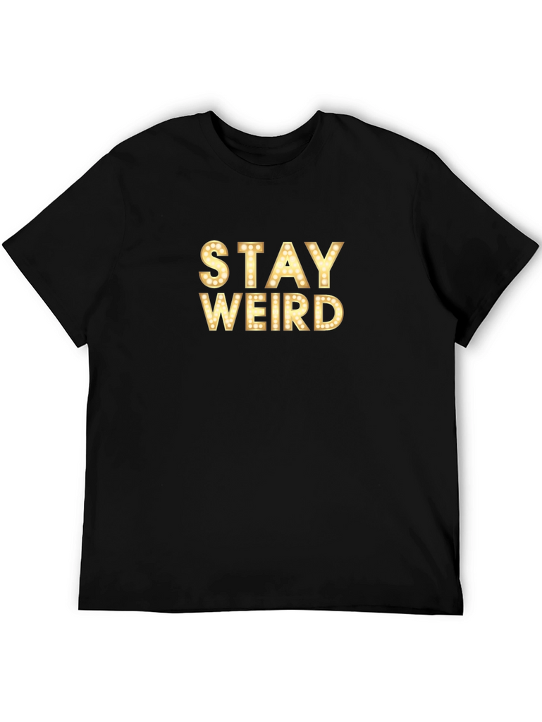 Show your quirky side with this 'Stay Weird' graphic tee. The shirt features a bold, eye-catching design with retro lightbulb-style lettering. Made from a comfortable material, it's perfect for casual wear and making a statement. This black t-shirt pairs effortlessly with jeans, shorts, or a skirt. Ideal for expressing your unique personality and adding a touch of fun to your everyday outfits. Grab yours now and embrace your individuality! A great shirt for both men and women.